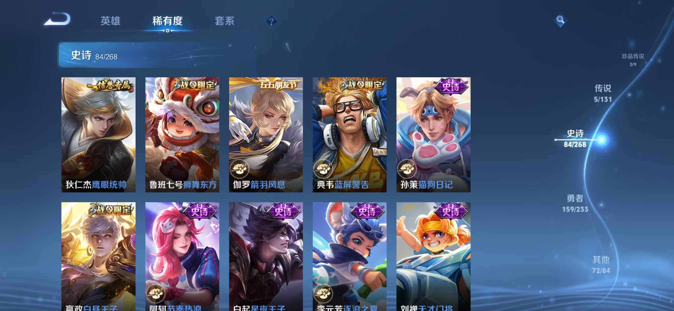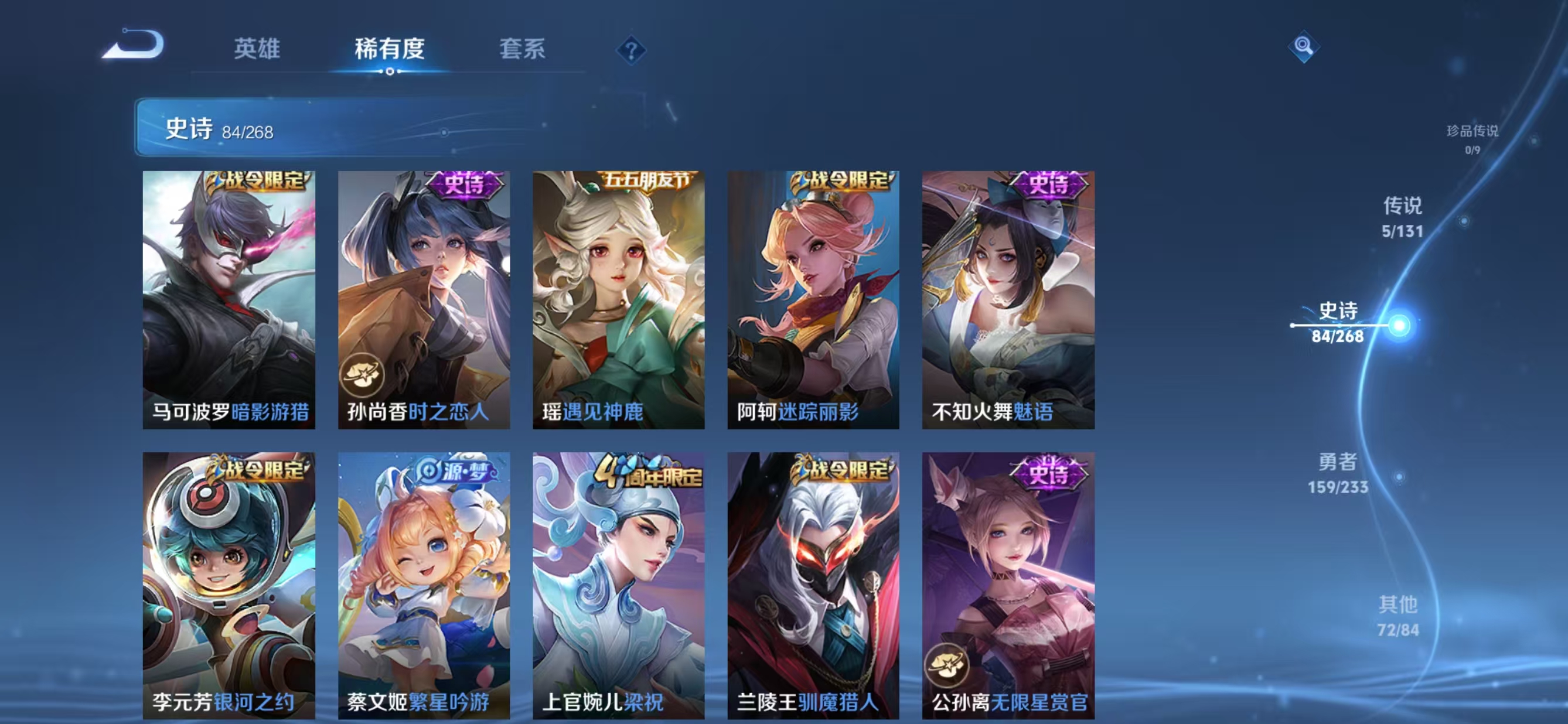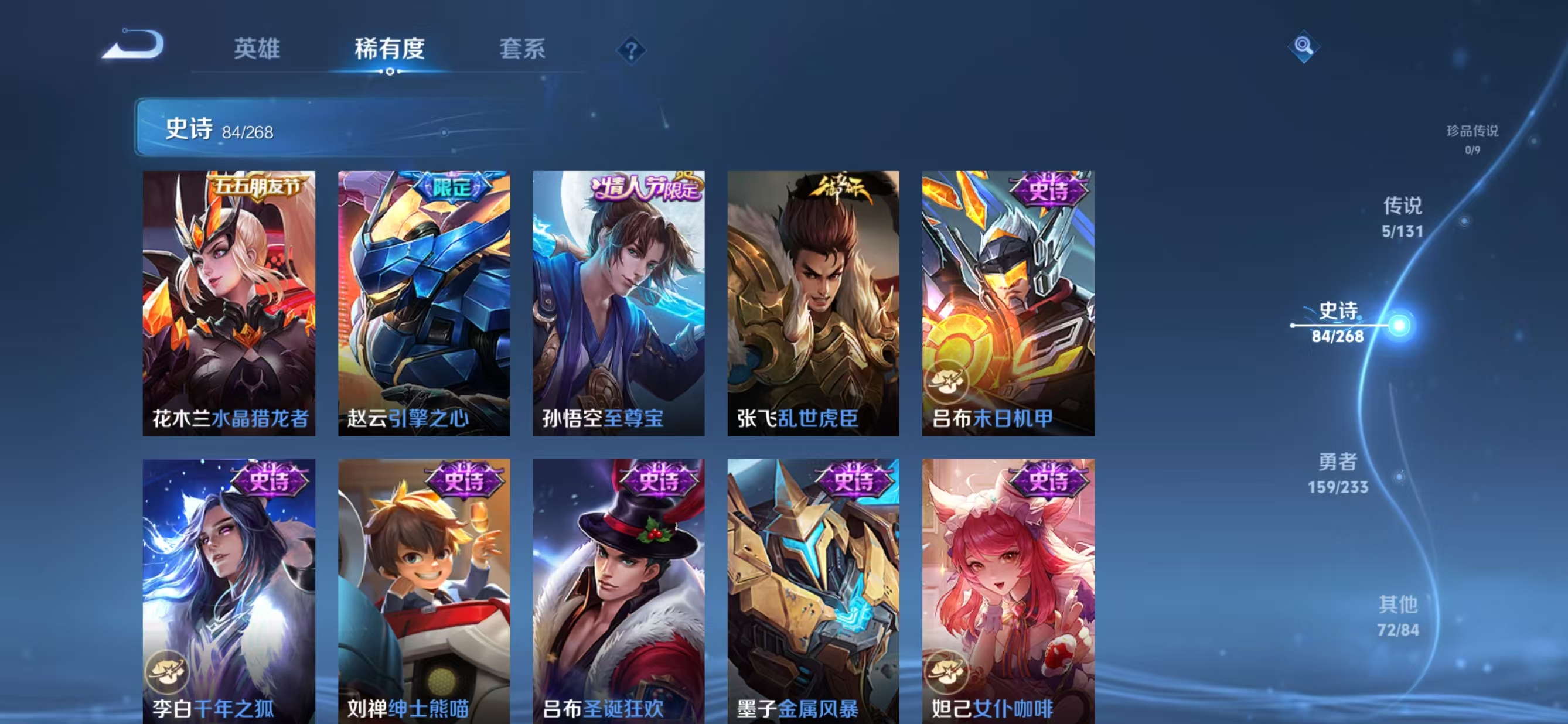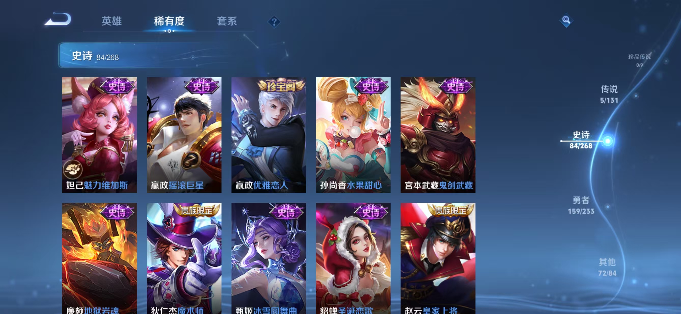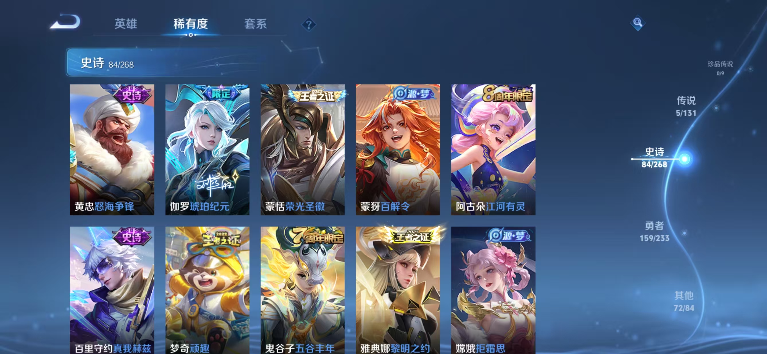 贵族等级:v7皮肤数:321情人节限定2 传说品质5 荣耀典藏1 英雄数:128