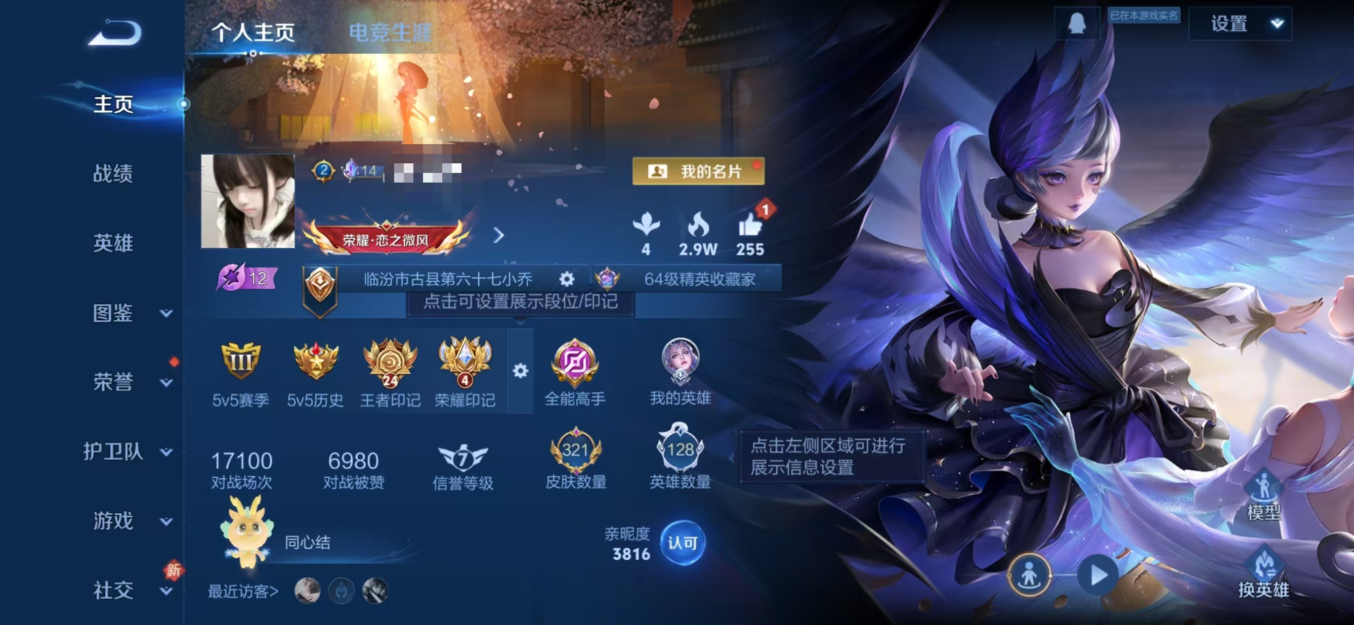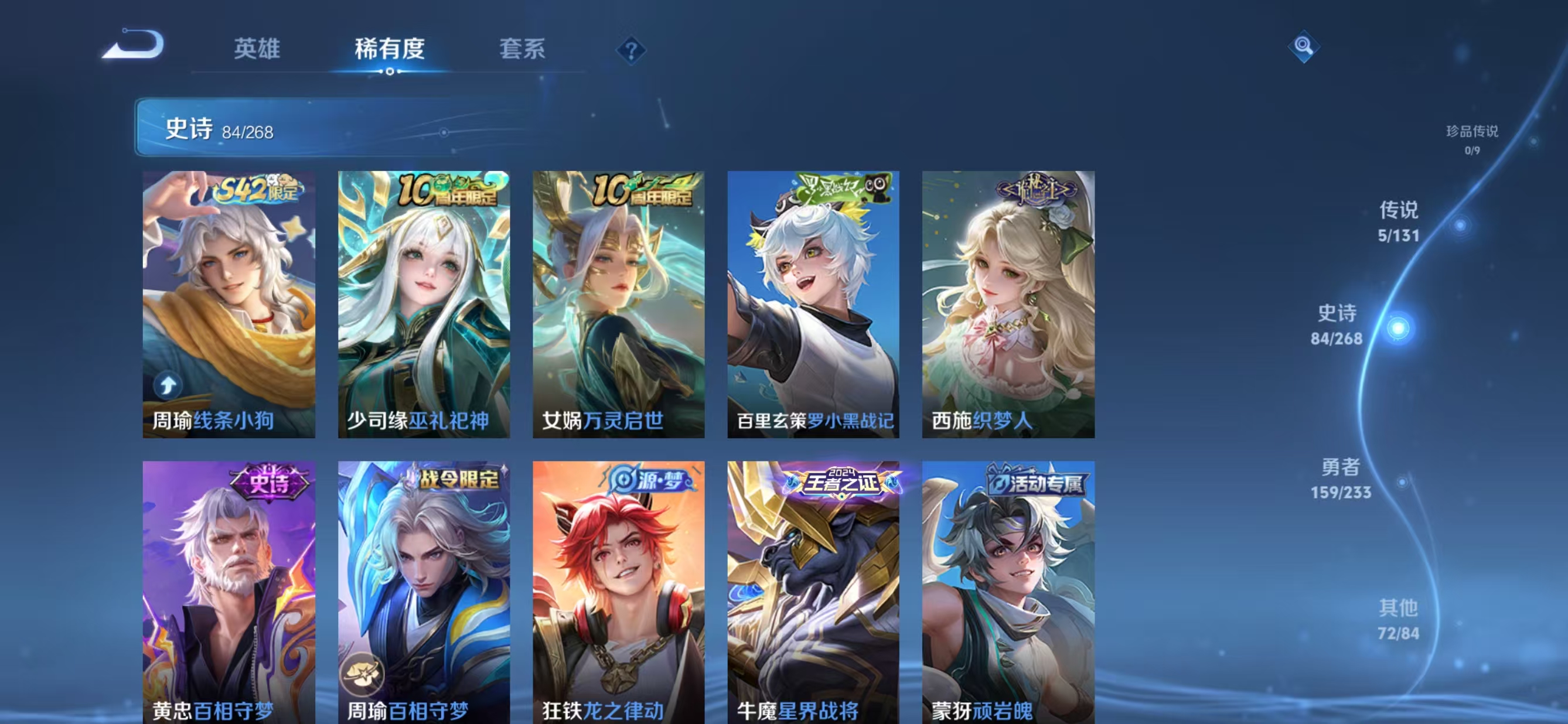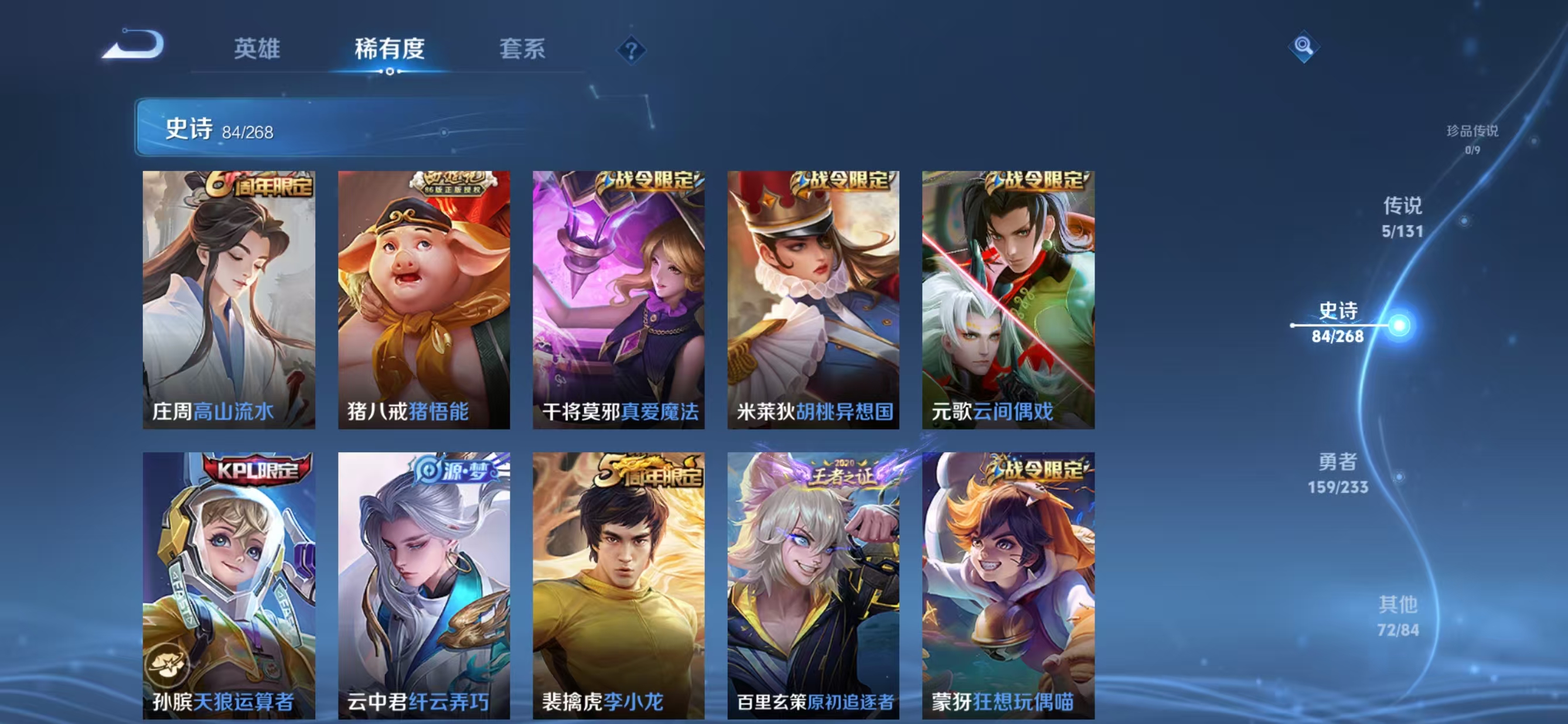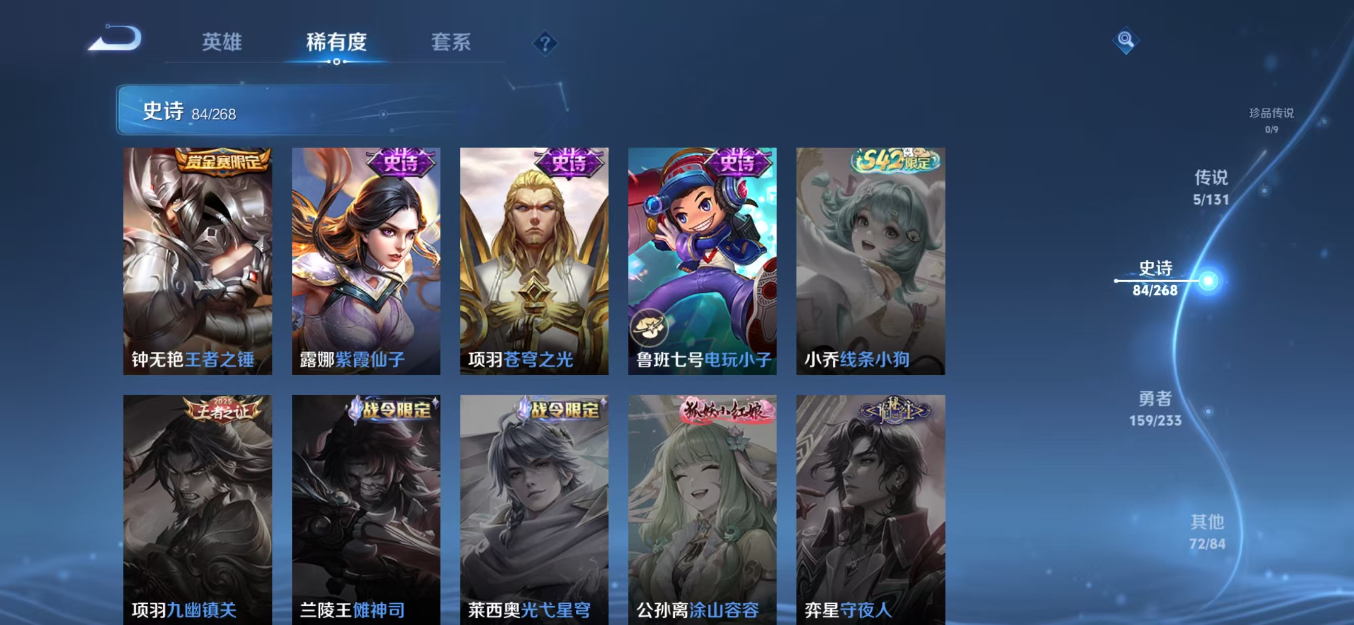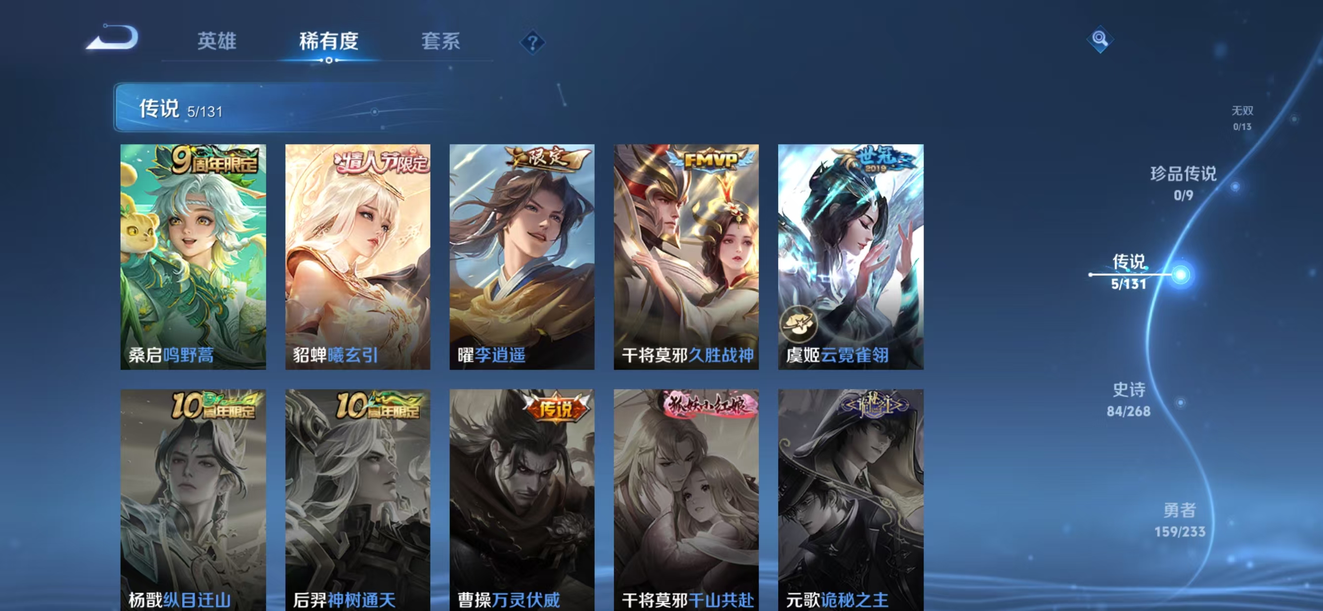 贵族等级:v7皮肤数:321情人节限定2 传说品质5 荣耀典藏1 英雄数:128