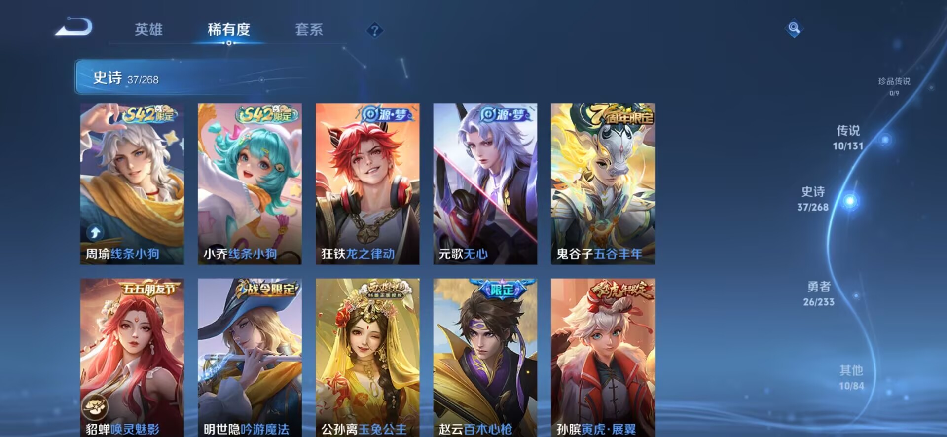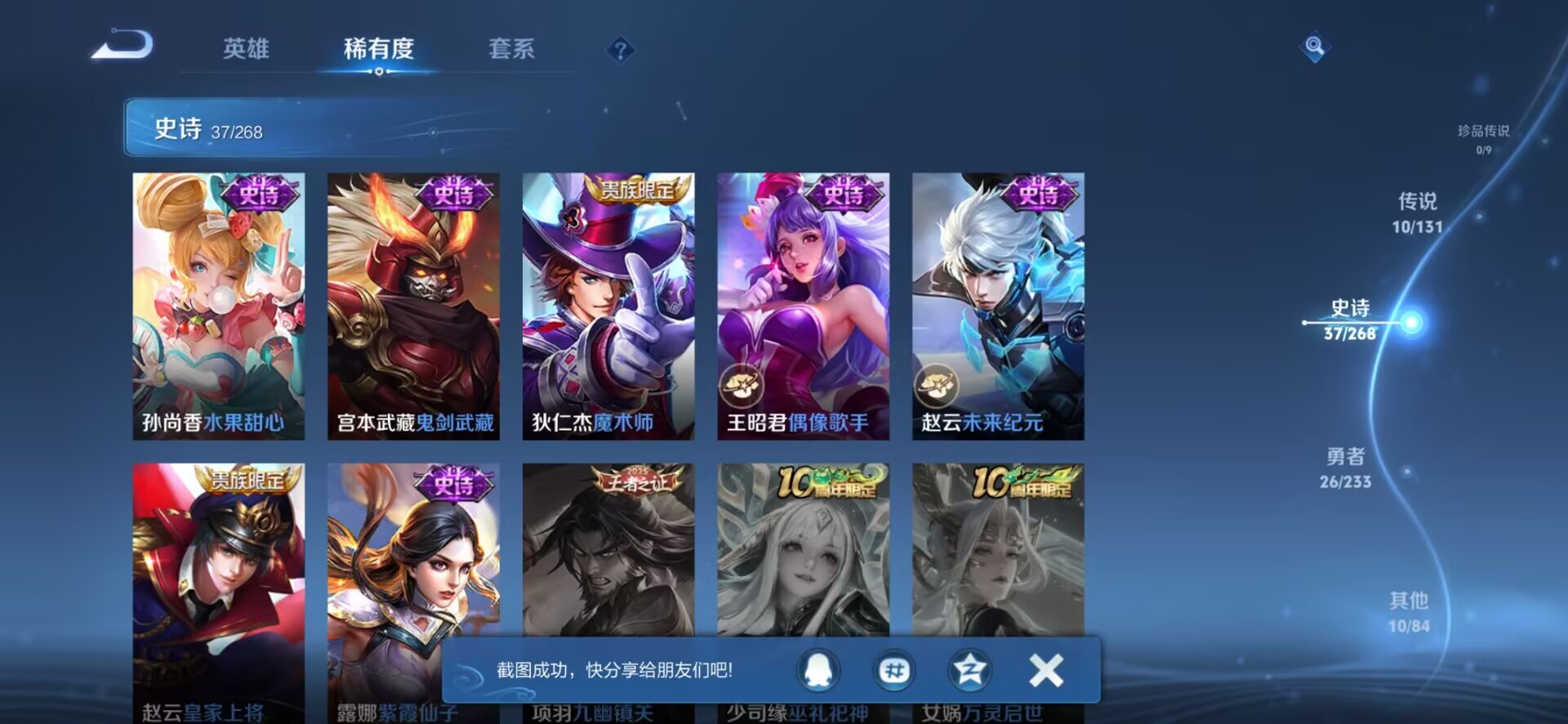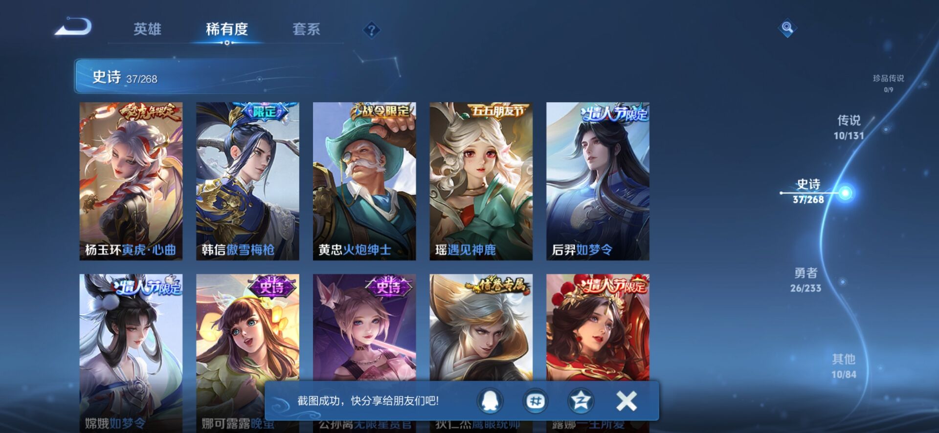 贵族等级:v7皮肤数:83情人节限定4 传说品质10 生肖限定4 英雄数:94