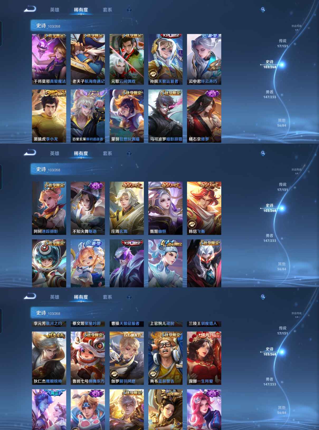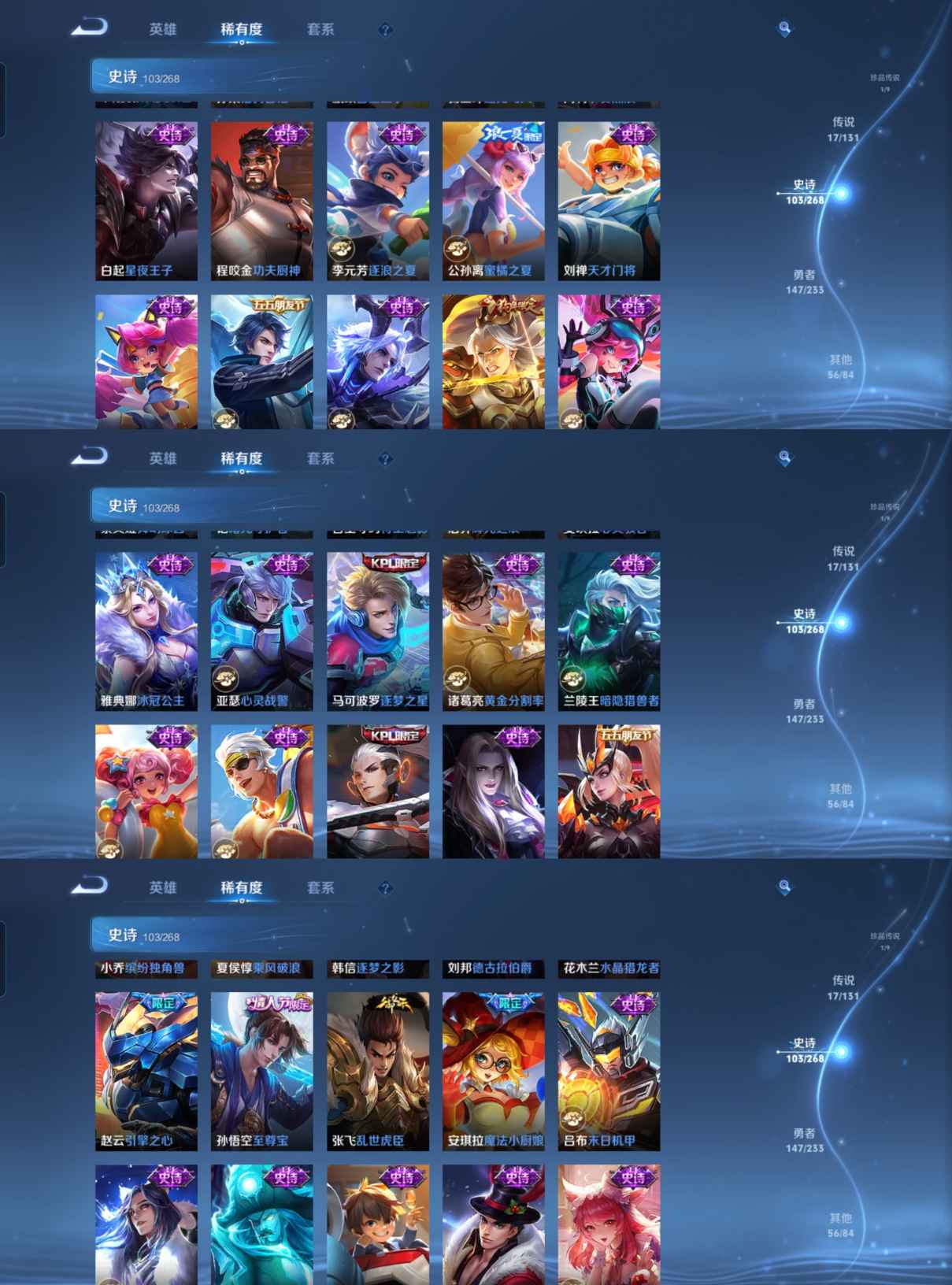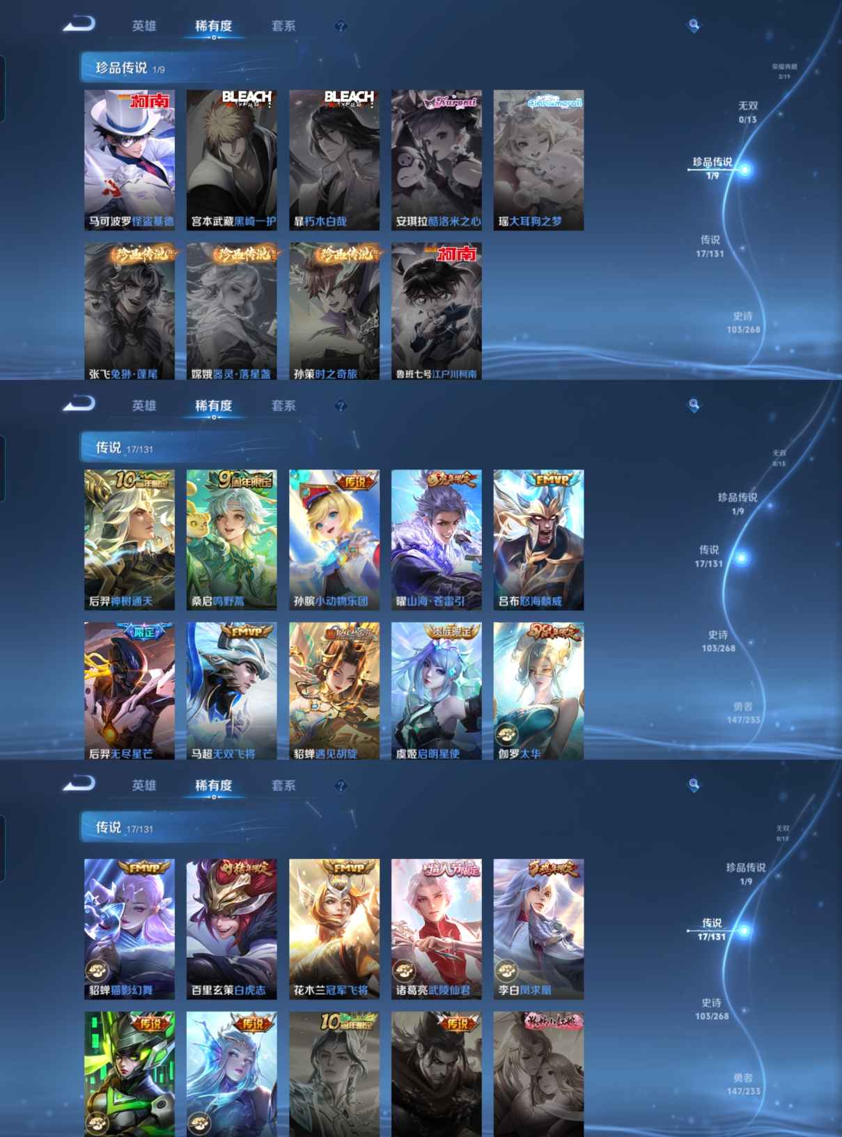 贵族等级:v9皮肤数:326生肖限定11 传说品质17 情人节限定3 荣耀典藏2 珍品传说1 英雄数:129