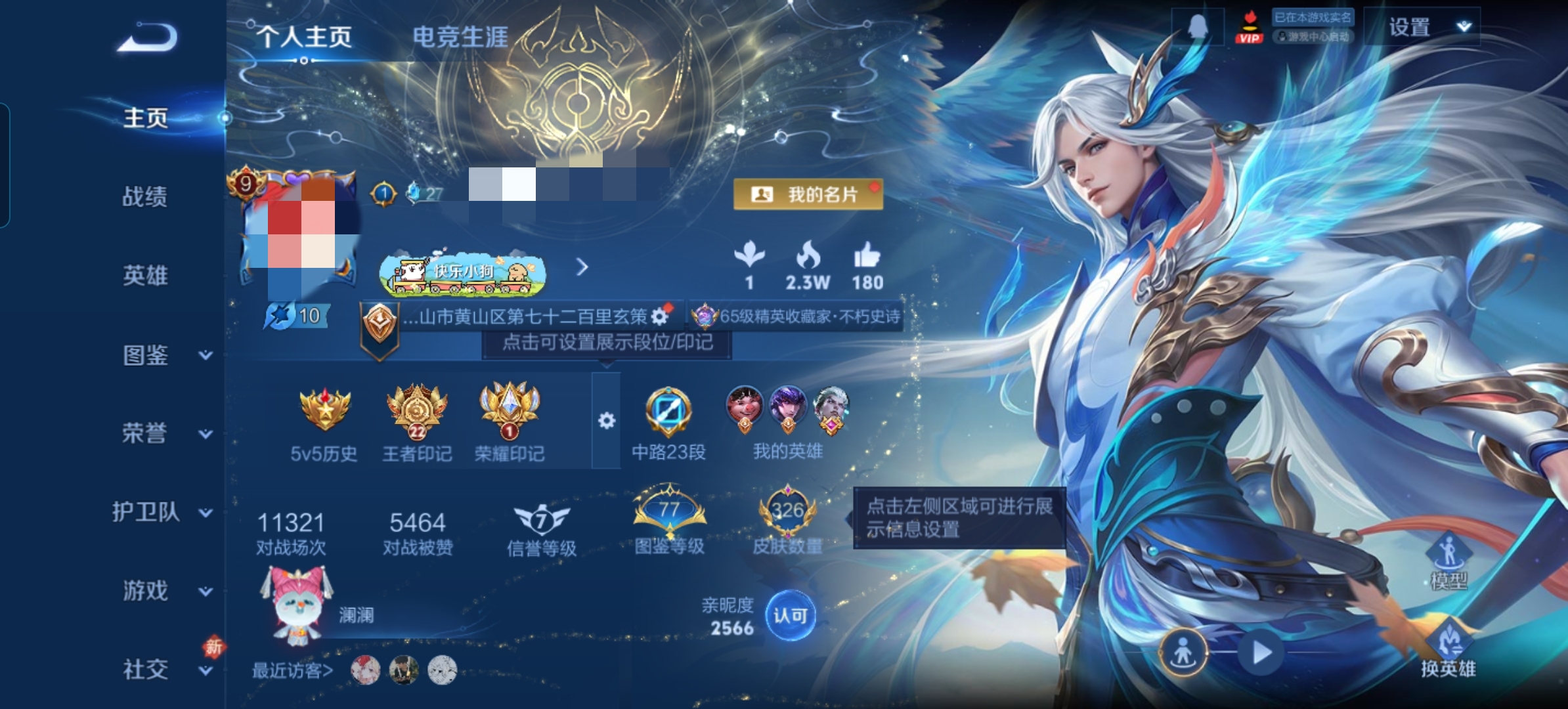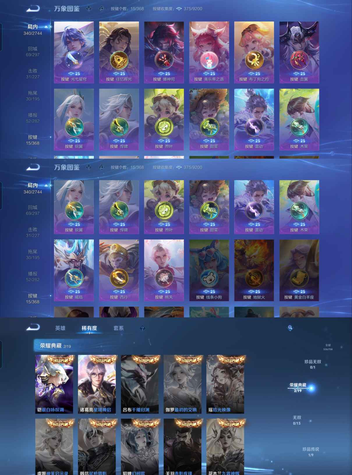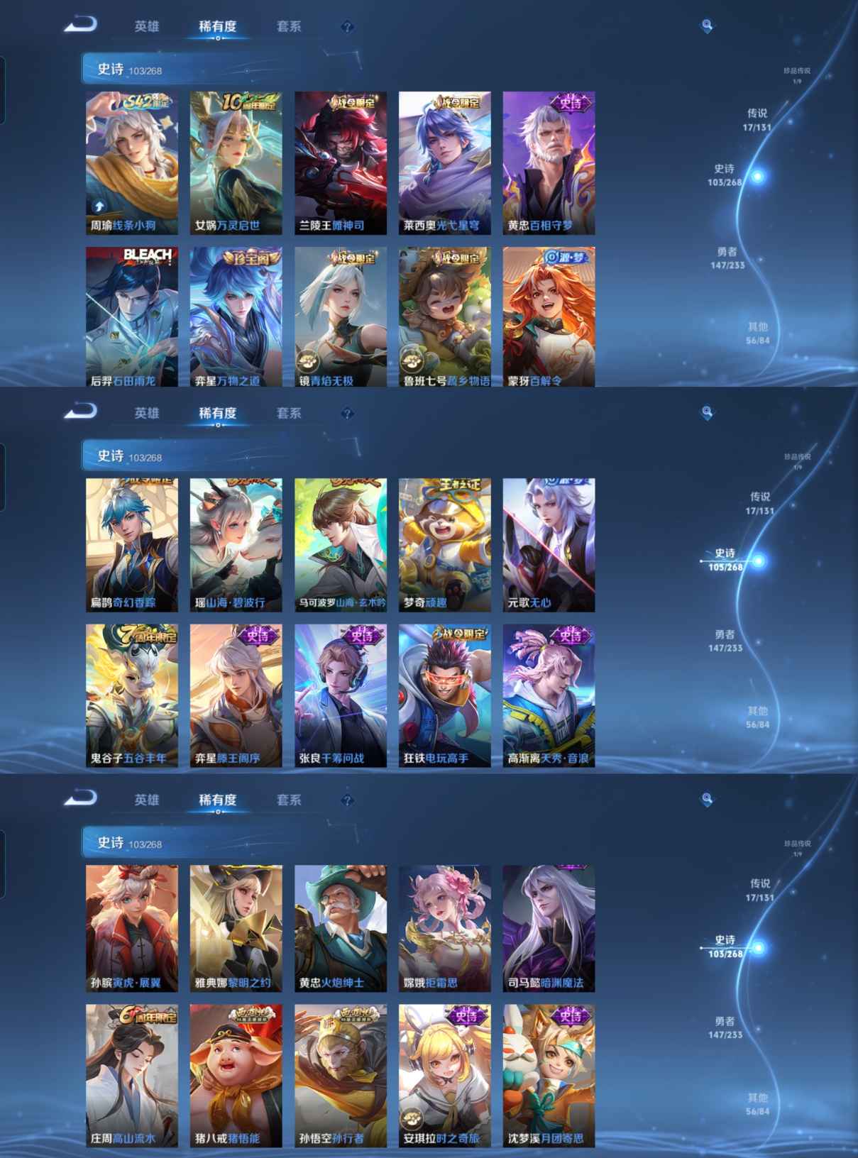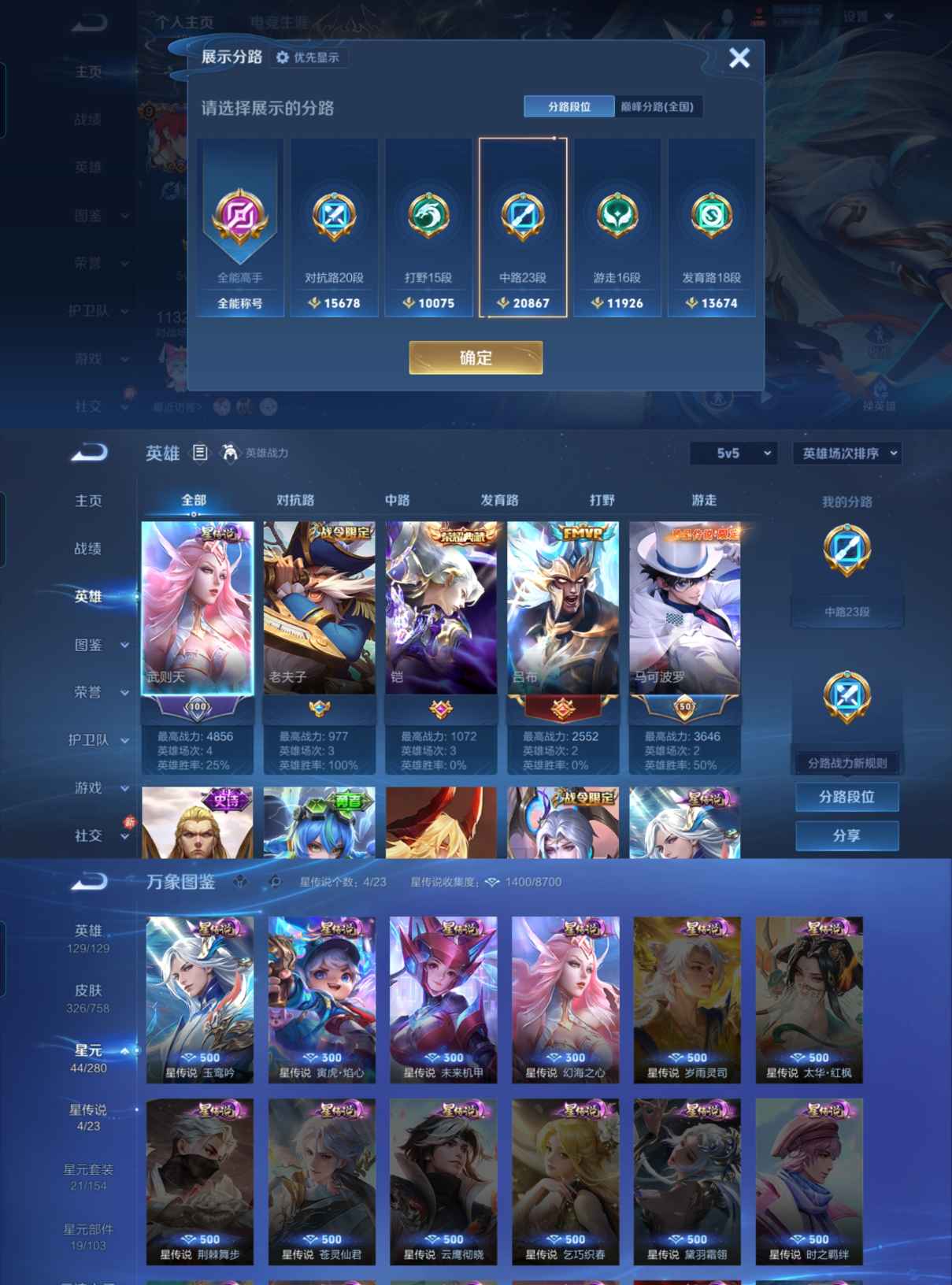 贵族等级:v9皮肤数:326生肖限定11 传说品质17 情人节限定3 荣耀典藏2 珍品传说1 英雄数:129