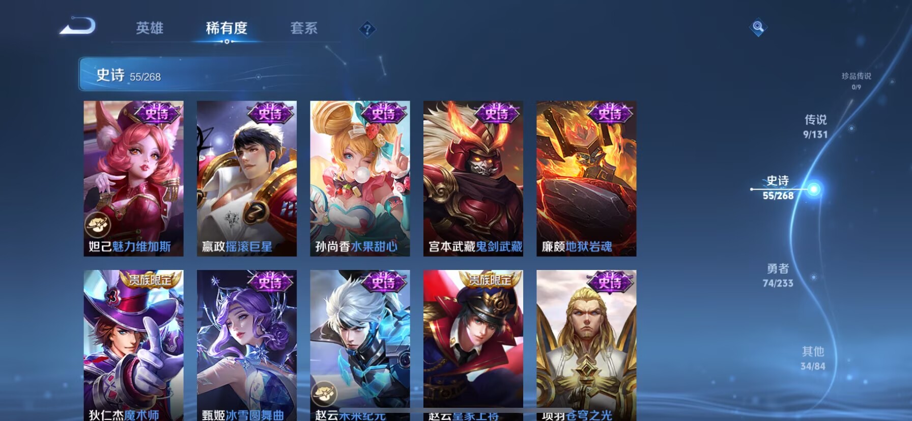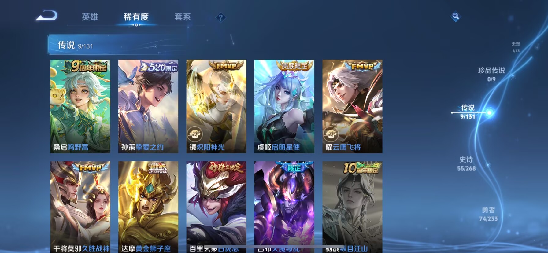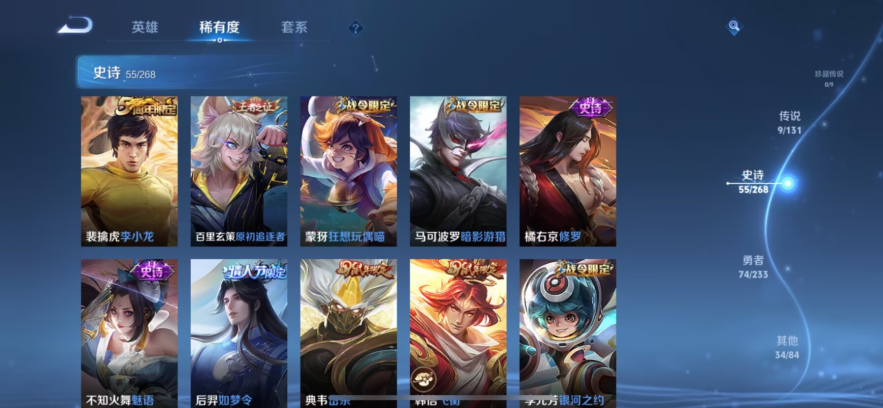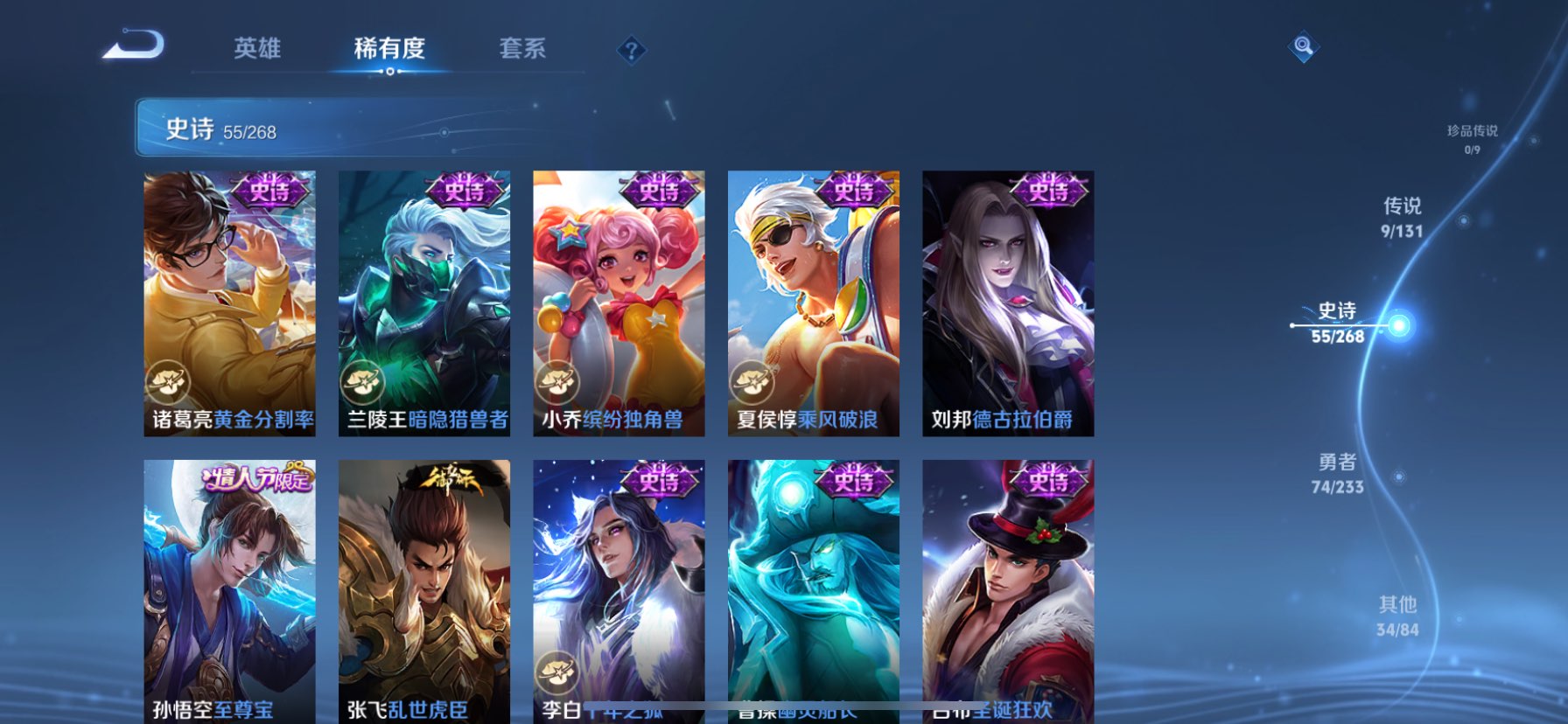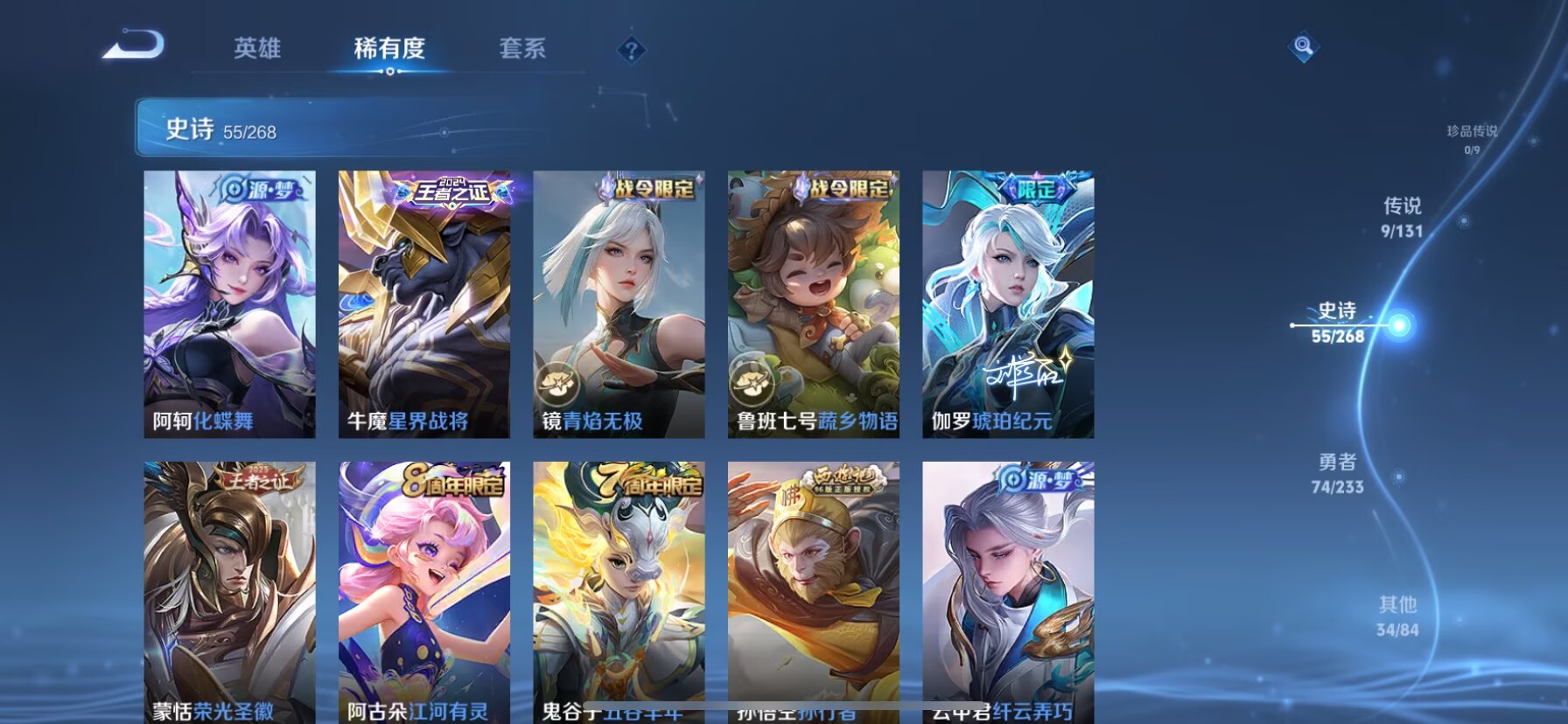 贵族等级:v8皮肤数:174生肖限定4 情人节限定3 传说品质9 荣耀典藏1 无双1 英雄数:126