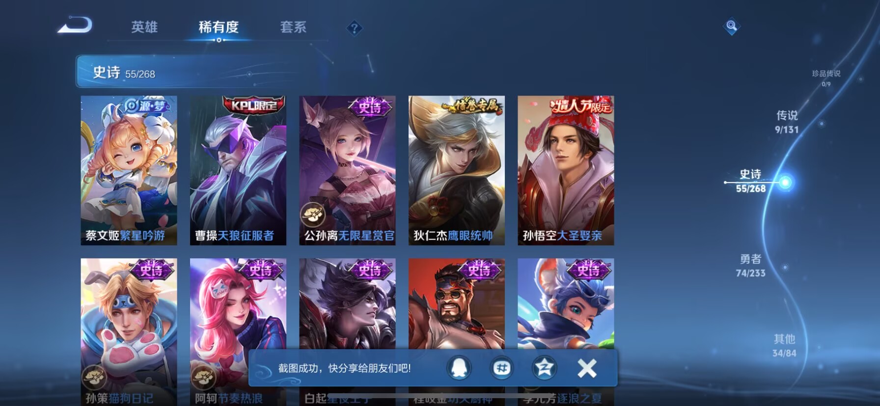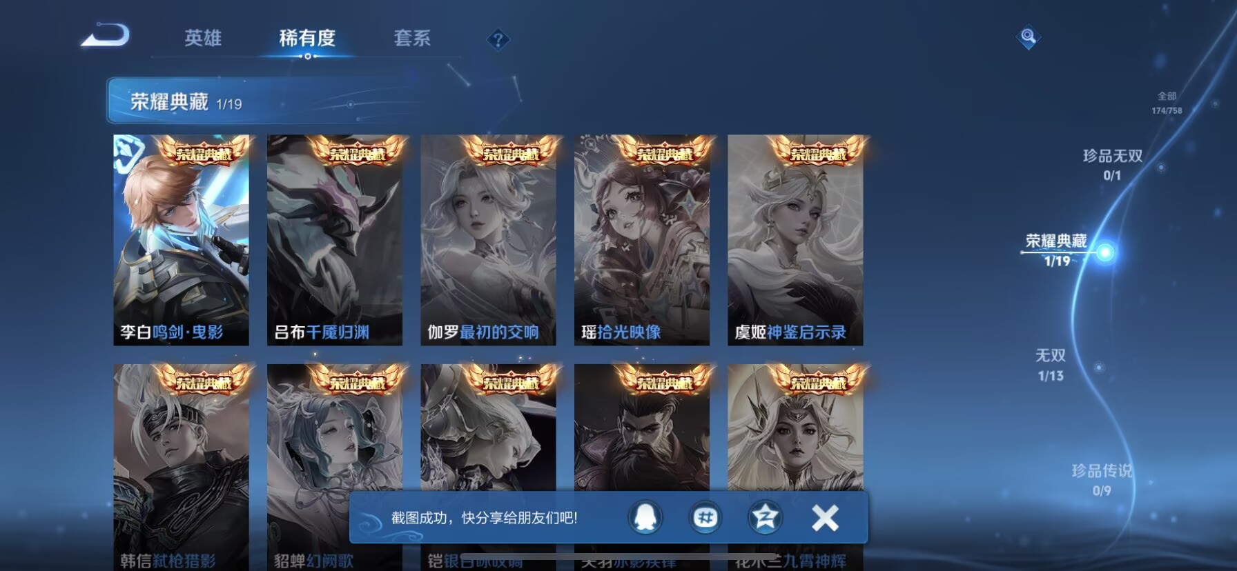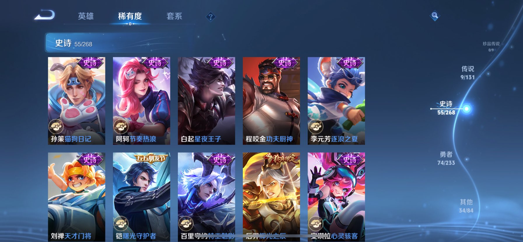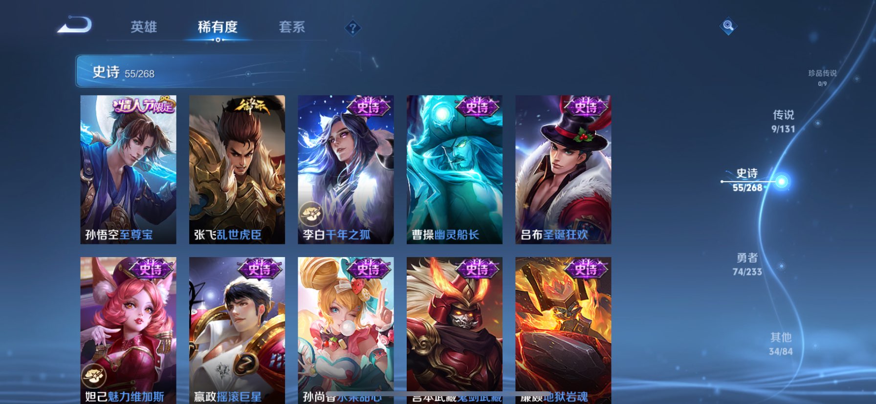 贵族等级:v8皮肤数:174生肖限定4 情人节限定3 传说品质9 荣耀典藏1 无双1 英雄数:126