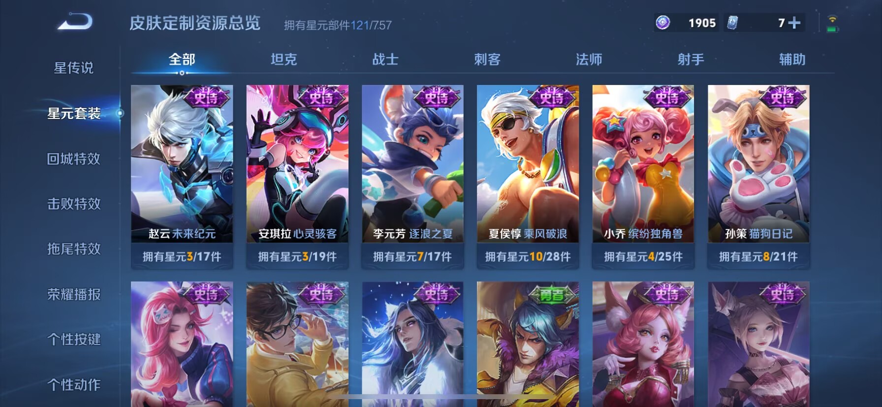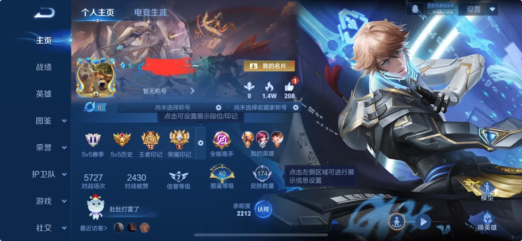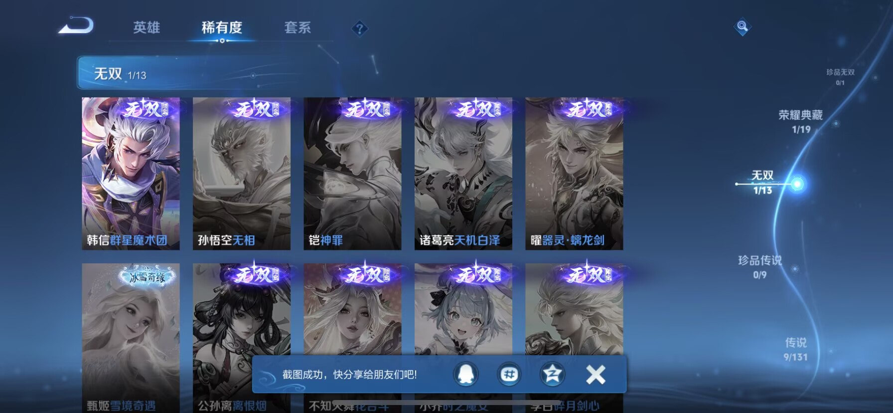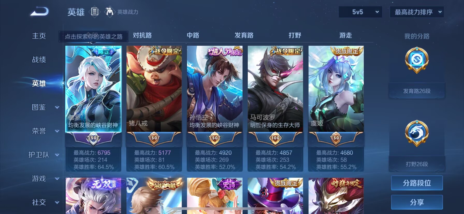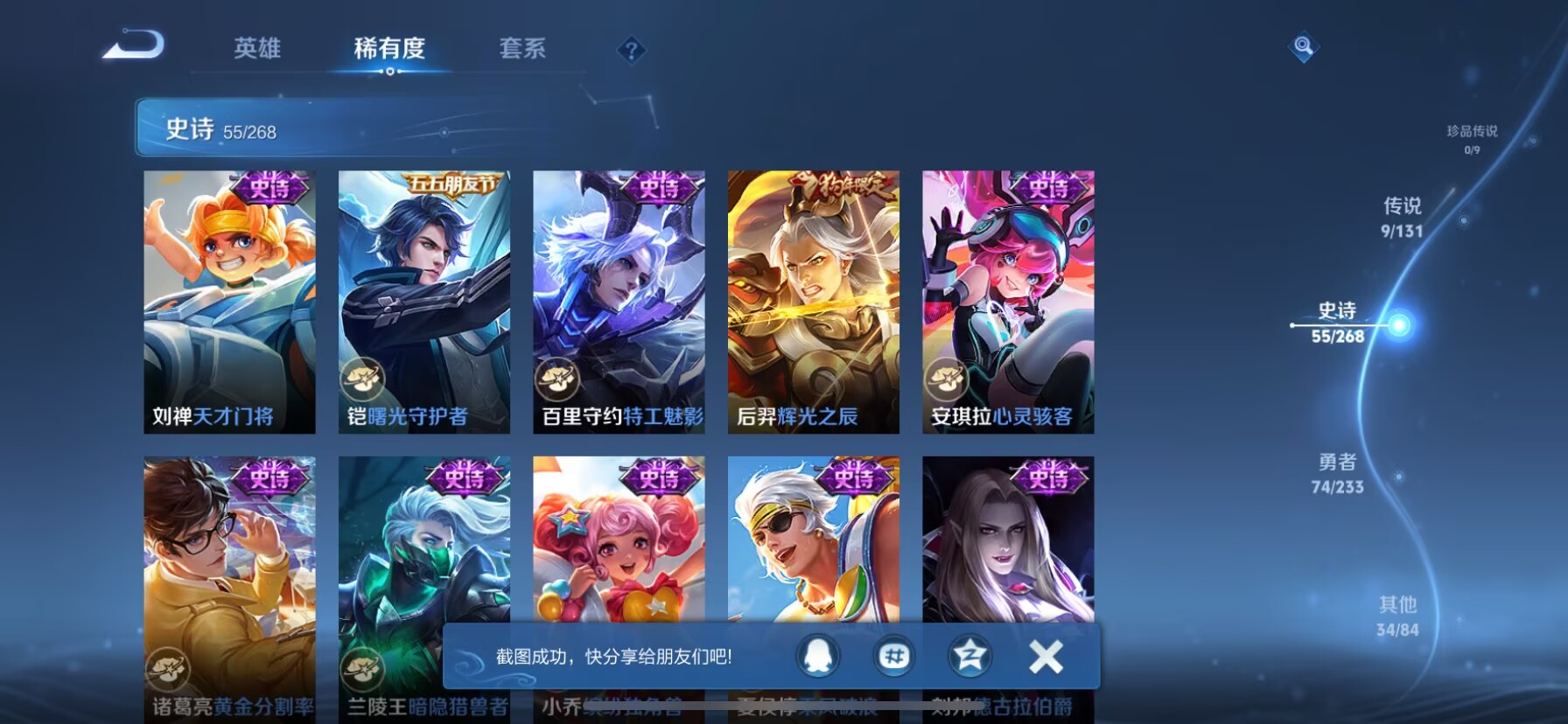 贵族等级:v8皮肤数:174生肖限定4 情人节限定3 传说品质9 荣耀典藏1 无双1 英雄数:126