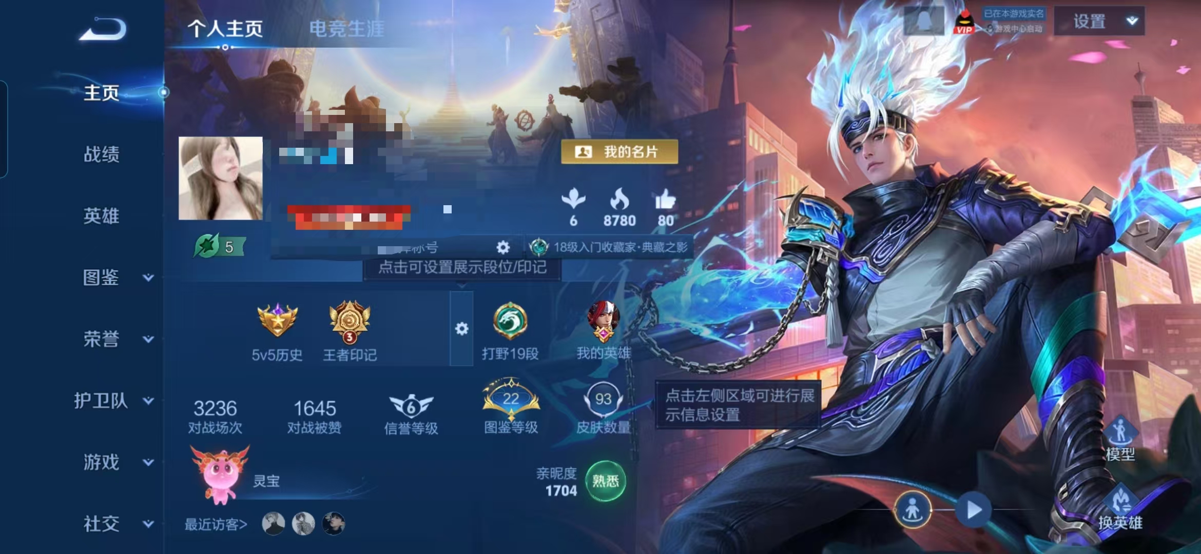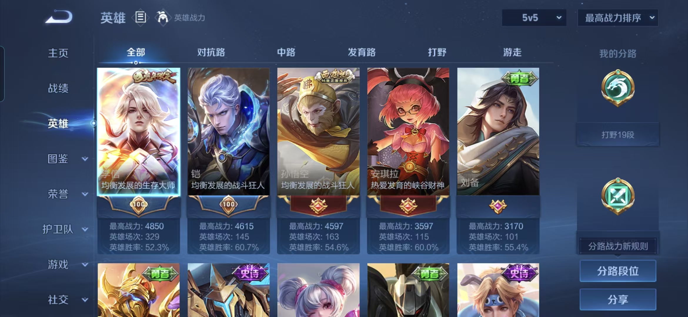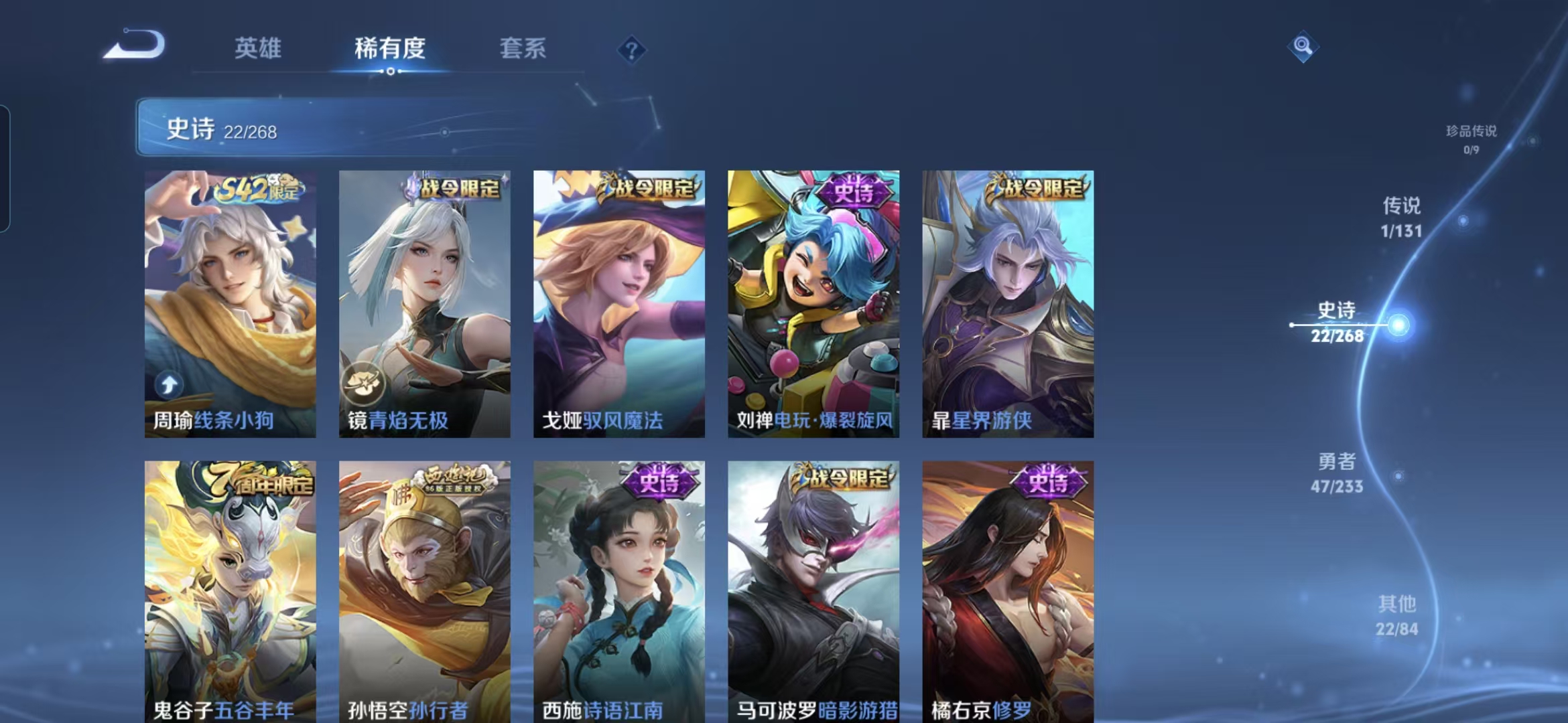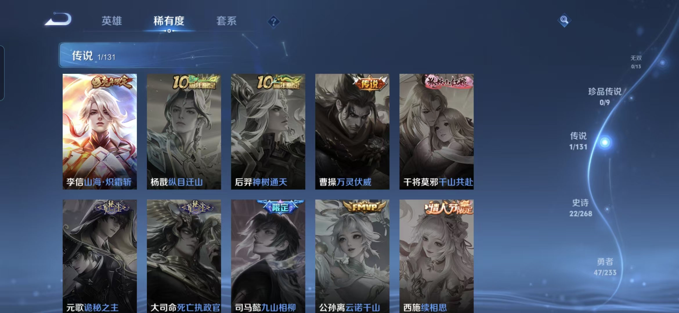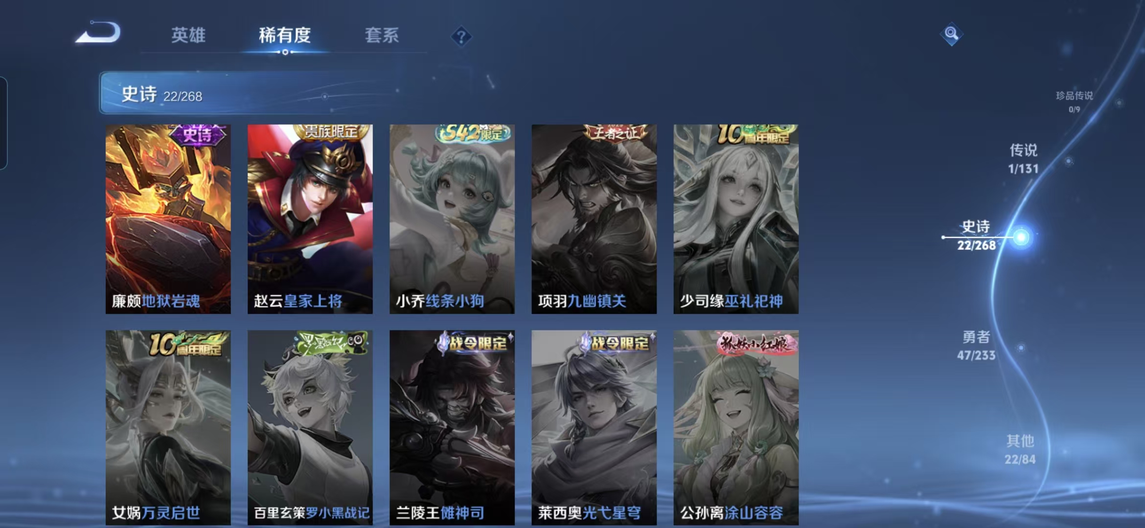贵族等级:v5皮肤数:94传说品质1 生肖限定1 荣耀典藏1 英雄数:111