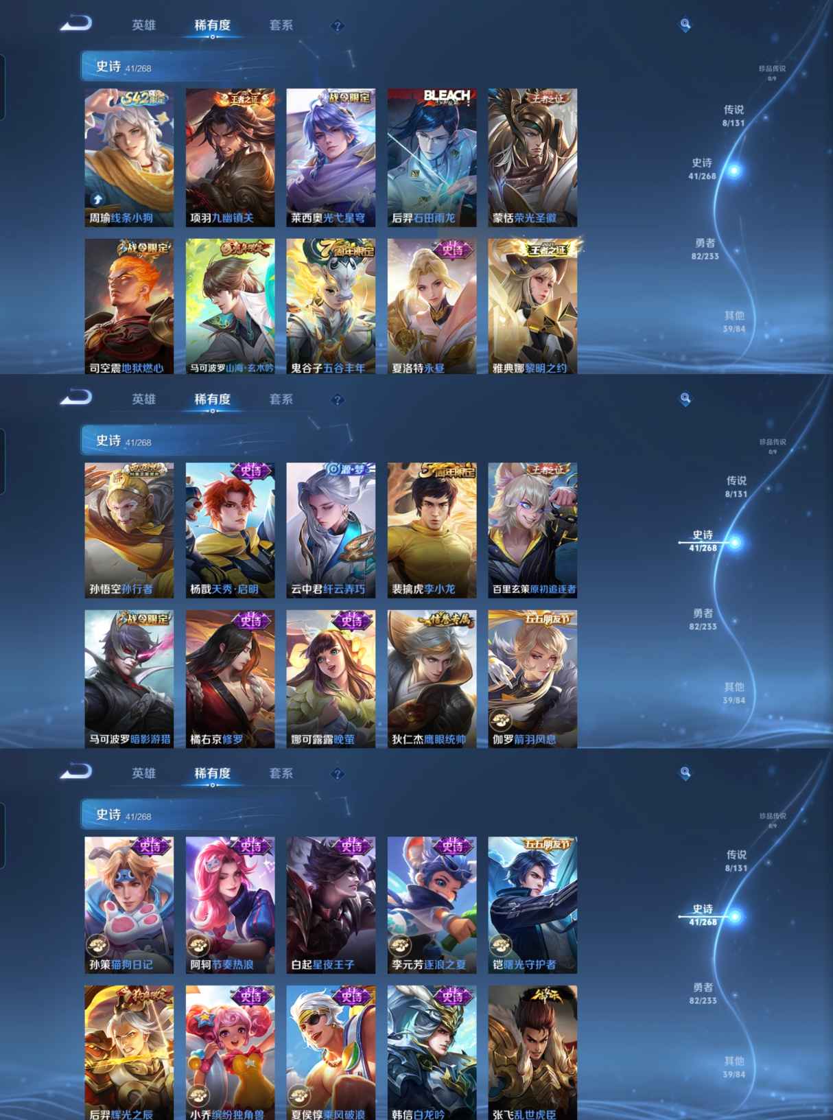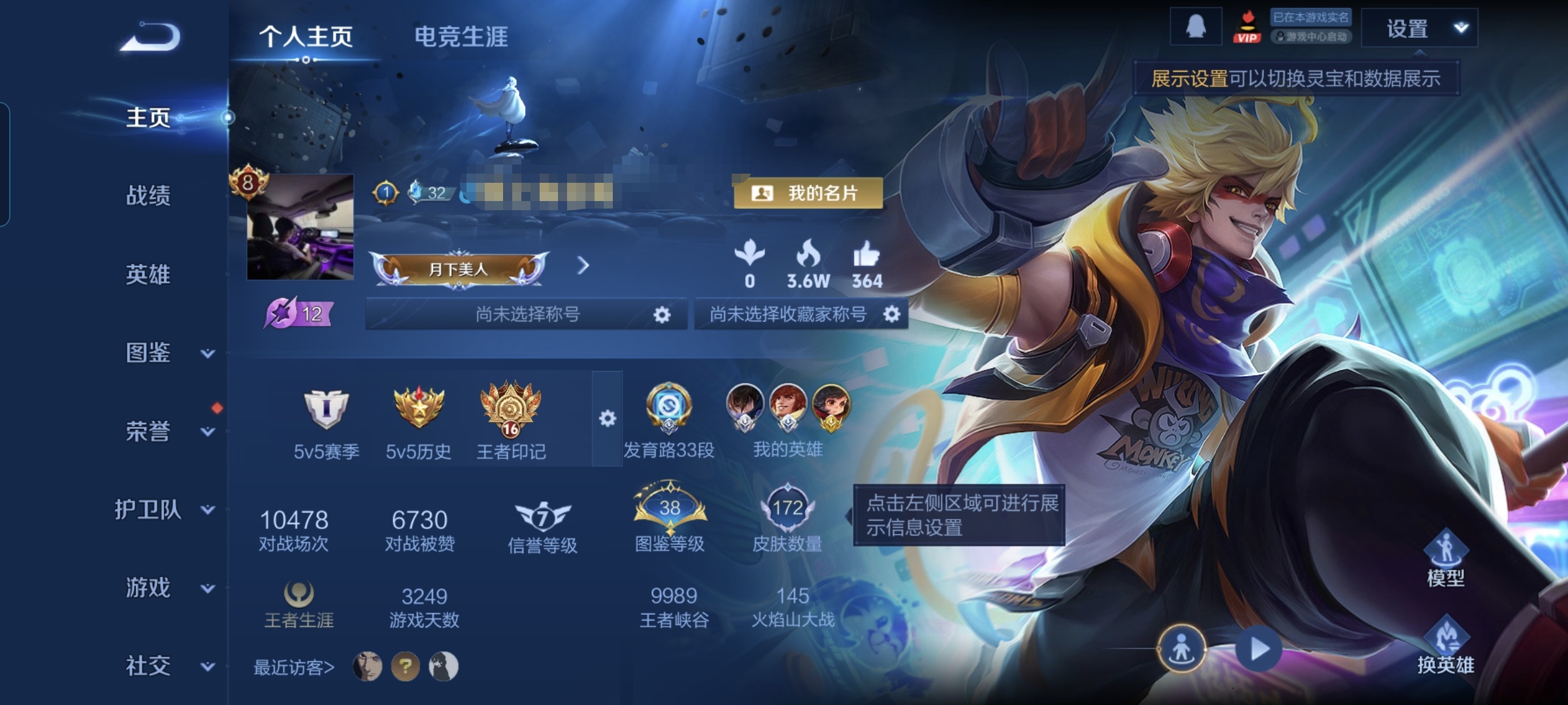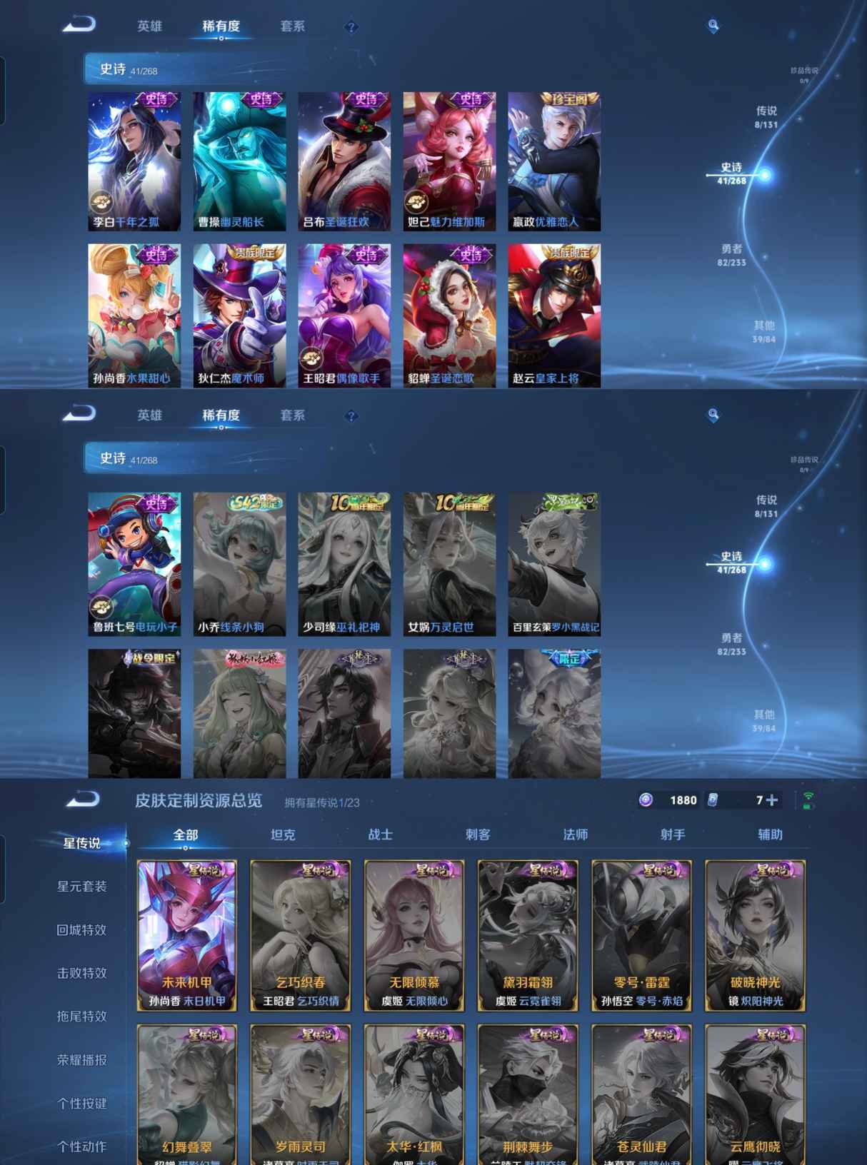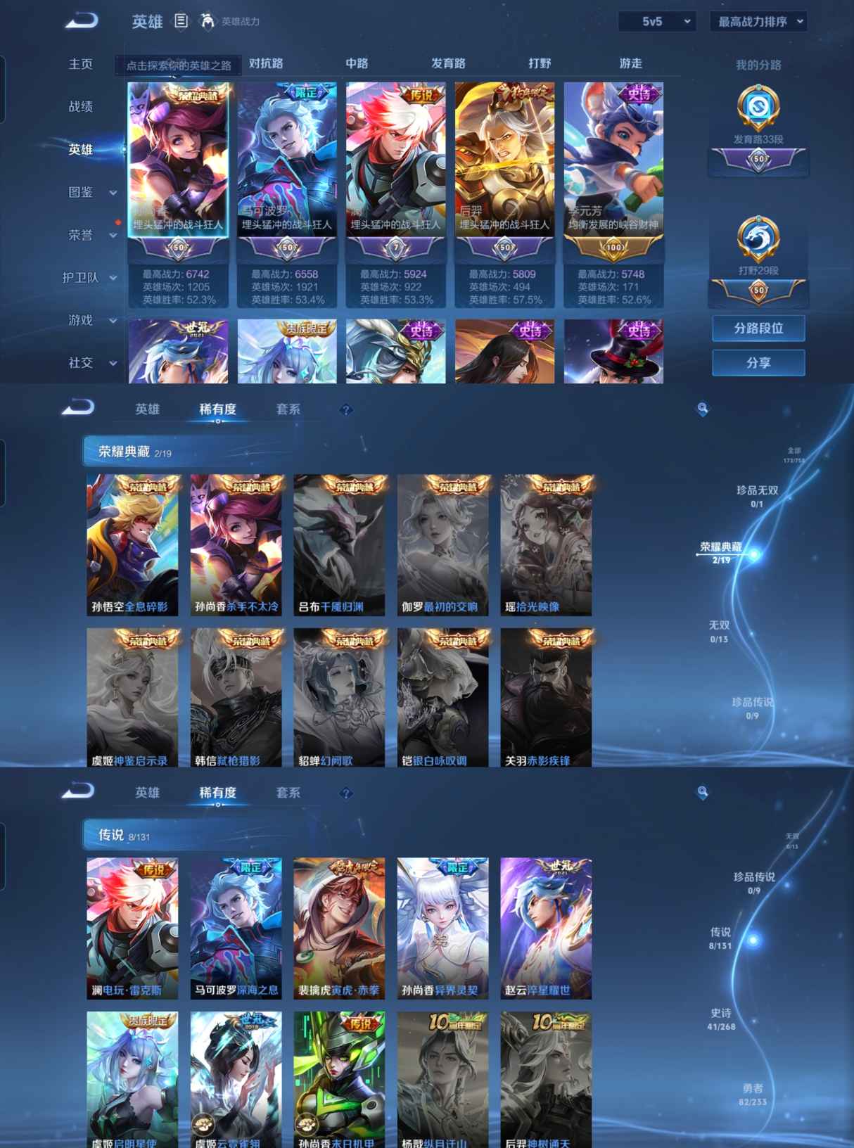 贵族等级:v8皮肤数:172生肖限定3 传说品质8 荣耀典藏2 英雄数:127