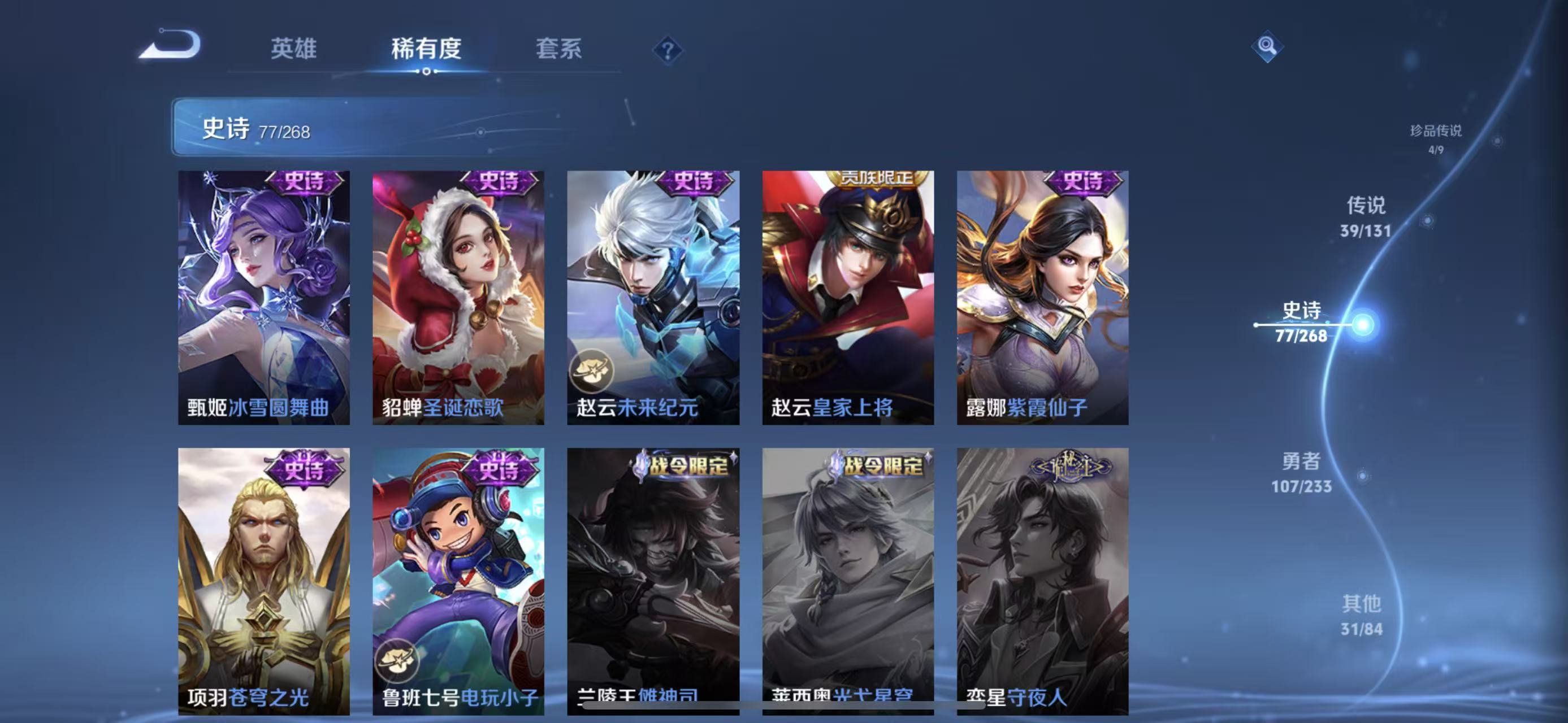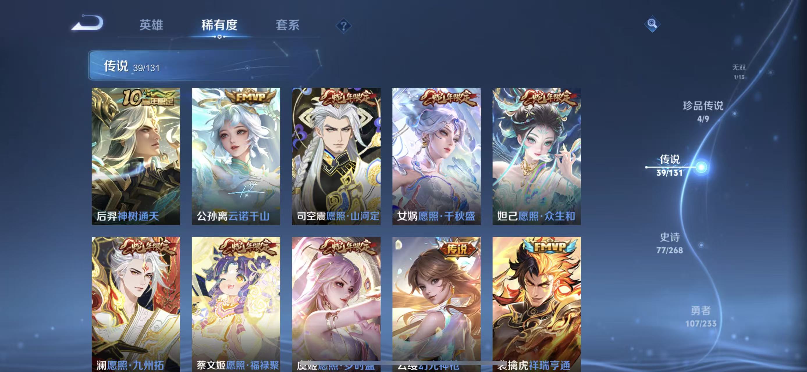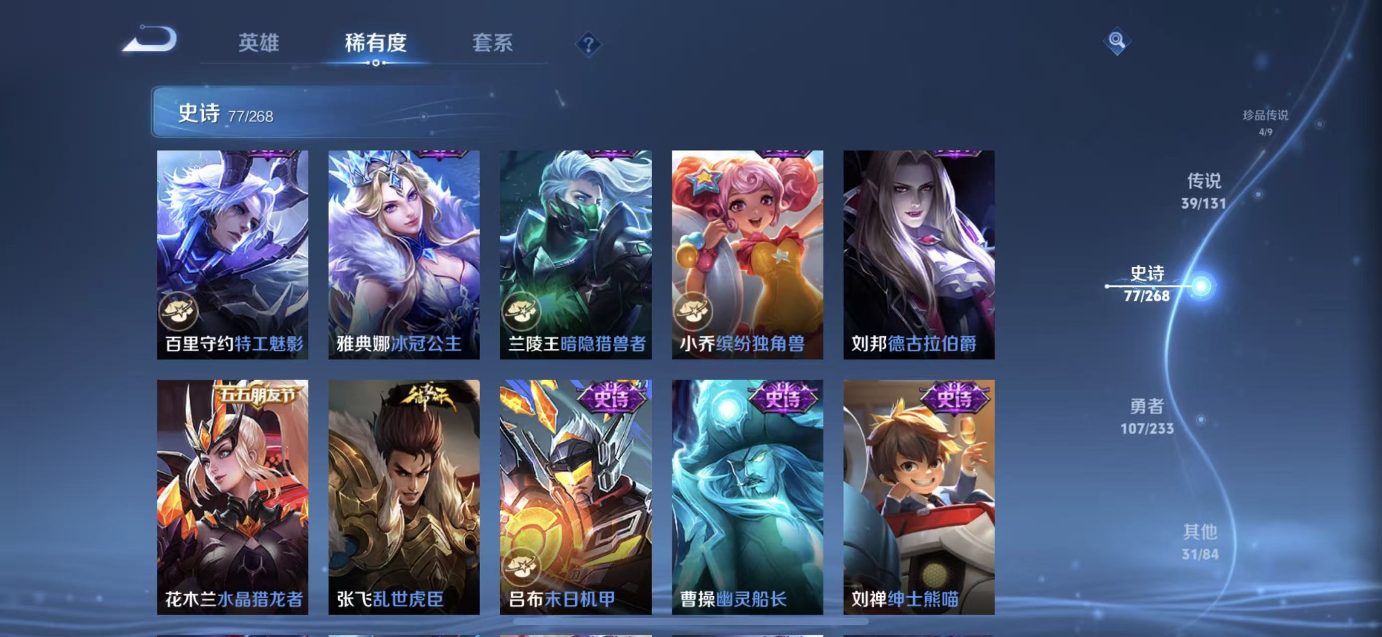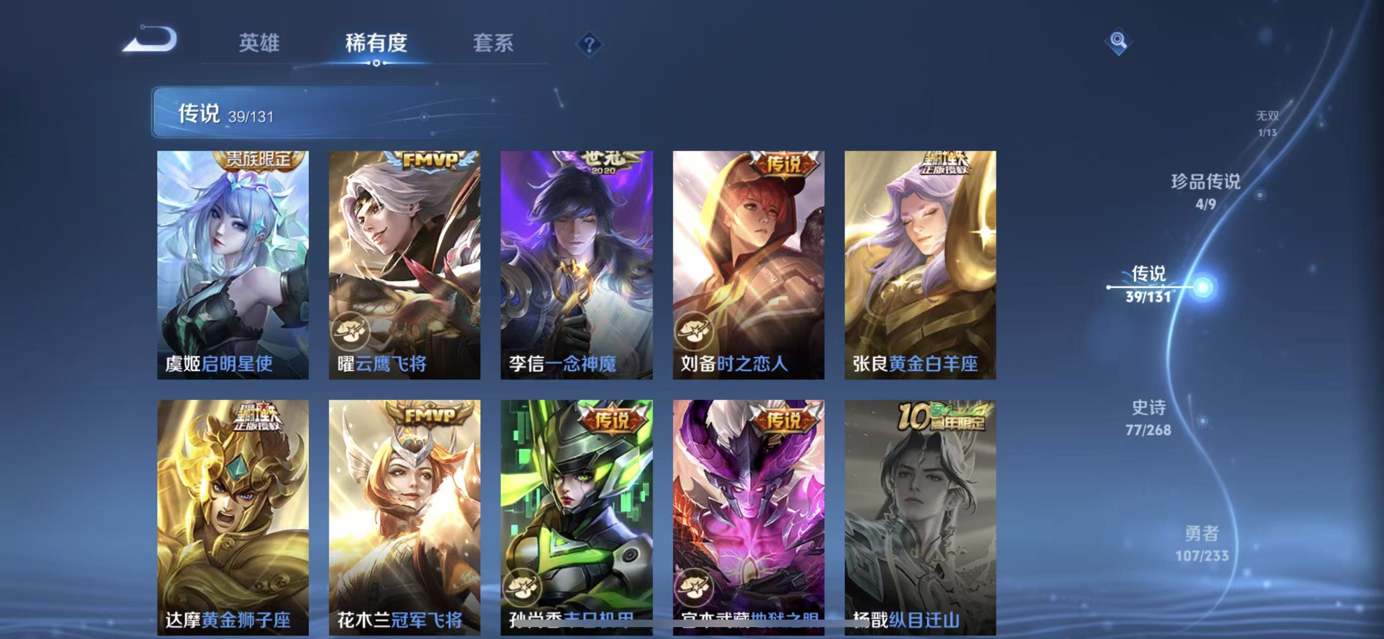 贵族等级:v9皮肤数:260传说品质39 生肖限定12 珍品传说4 荣耀典藏1 无双1 英雄数:128