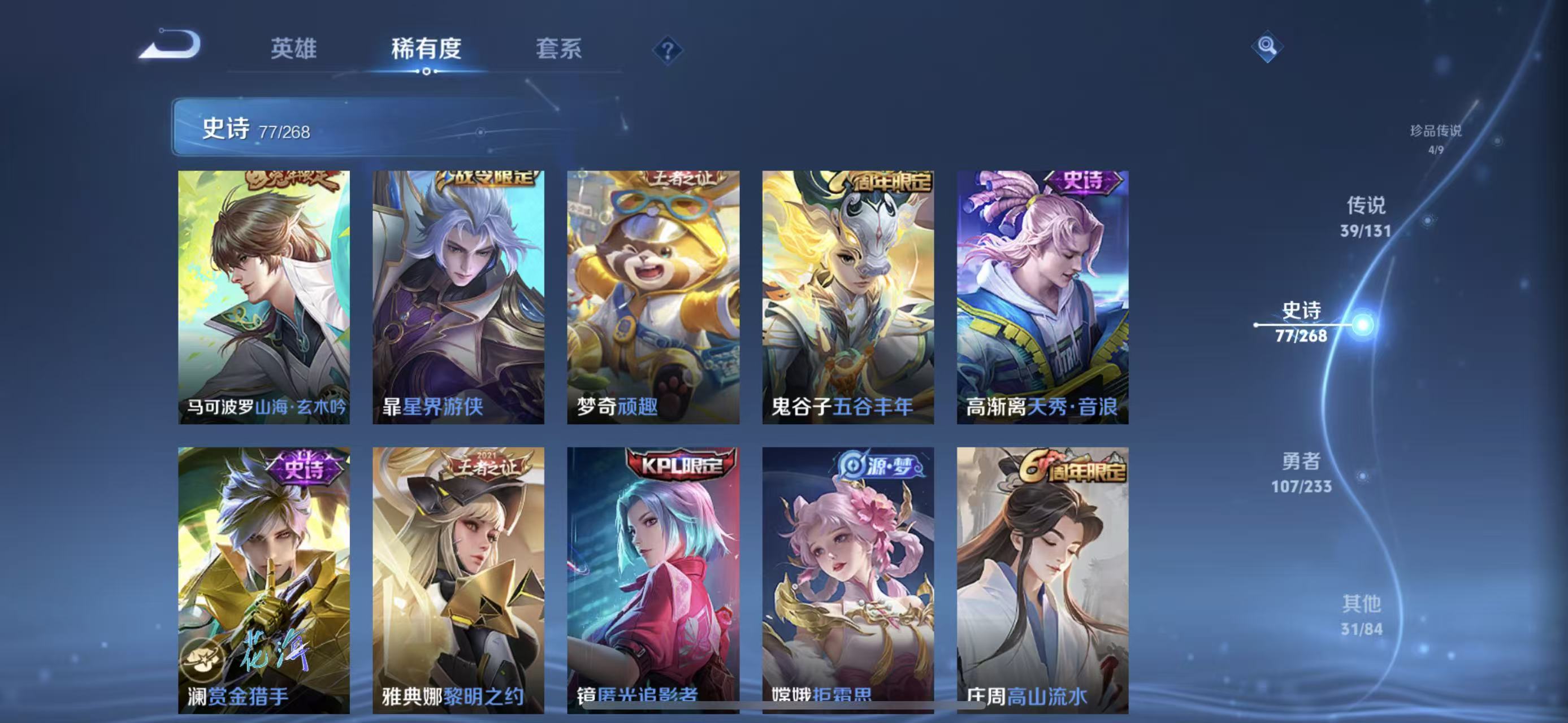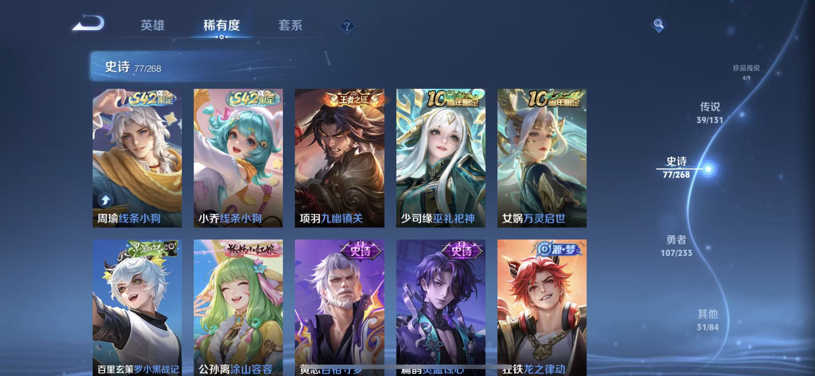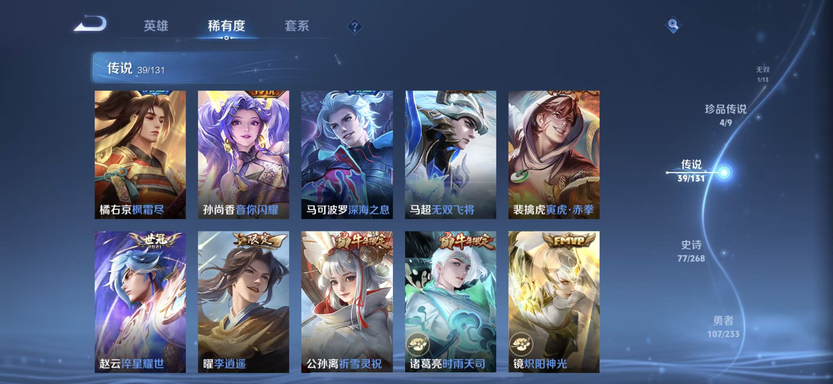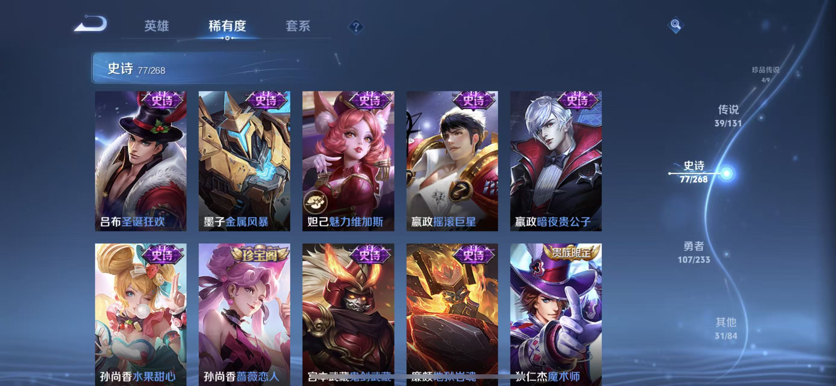 贵族等级:v9皮肤数:260传说品质39 生肖限定12 珍品传说4 荣耀典藏1 无双1 英雄数:128