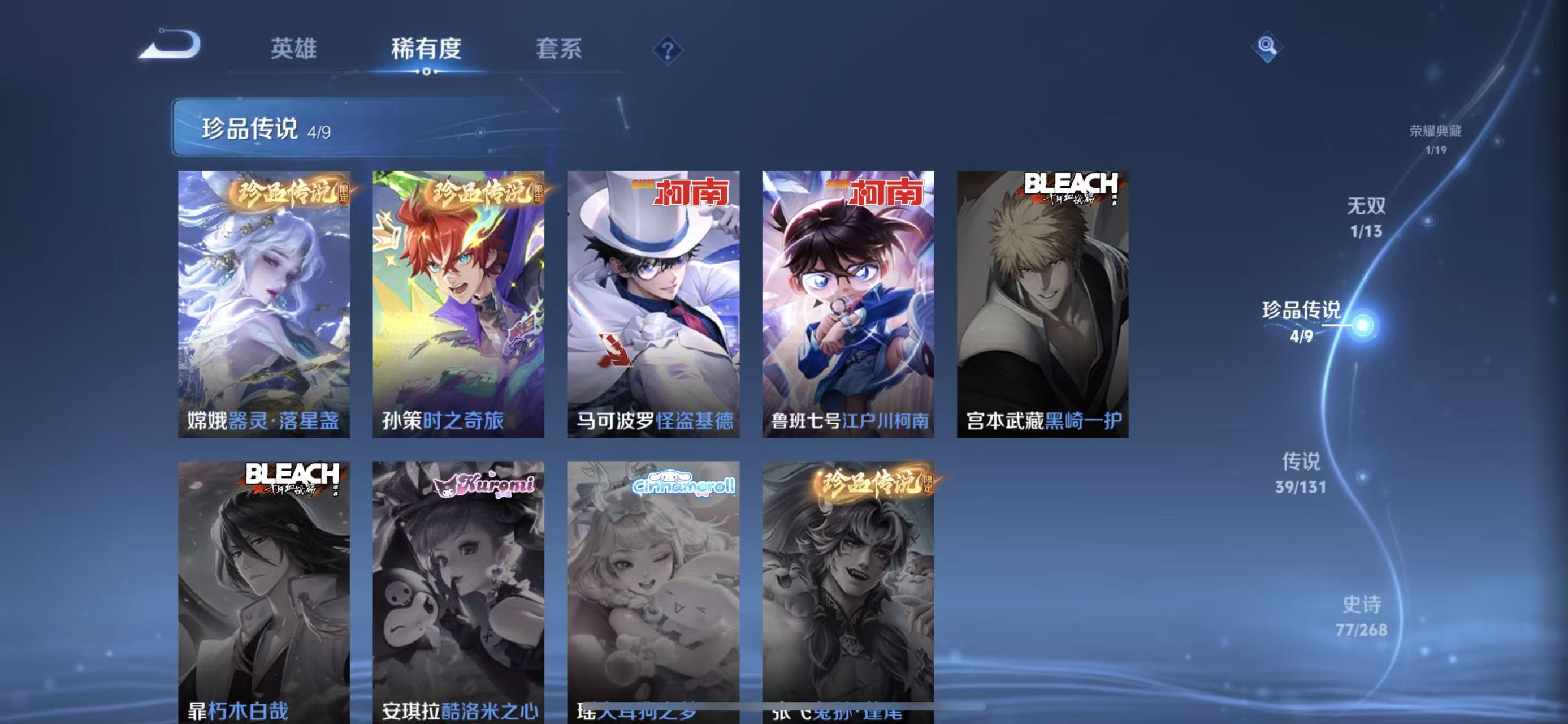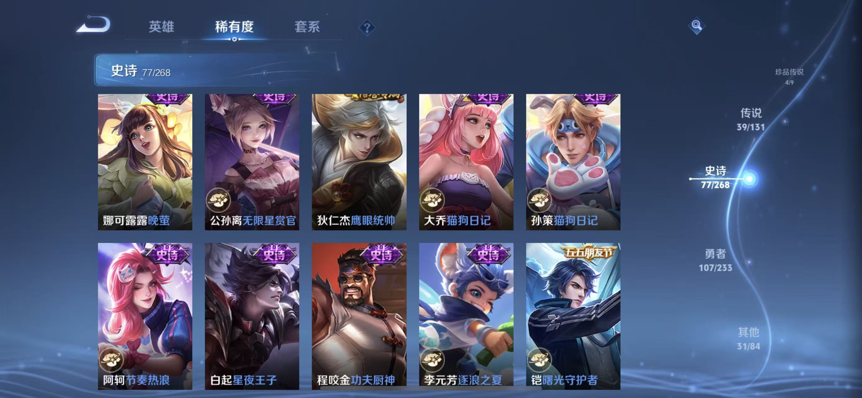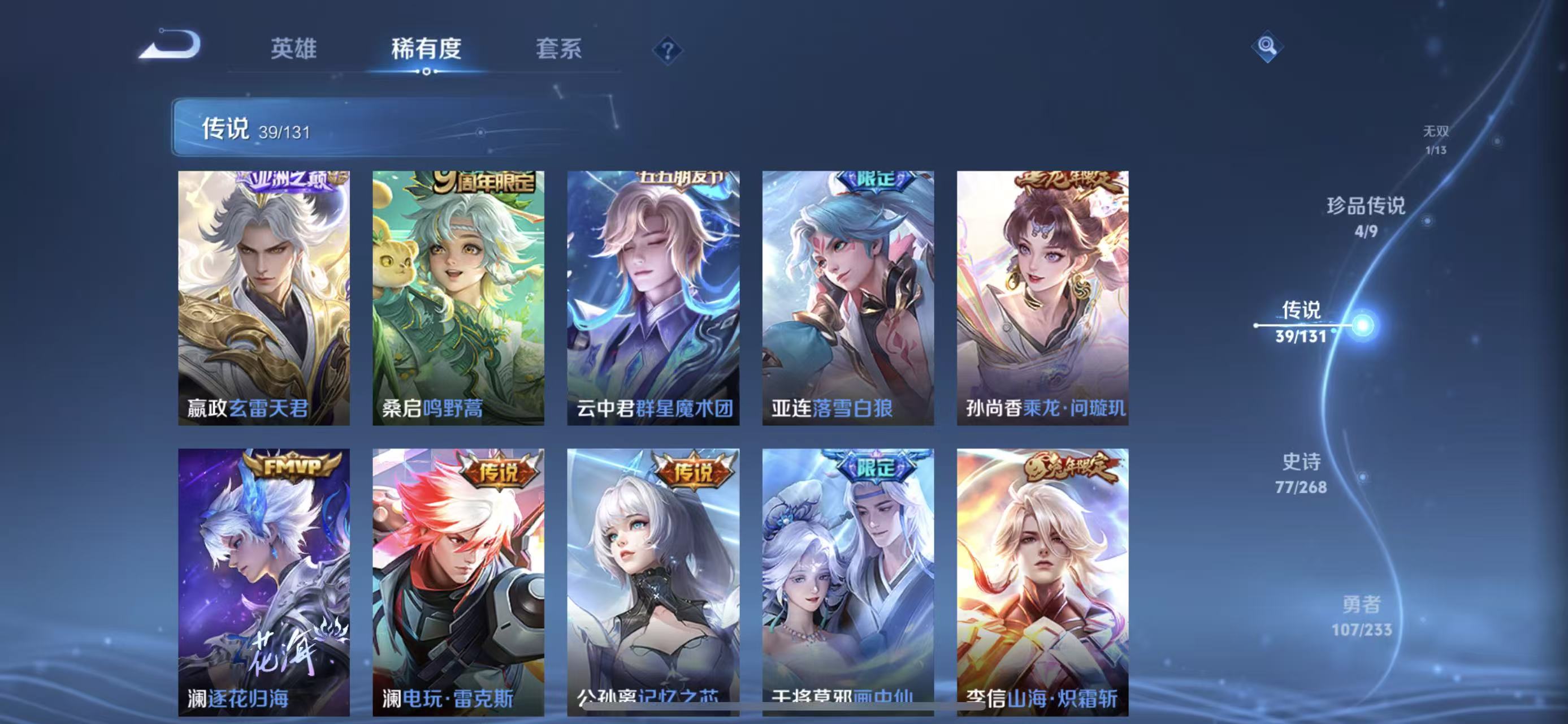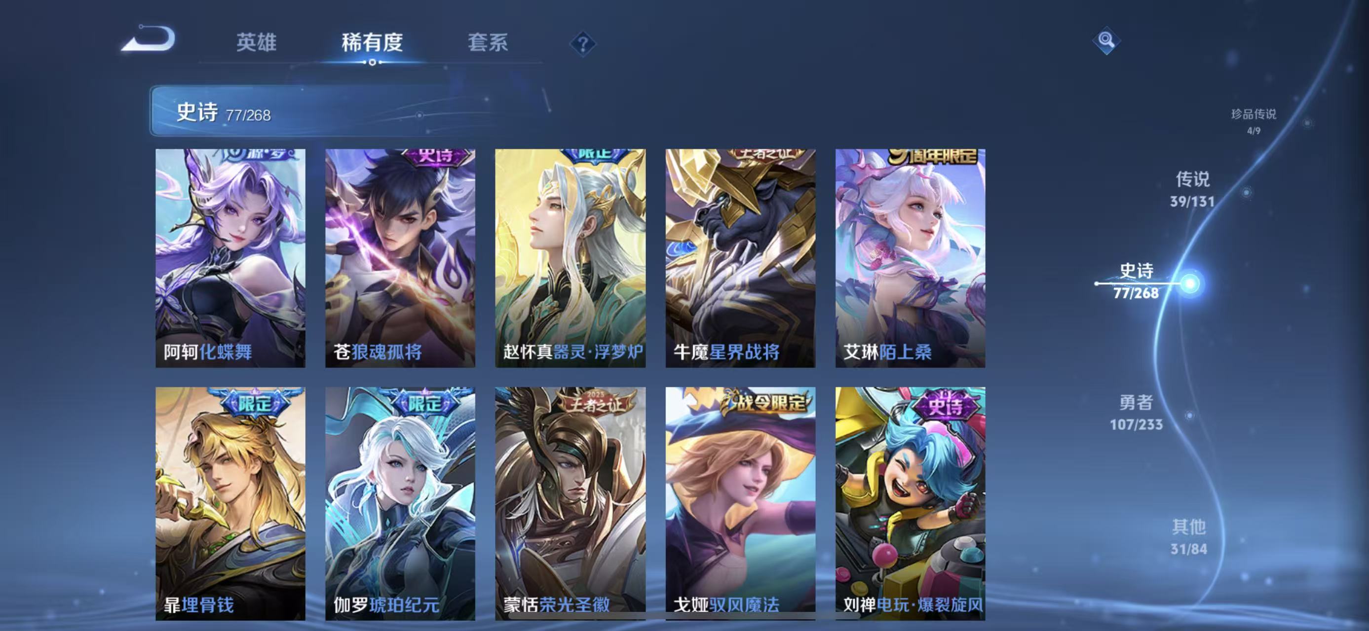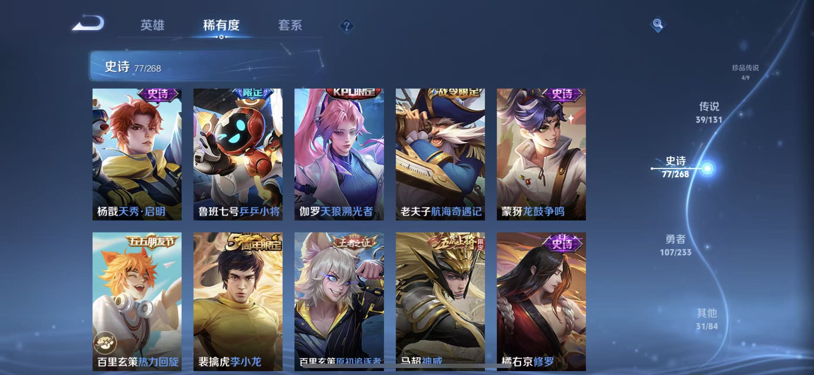 贵族等级:v9皮肤数:260传说品质39 生肖限定12 珍品传说4 荣耀典藏1 无双1 英雄数:128