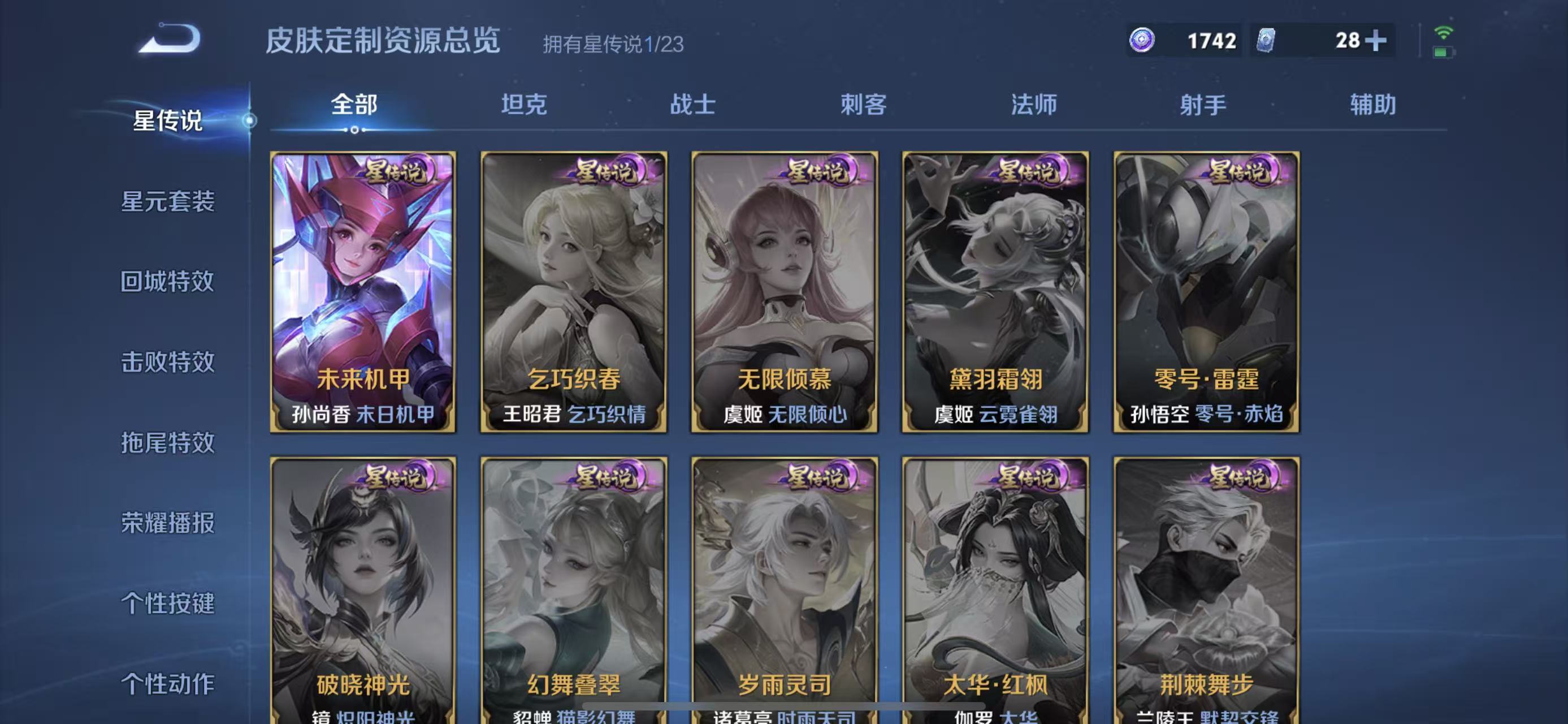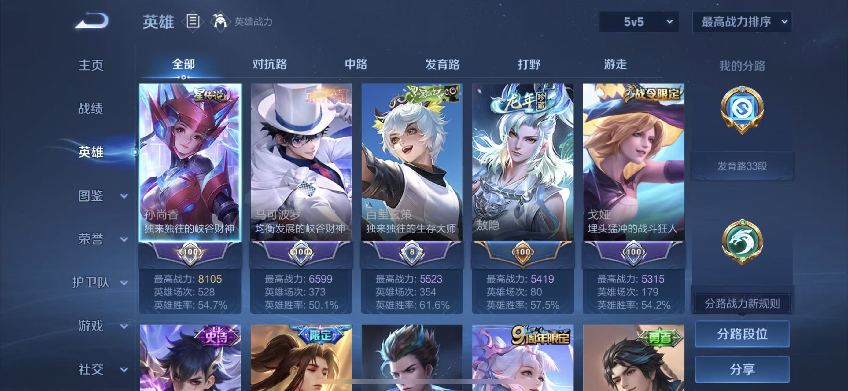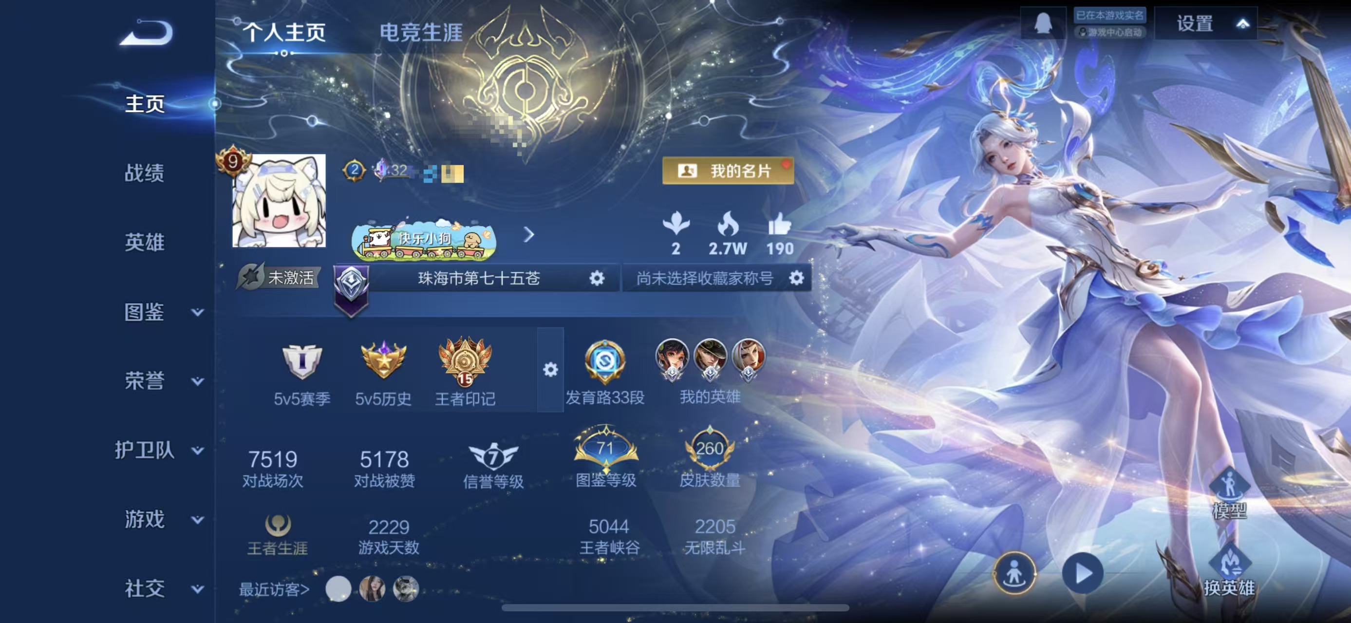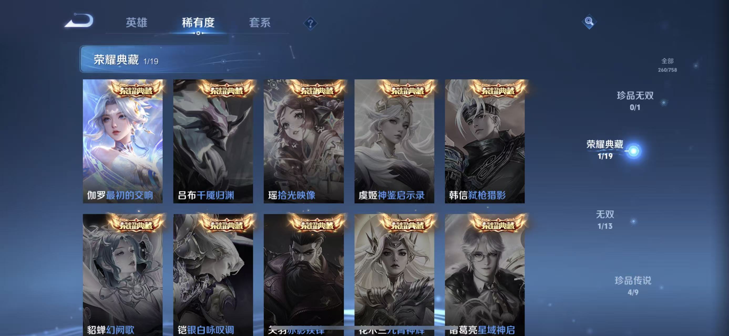 贵族等级:v9皮肤数:260传说品质39 生肖限定12 珍品传说4 荣耀典藏1 无双1 英雄数:128
