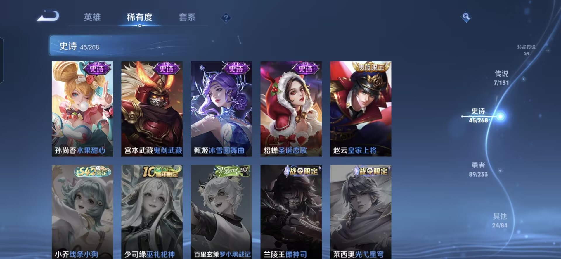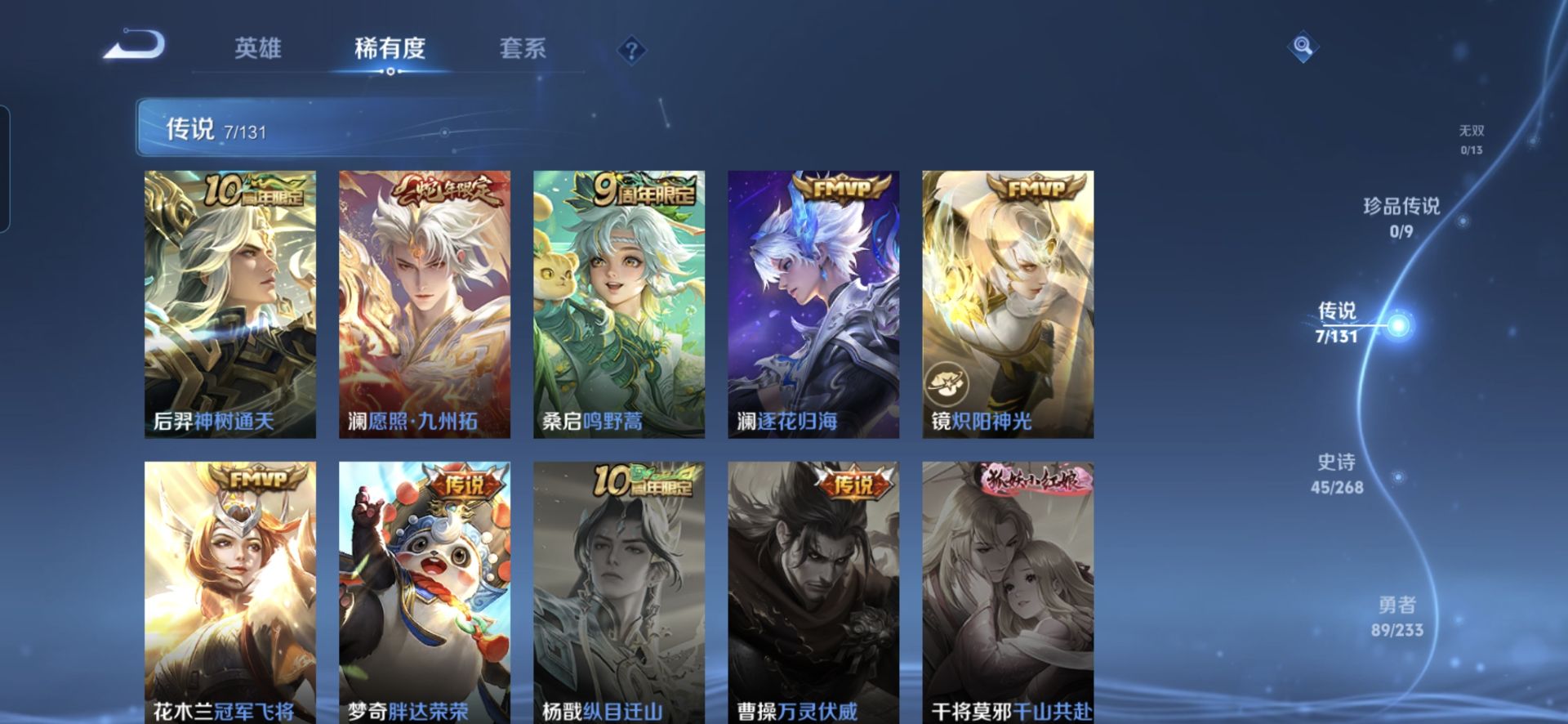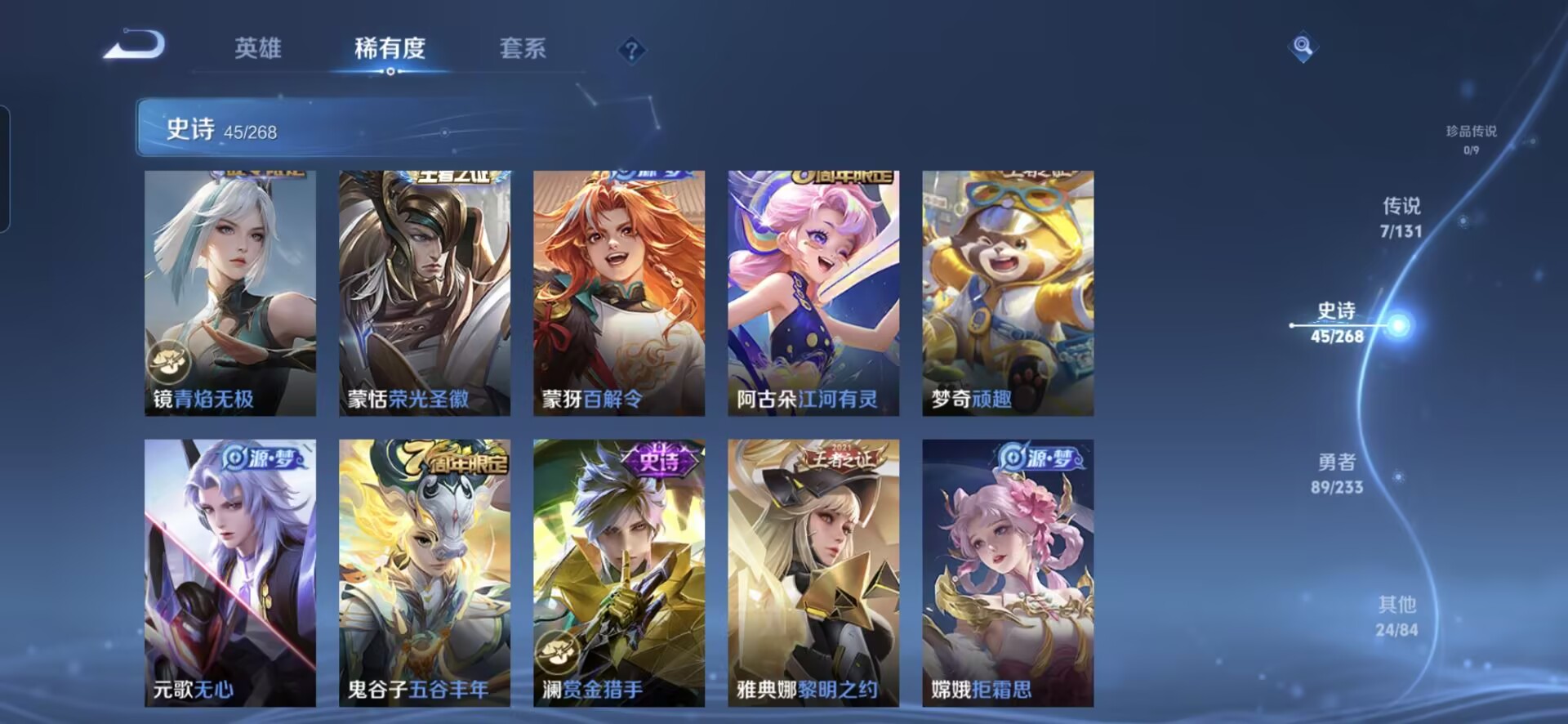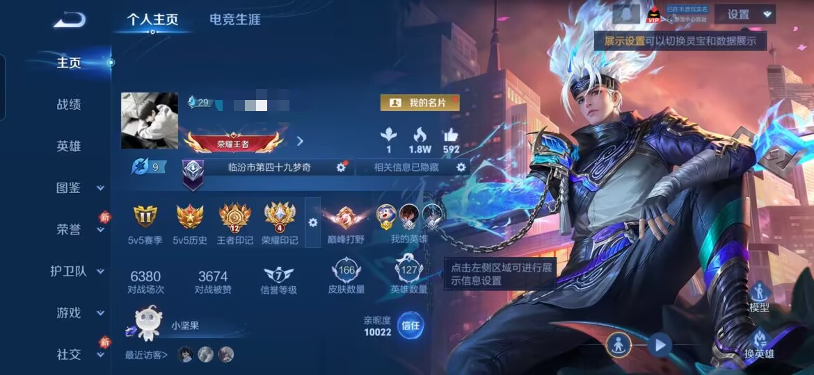 贵族等级:v5皮肤数:166传说品质7 生肖限定1 荣耀典藏1 英雄数:127