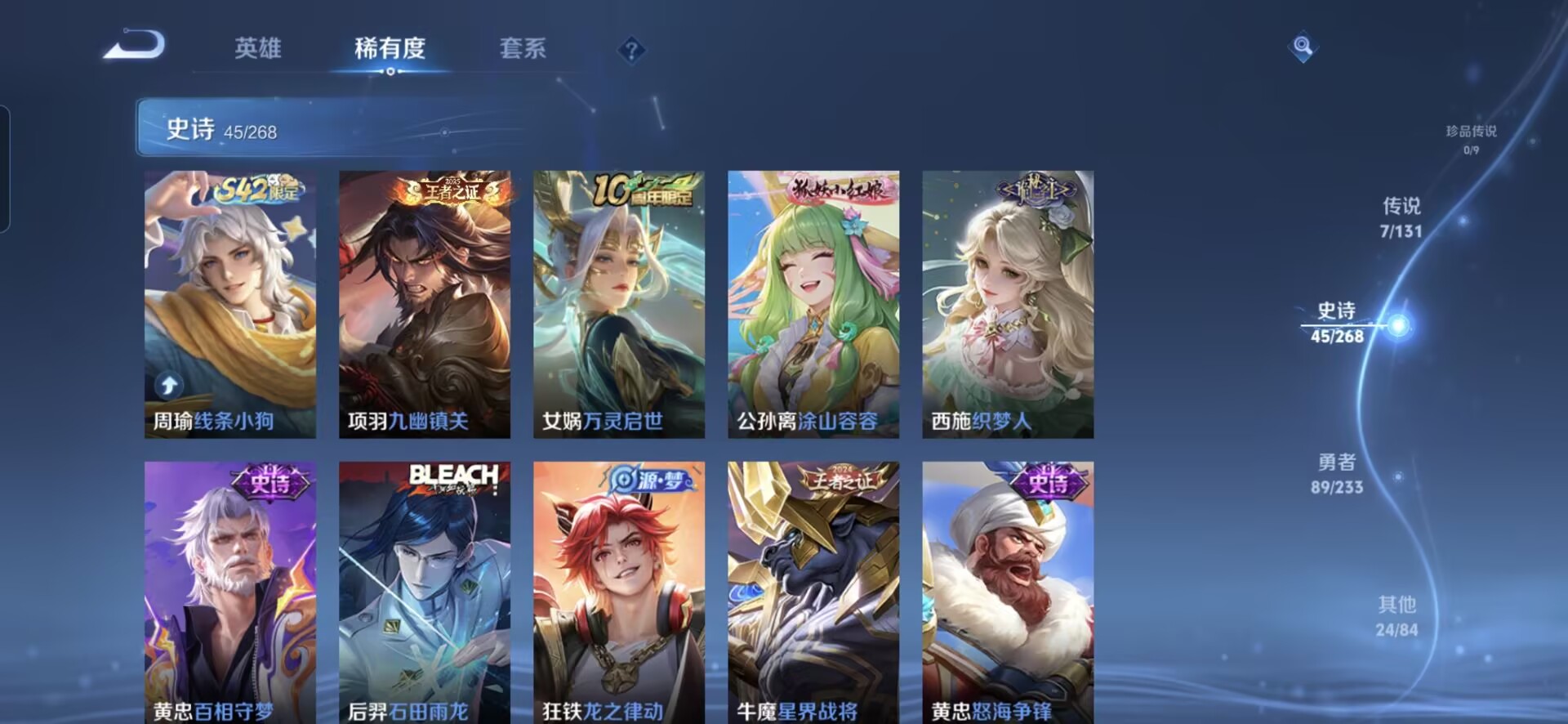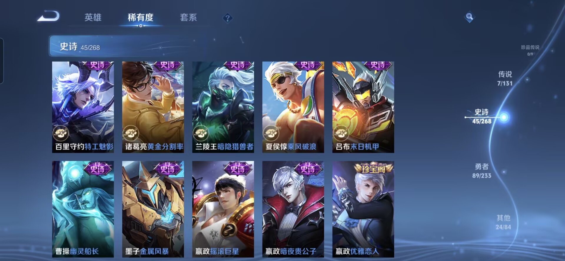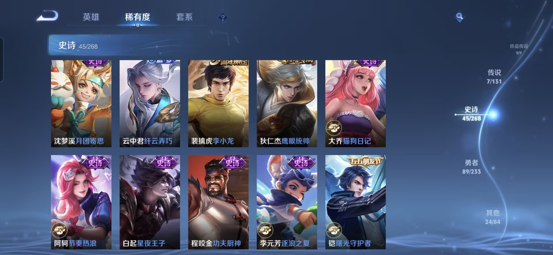 贵族等级:v5皮肤数:166传说品质7 生肖限定1 荣耀典藏1 英雄数:127