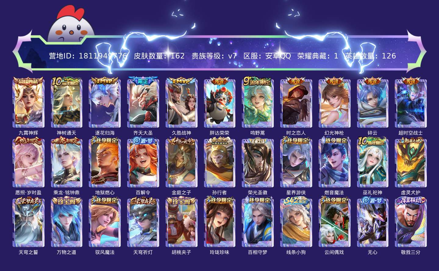 贵族等级:v7皮肤数:162传说品质12 荣耀典藏1 生肖限定4 英雄数:126