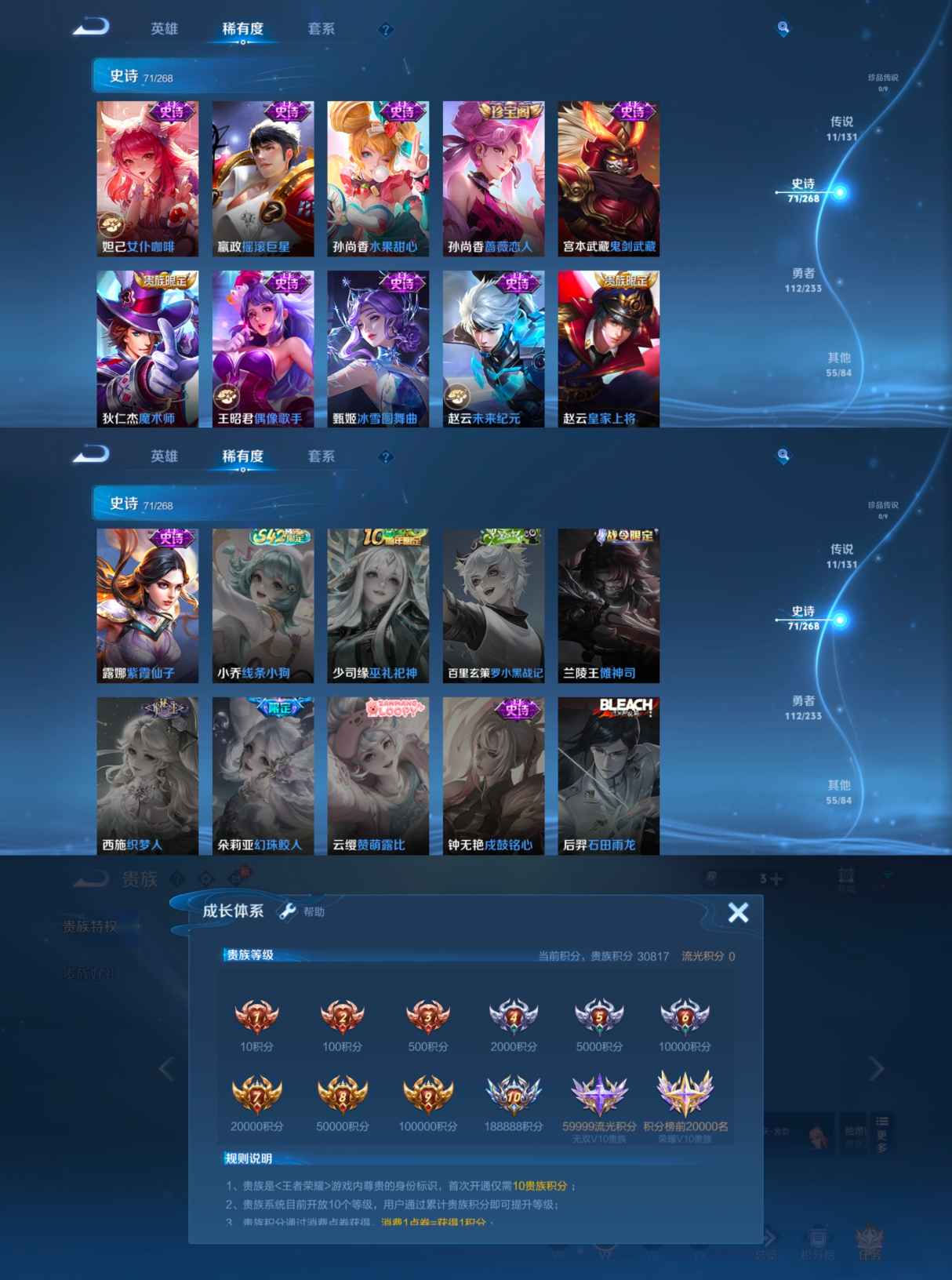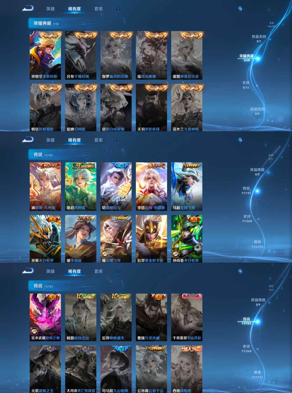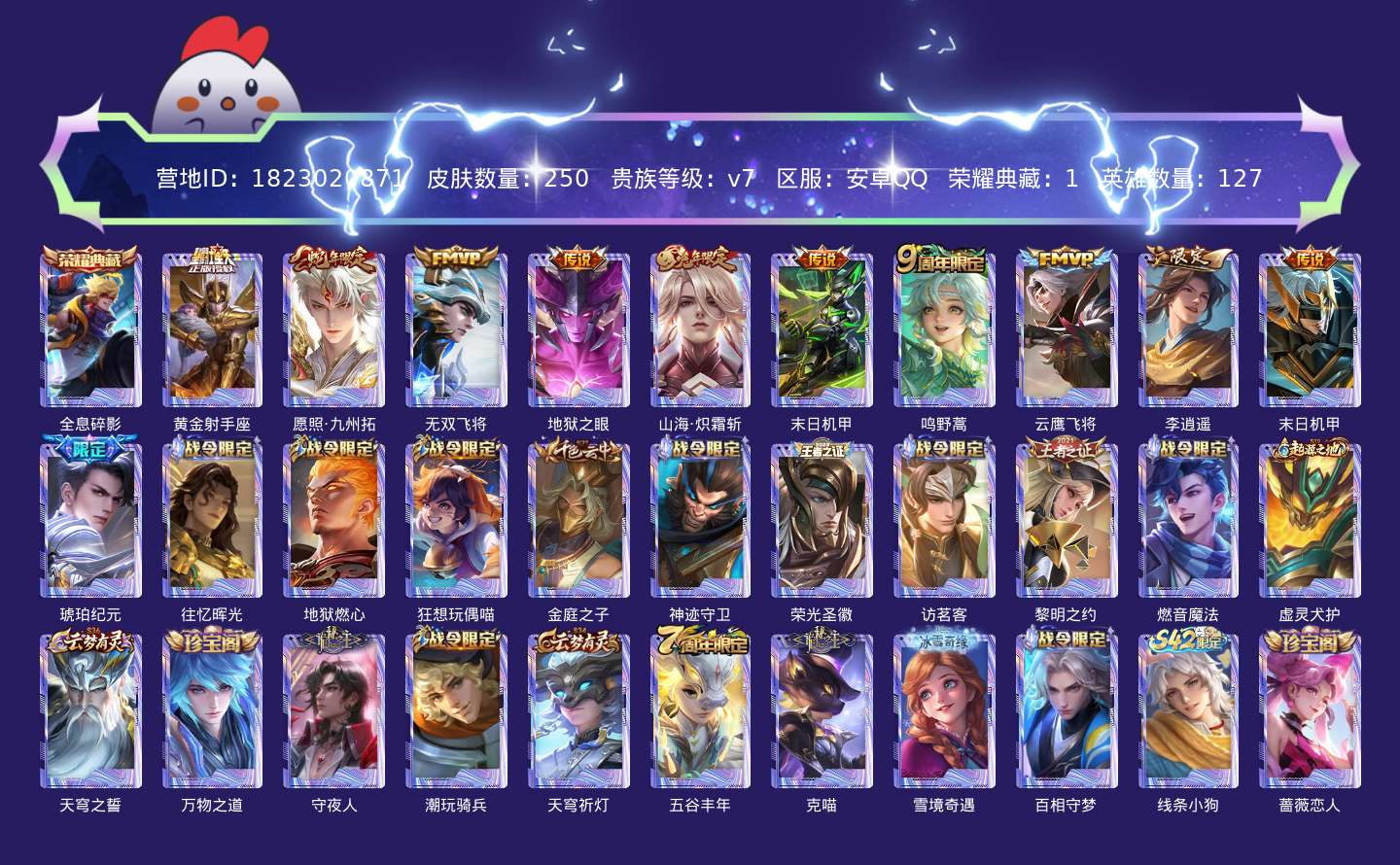 贵族等级:v7皮肤数:250传说品质11 生肖限定4 荣耀典藏1 英雄数:127