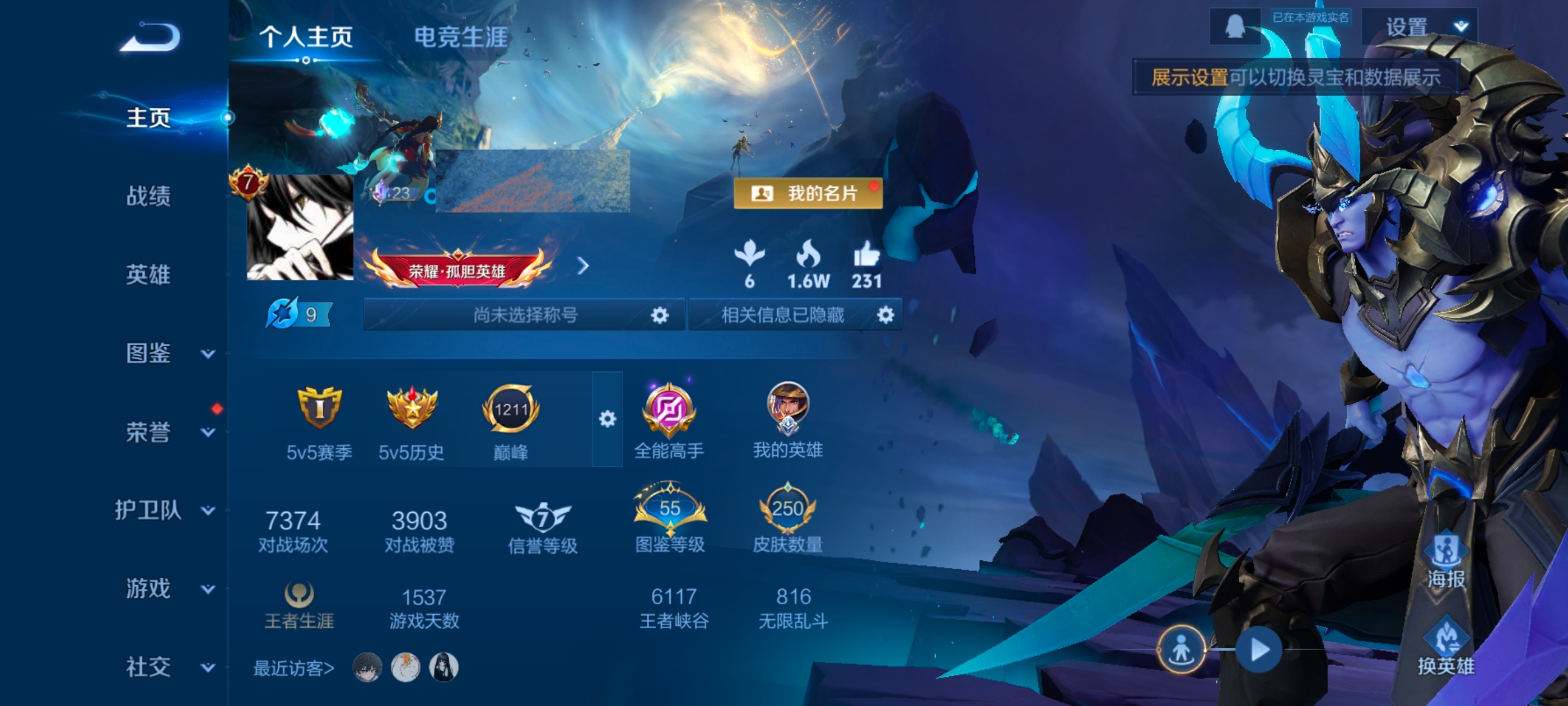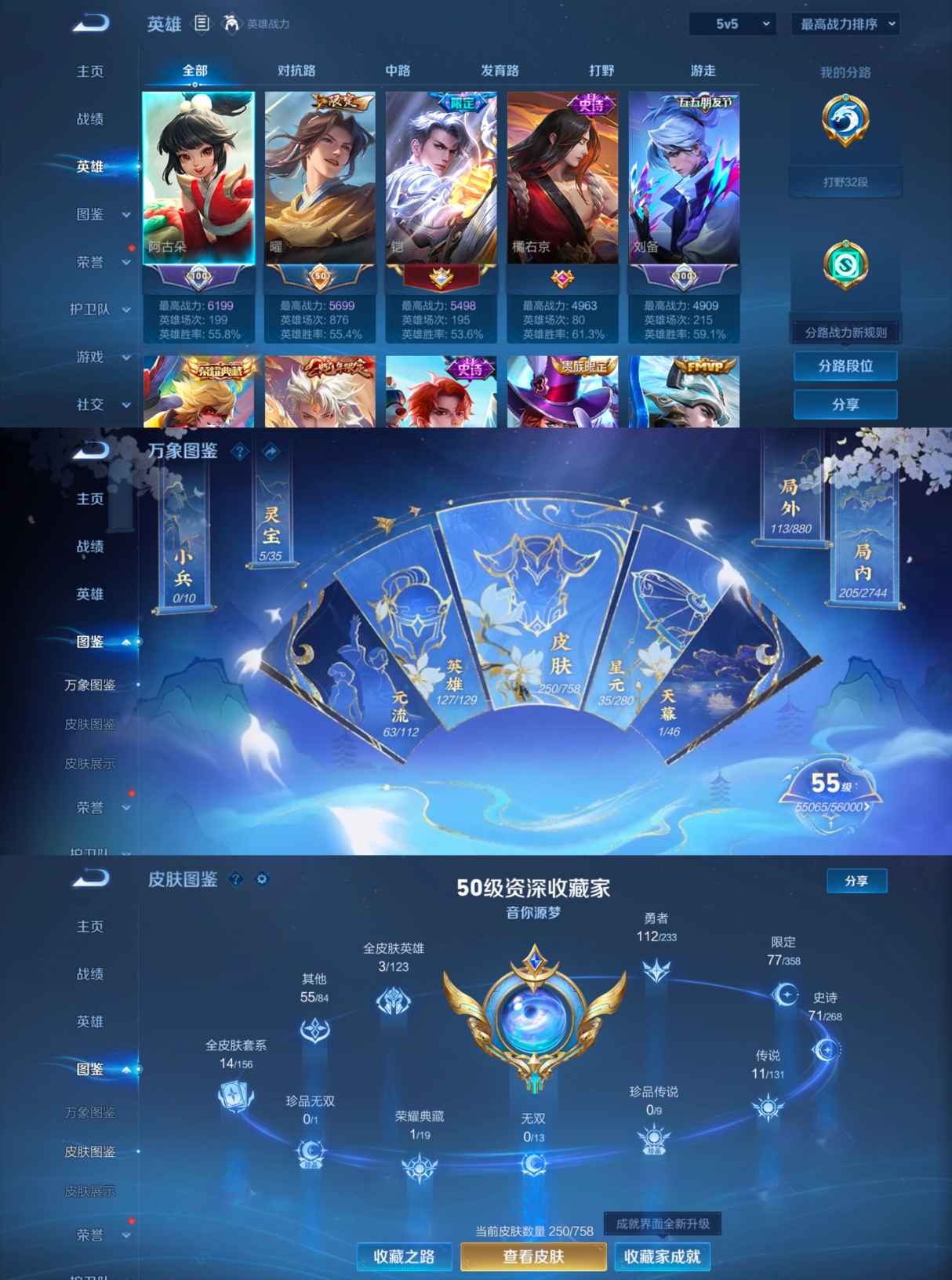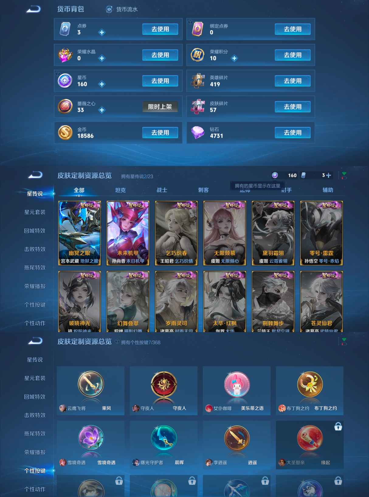 贵族等级:v7皮肤数:250传说品质11 生肖限定4 荣耀典藏1 英雄数:127