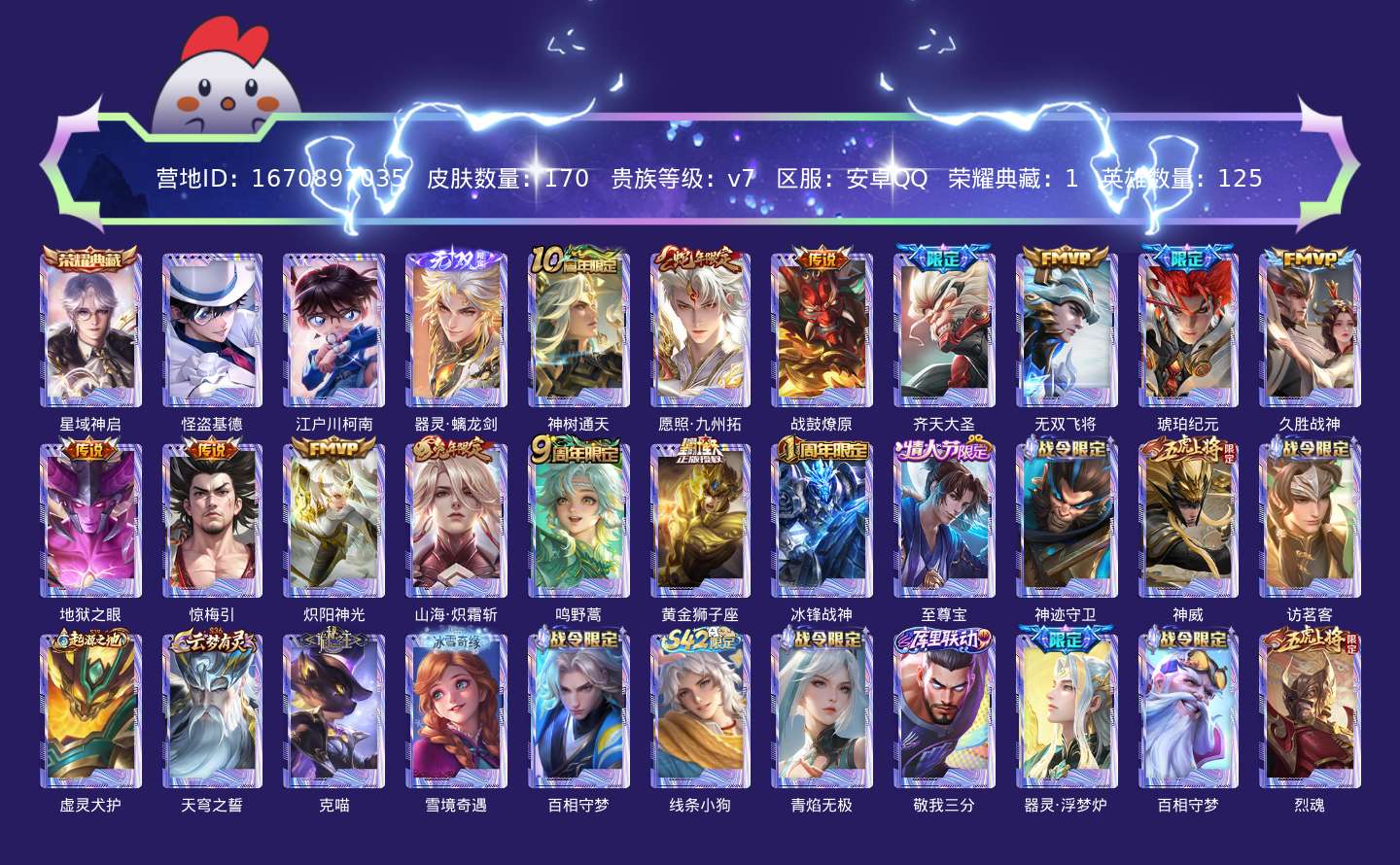 贵族等级:v7皮肤数:170传说品质13 生肖限定3 荣耀典藏1 情人节限定1 珍品传说2 无双1 英雄数:125