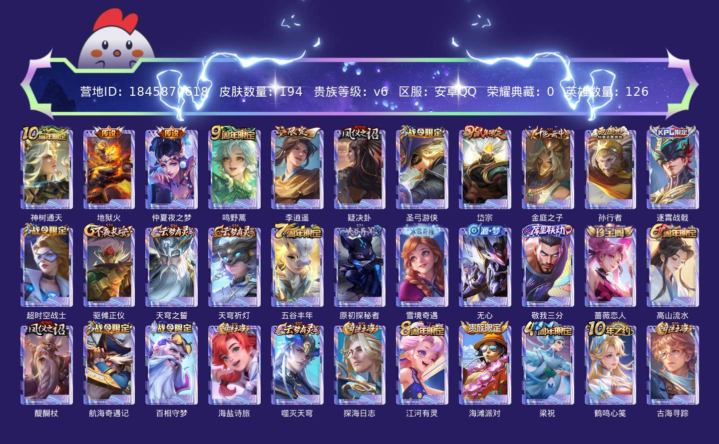 贵族等级:v6皮肤数:197传说品质5 生肖限定2 英雄数:126