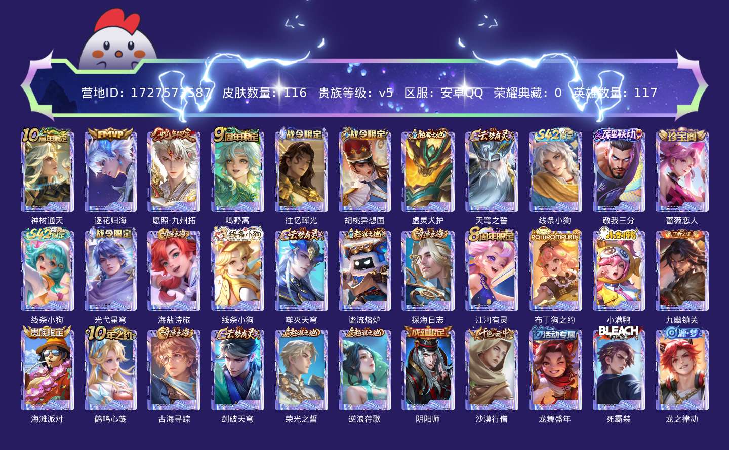 贵族等级:v5皮肤数:116传说品质4 生肖限定1 英雄数:117
