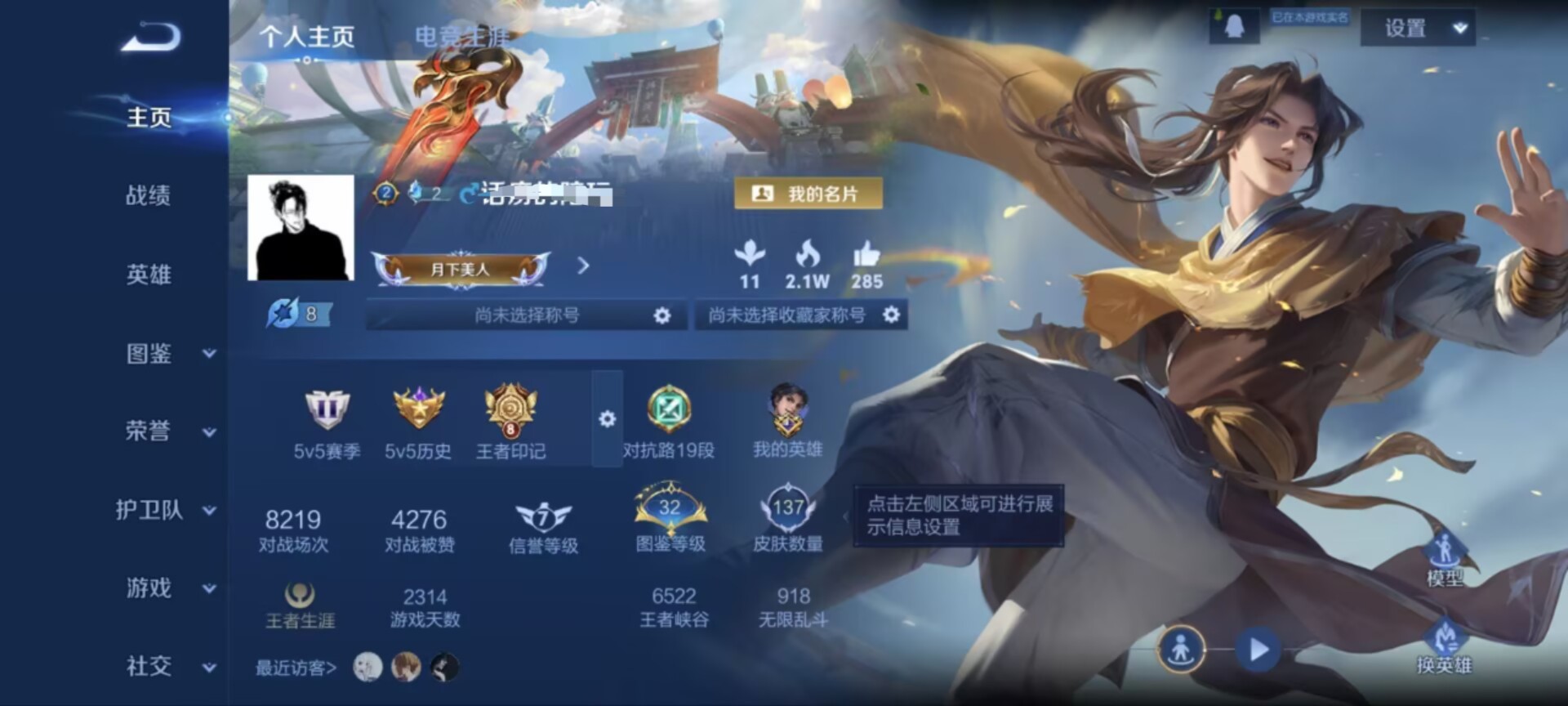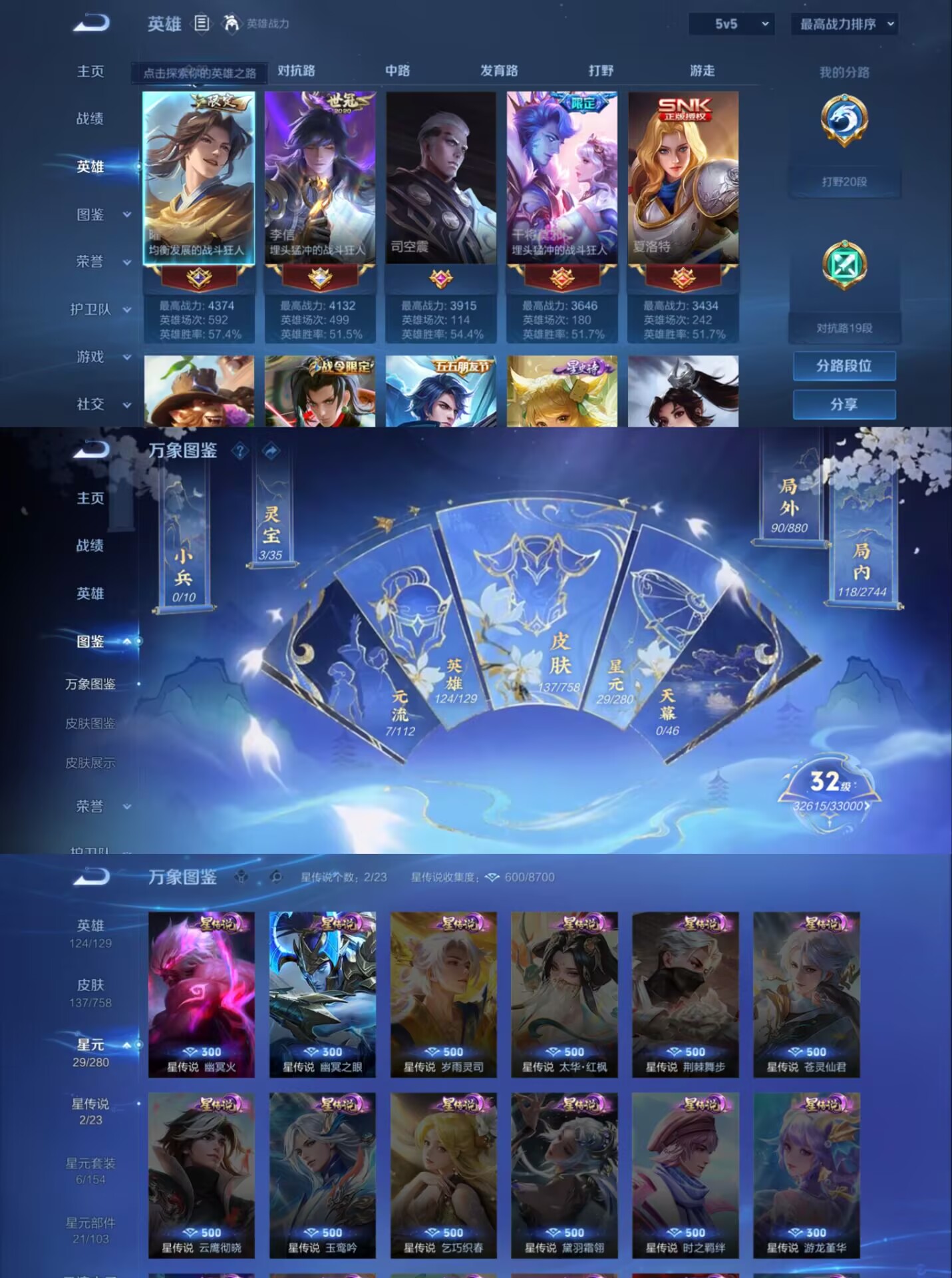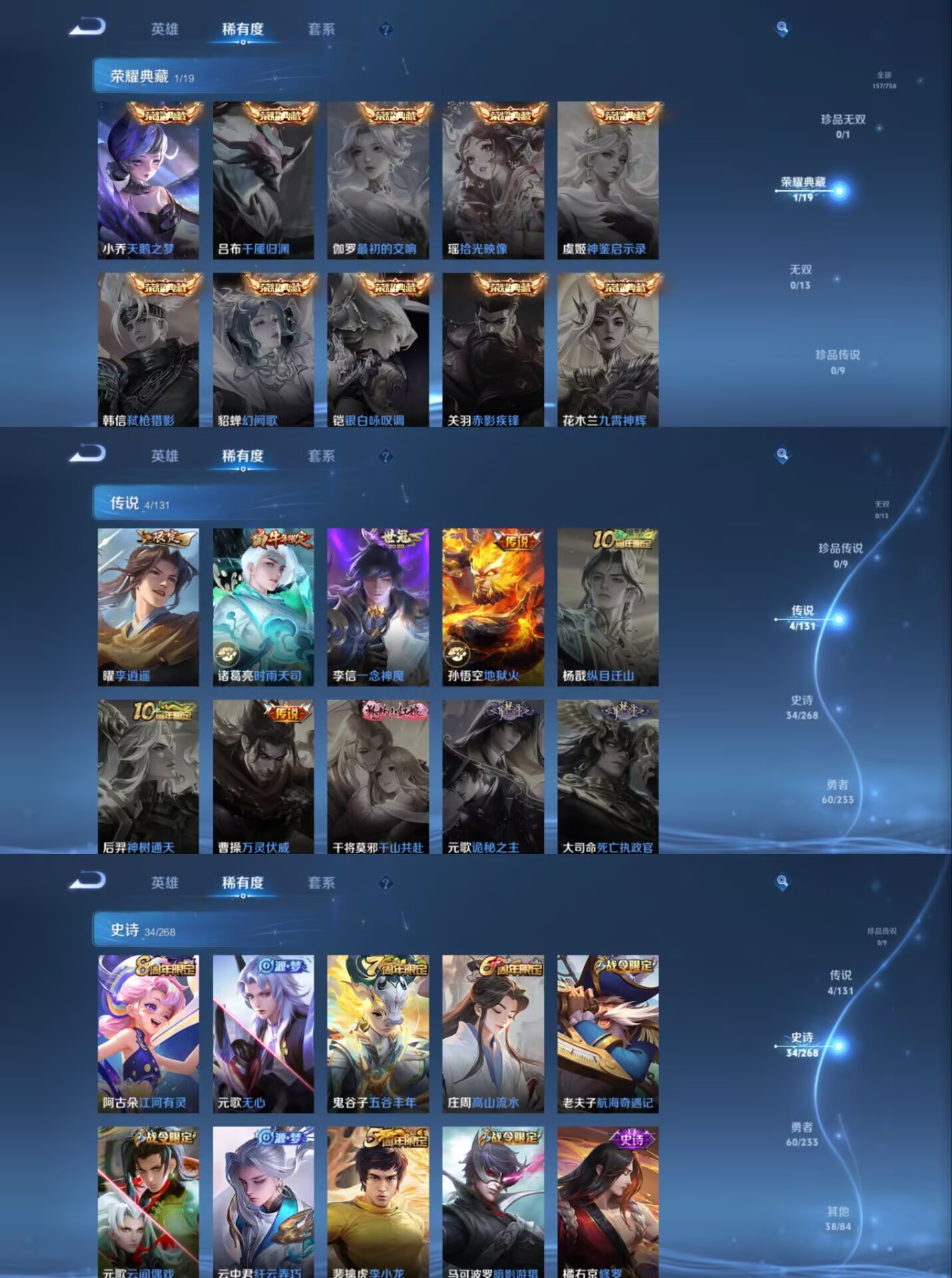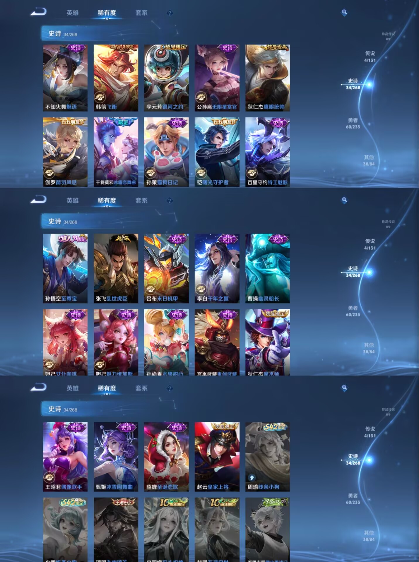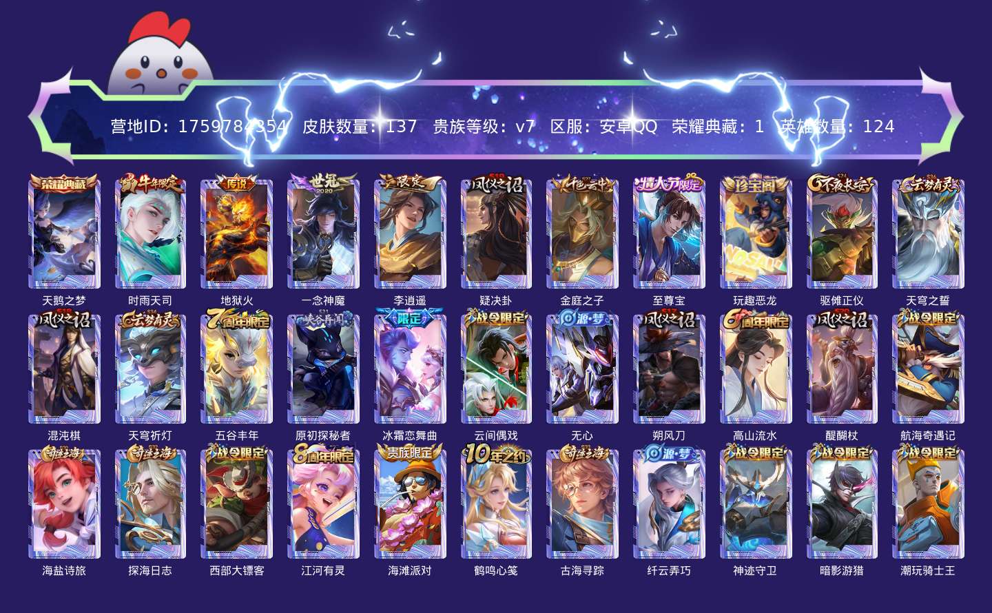 贵族等级:v7皮肤数:137传说品质4 生肖限定2 情人节限定1 荣耀典藏1 英雄数:124