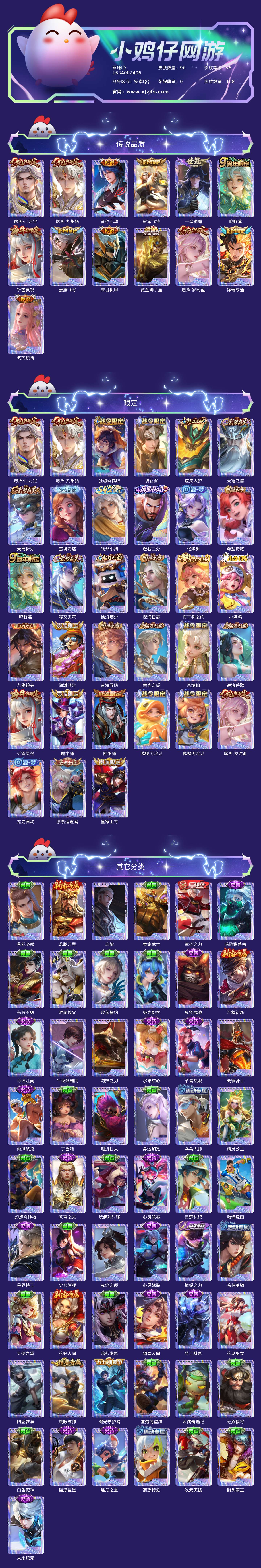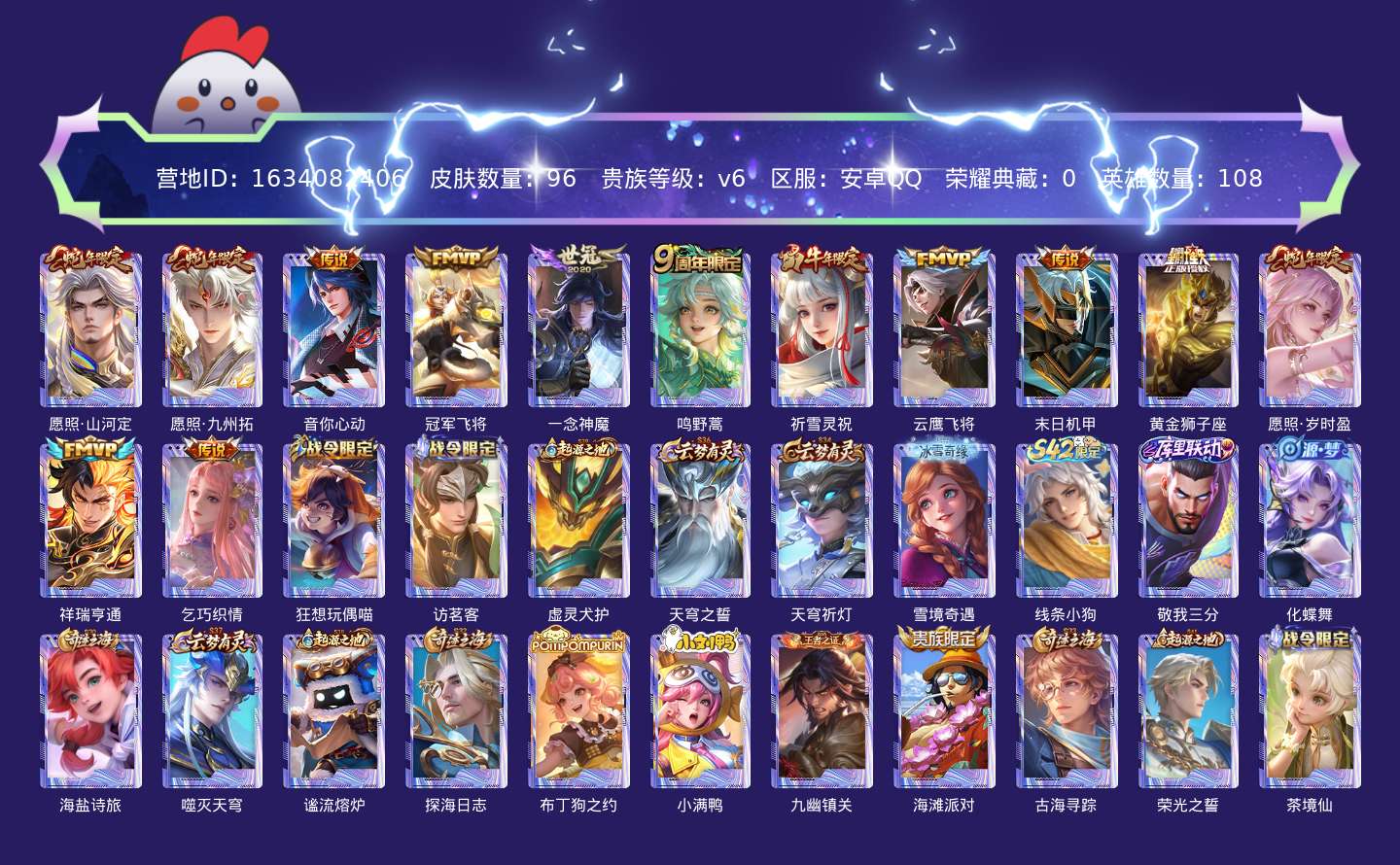 贵族等级:v6皮肤数:96传说品质13 生肖限定4 英雄数:108