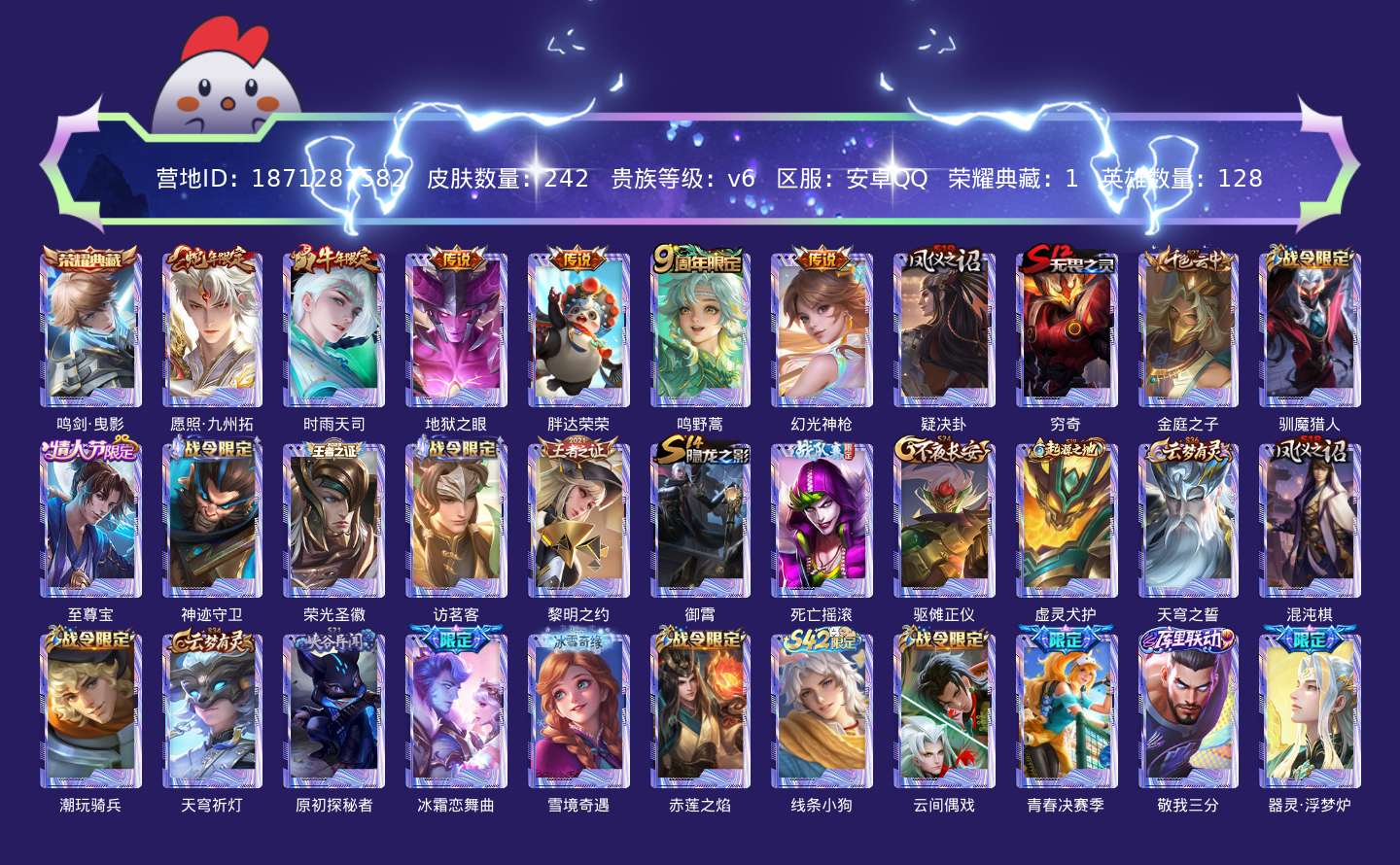 贵族等级:v6皮肤数:242传说品质6 生肖限定3 情人节限定1 荣耀典藏1 英雄数:128