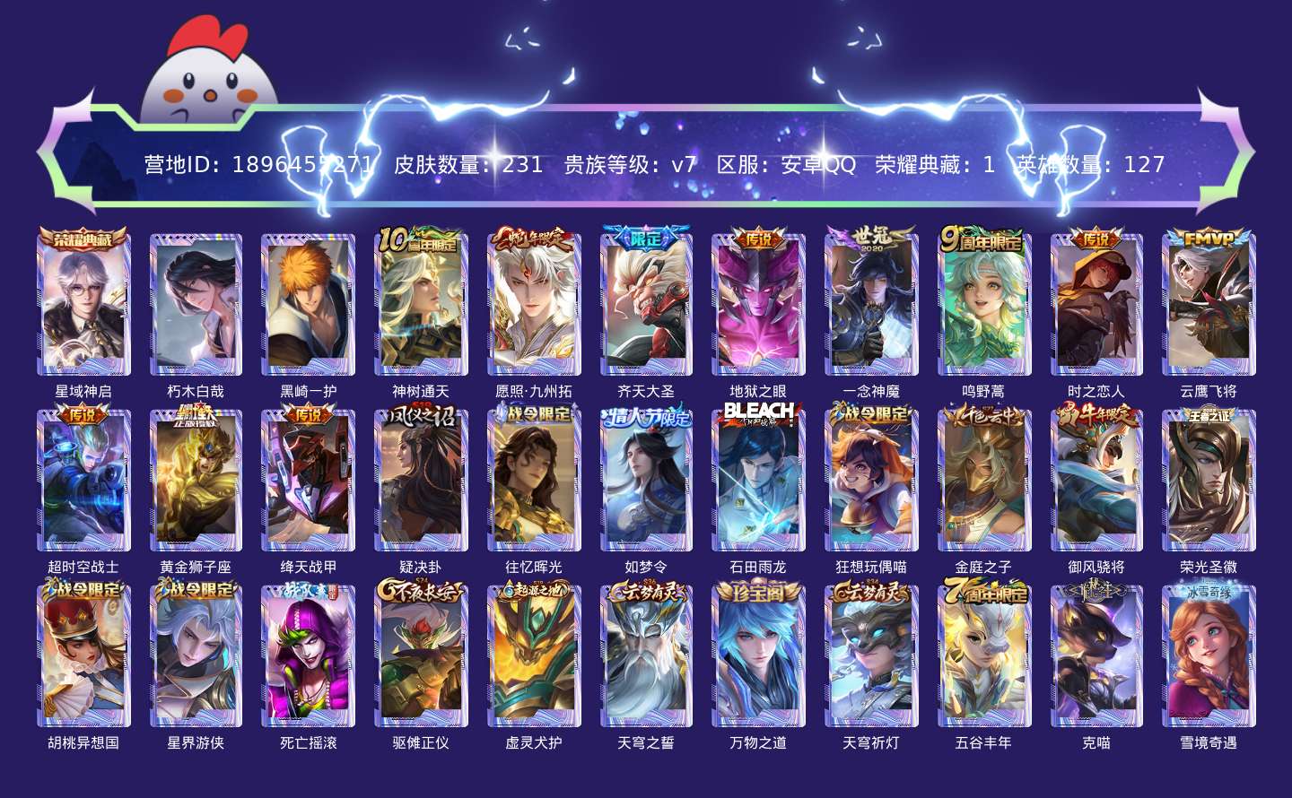 贵族等级:v7皮肤数:231情人节限定1 传说品质11 生肖限定4 荣耀典藏1 珍品传说2 英雄数:127