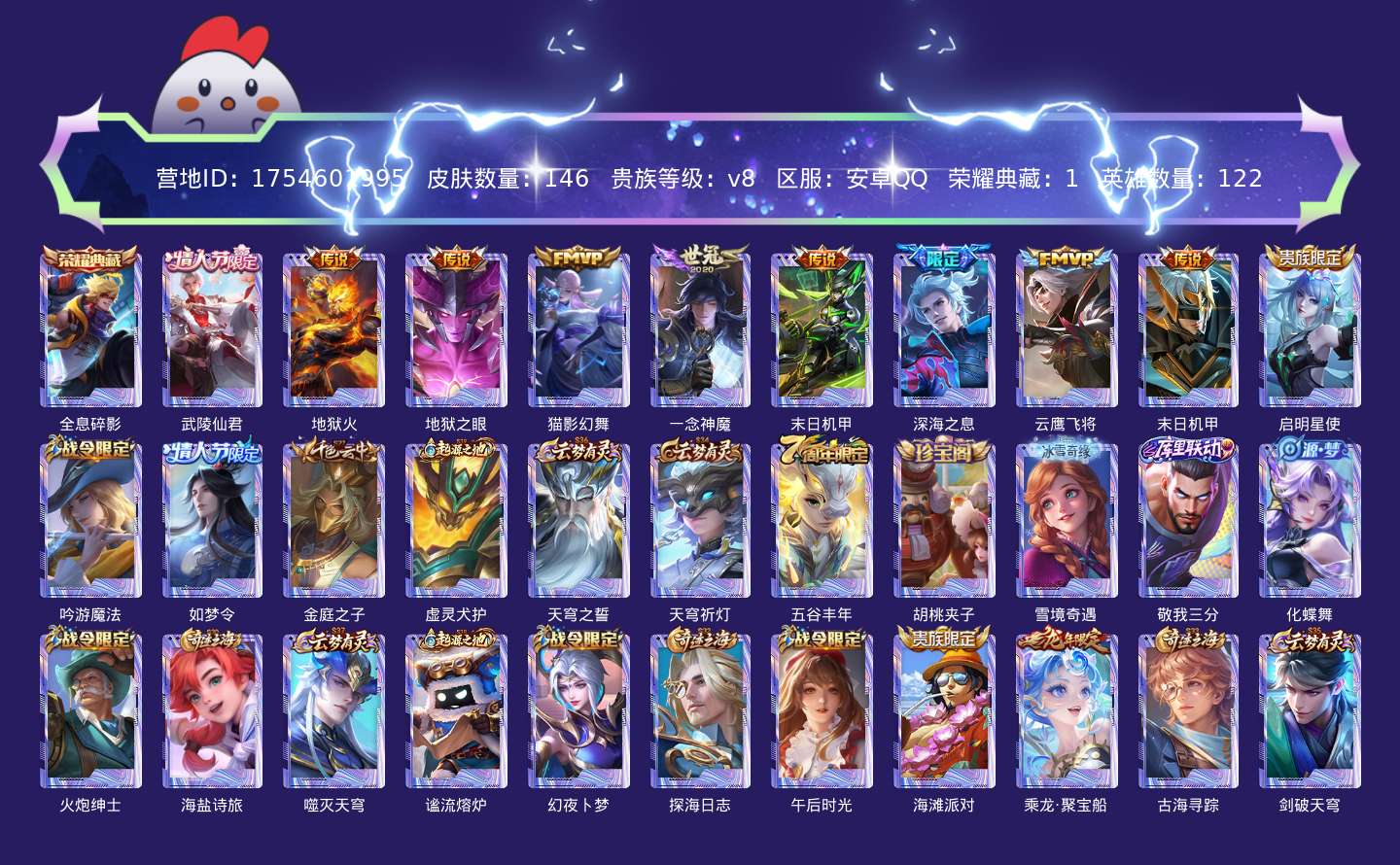 贵族等级:v8皮肤数:146情人节限定2 传说品质10 荣耀典藏1 生肖限定2 英雄数:122