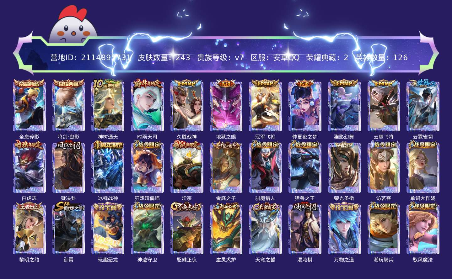 贵族等级:v7皮肤数:243传说品质10 生肖限定3 荣耀典藏2 英雄数:126
