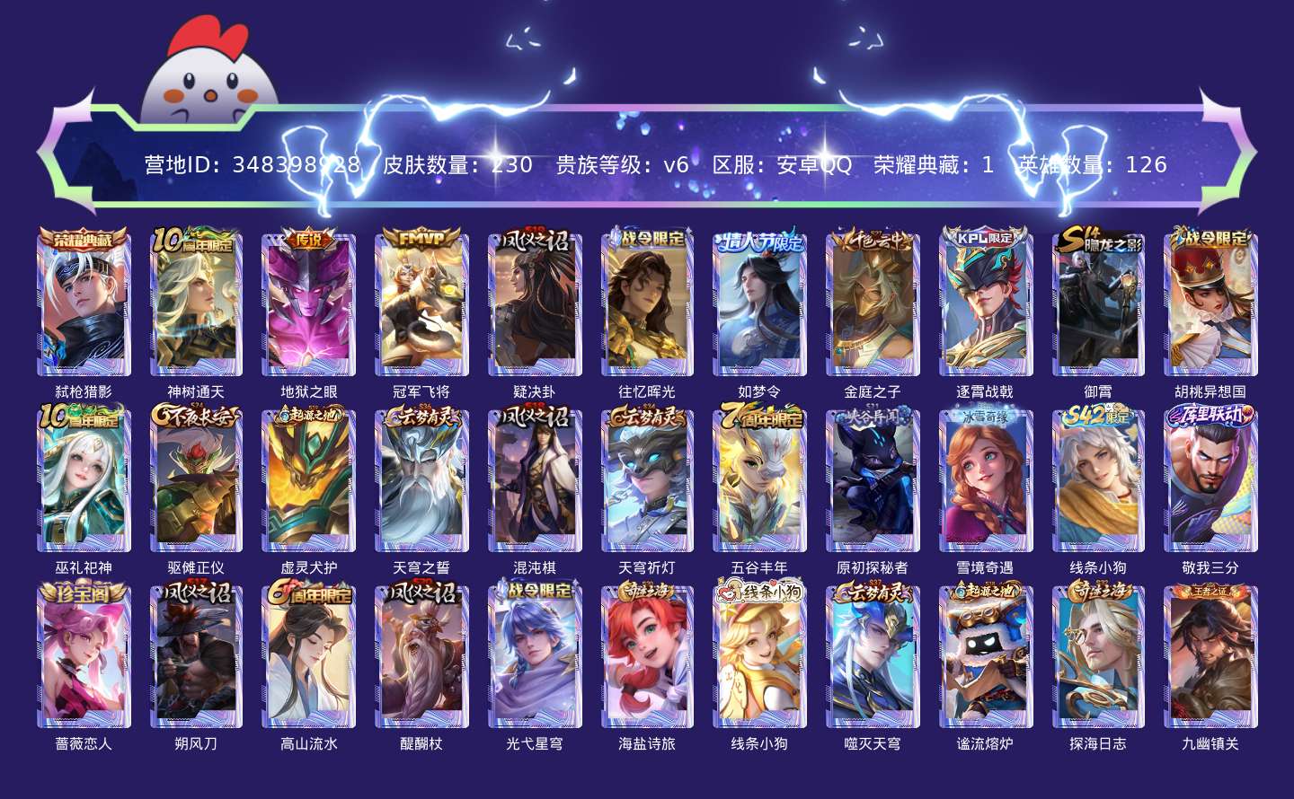 贵族等级:v6皮肤数:230情人节限定1 传说品质3 生肖限定1 荣耀典藏1 英雄数:126