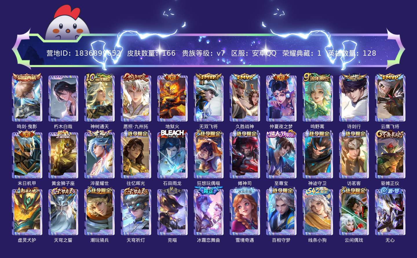 贵族等级:v7皮肤数:166传说品质12 生肖限定1 情人节限定1 珍品传说1 荣耀典藏1 英雄数:128
