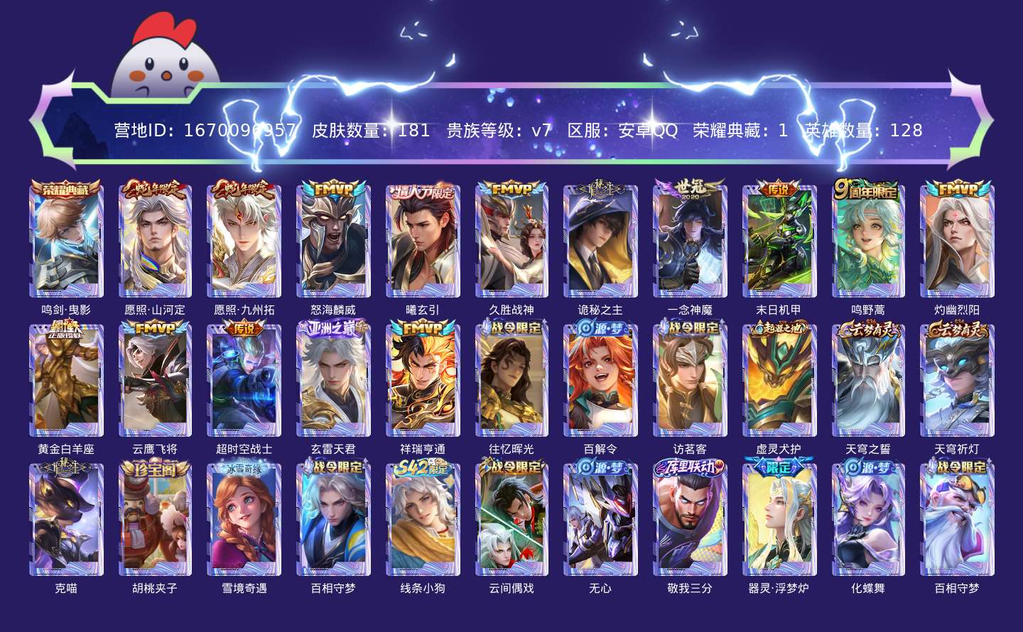 贵族等级:v7皮肤数:181传说品质15 生肖限定3 情人节限定1 荣耀典藏1 英雄数:128