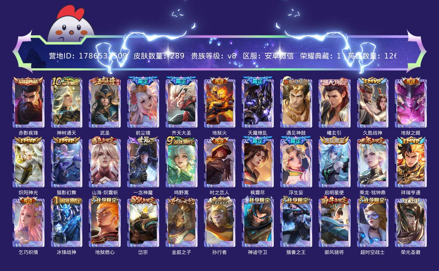 贵族等级:v8皮肤数:289传说品质22 荣耀典藏1 生肖限定5 情人节限定1 英雄数:126