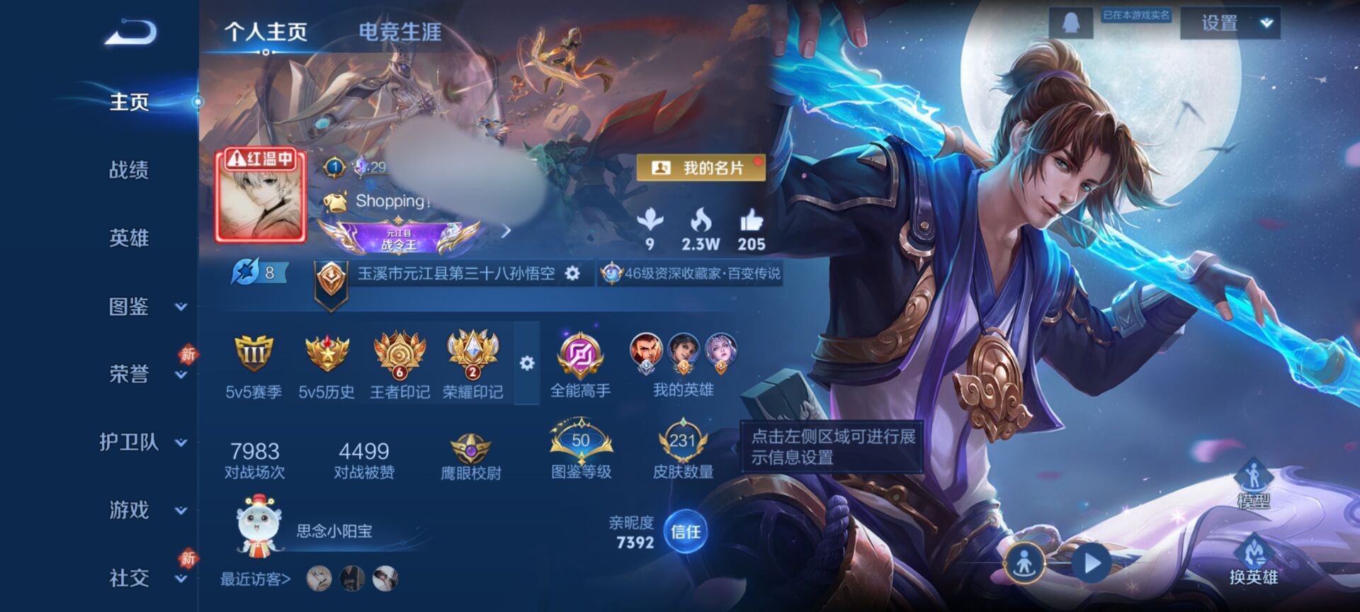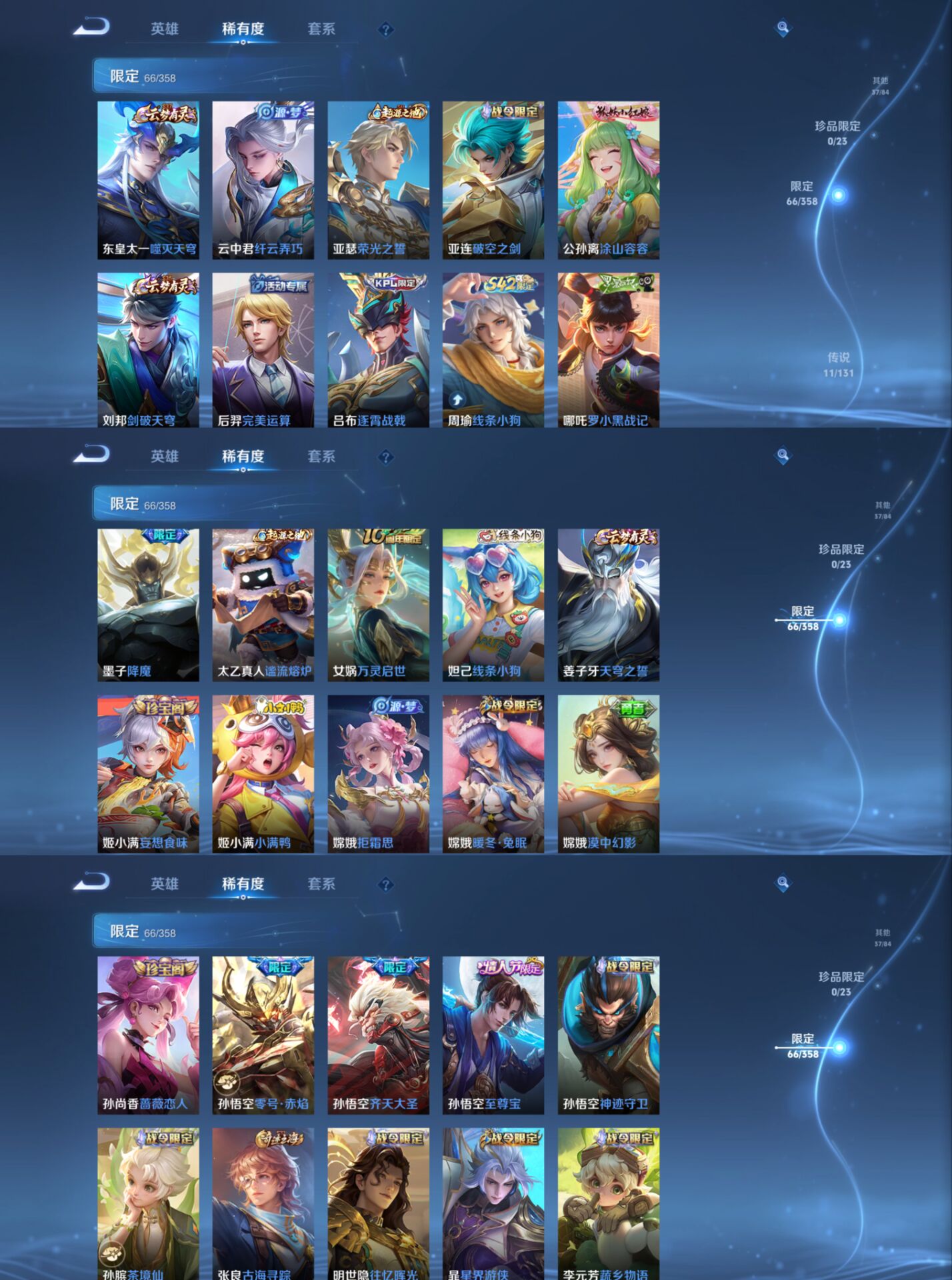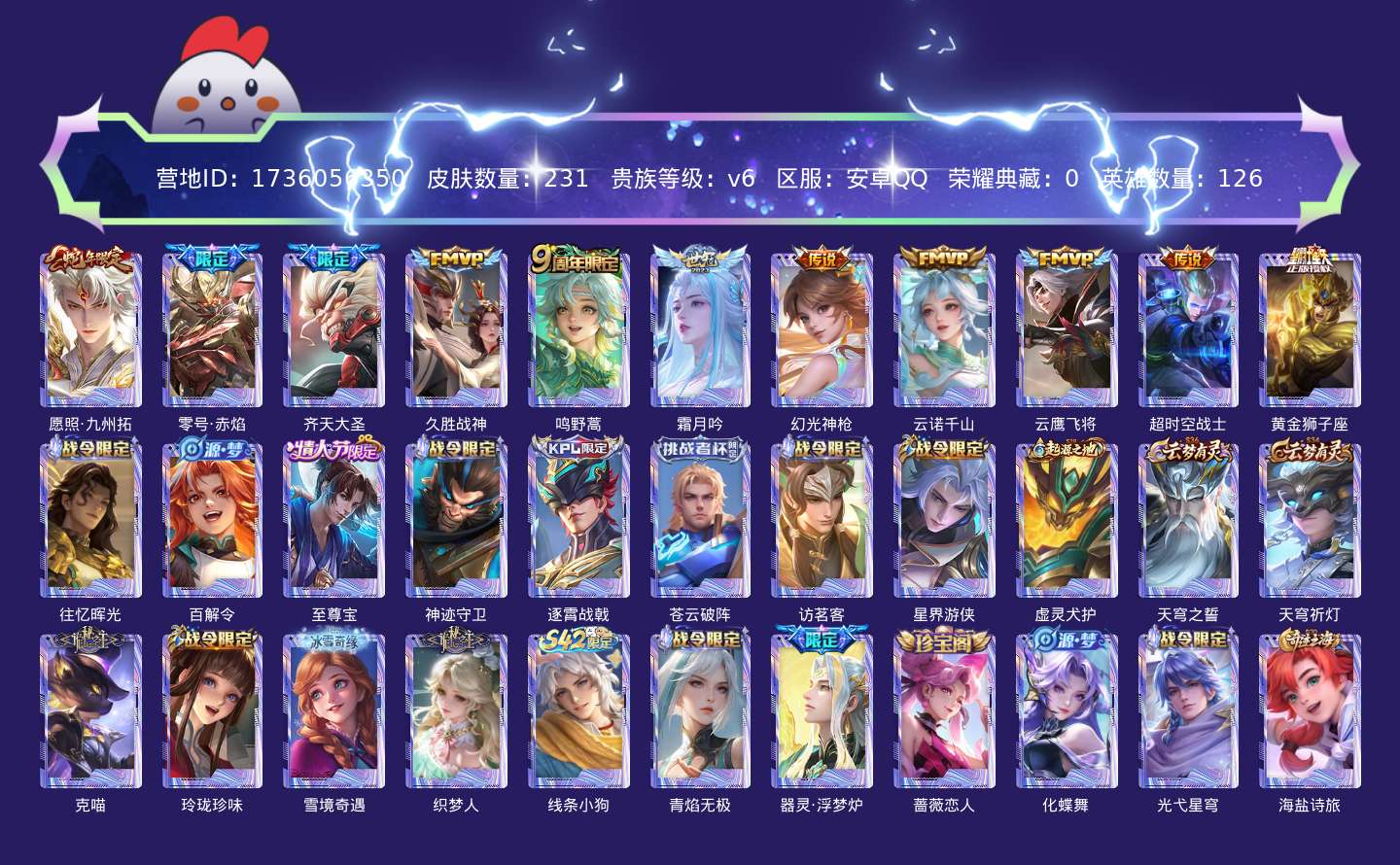 贵族等级:v6皮肤数:231传说品质11 生肖限定1 情人节限定1 英雄数:126