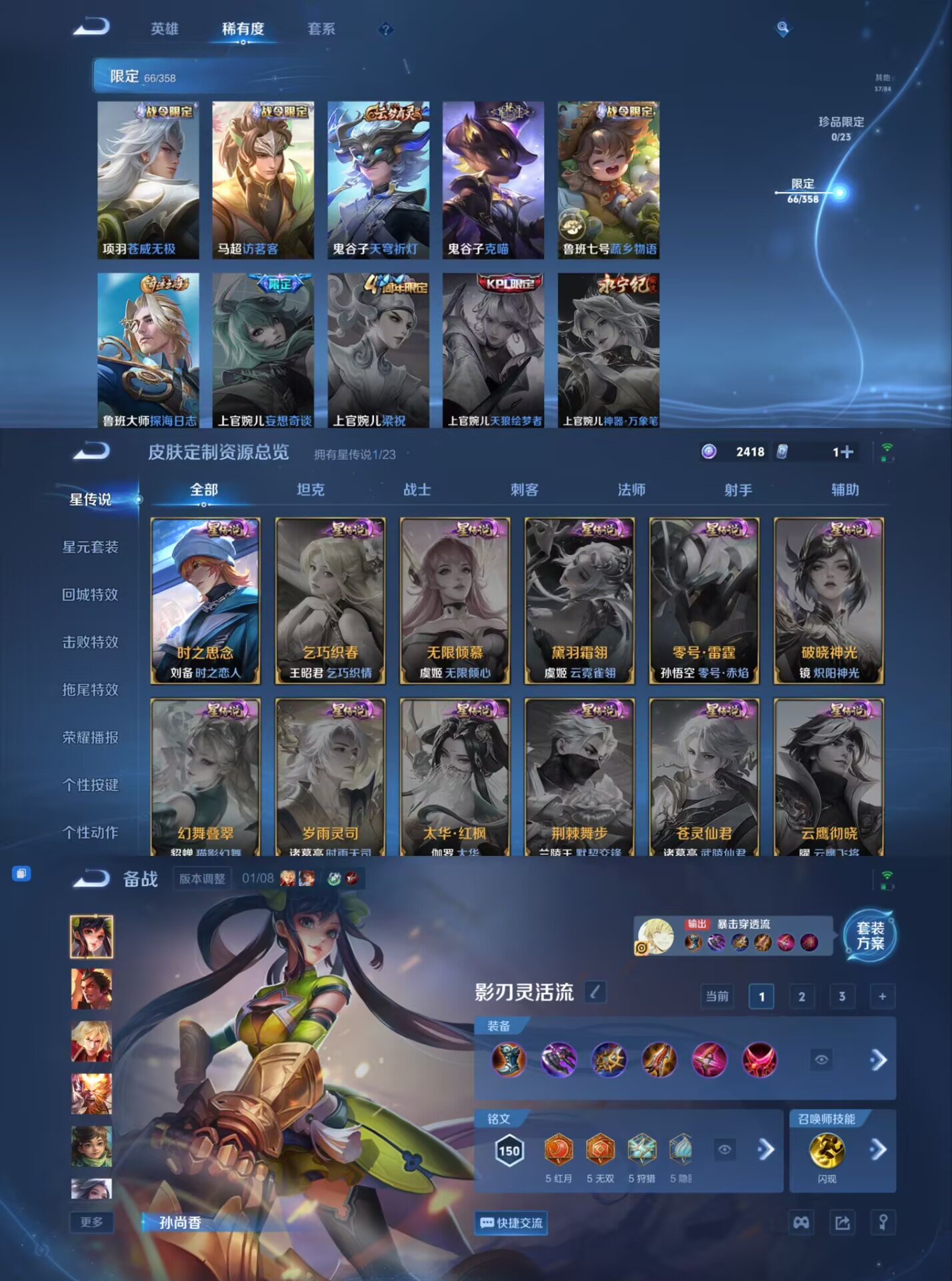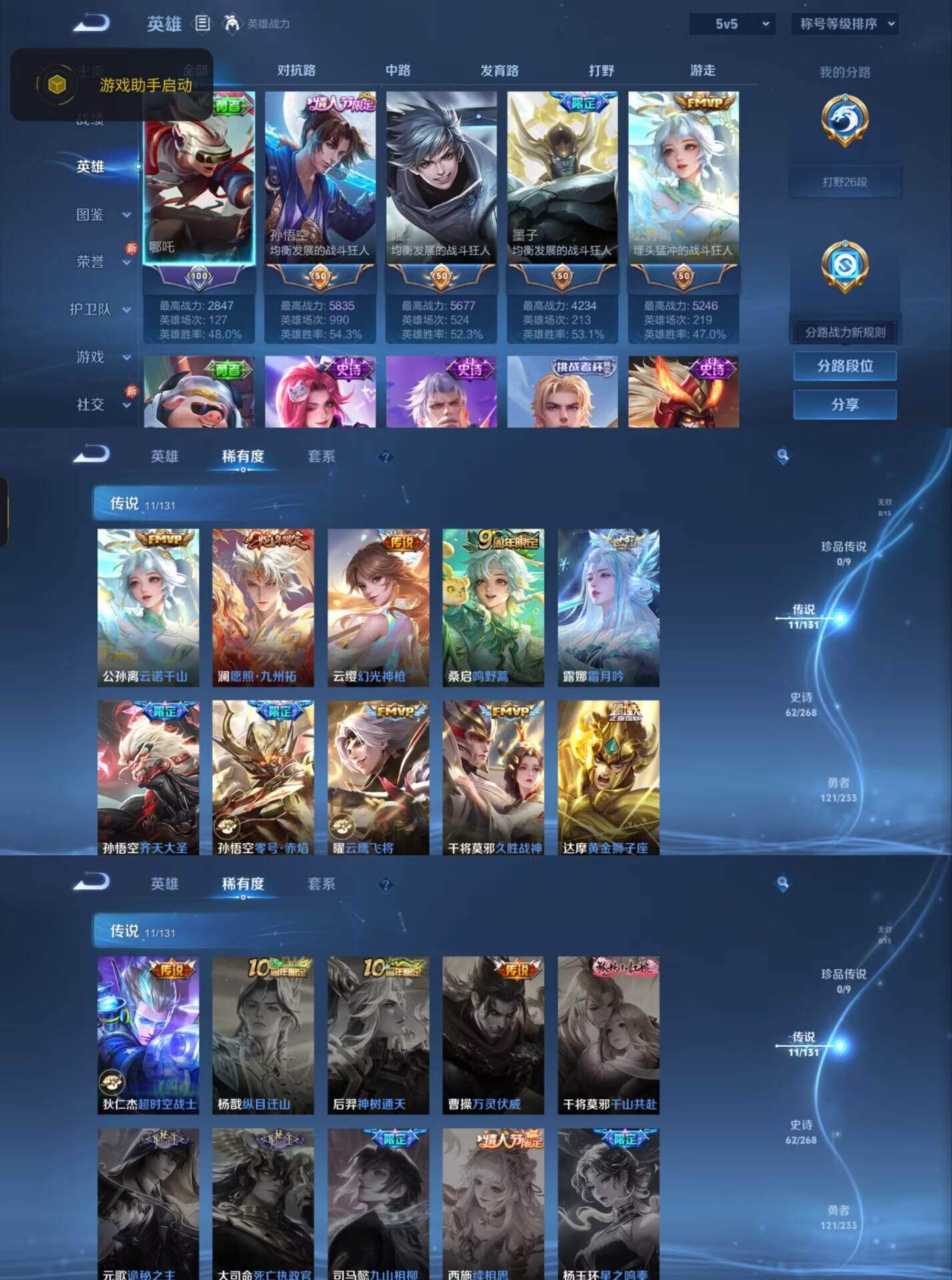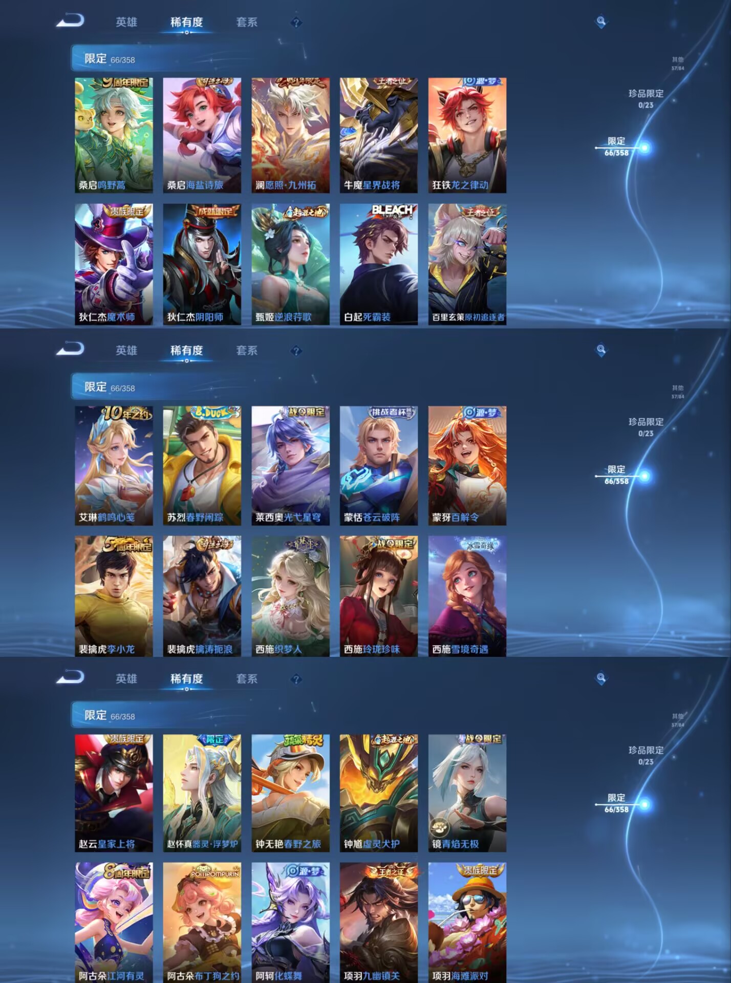 贵族等级:v6皮肤数:231传说品质11 生肖限定1 情人节限定1 英雄数:126