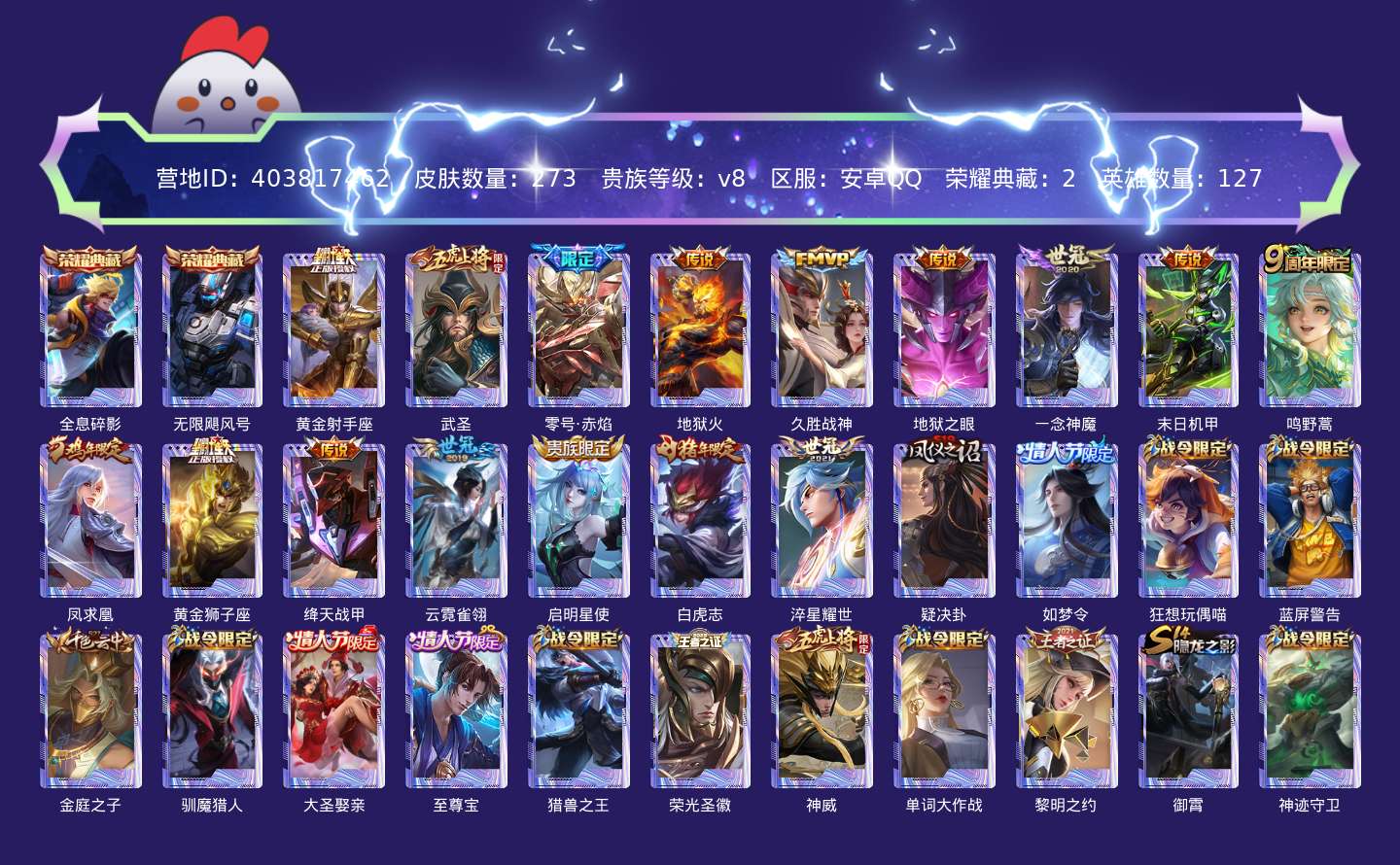贵族等级:v8皮肤数:273传说品质16 情人节限定3 荣耀典藏2 生肖限定4 英雄数:127