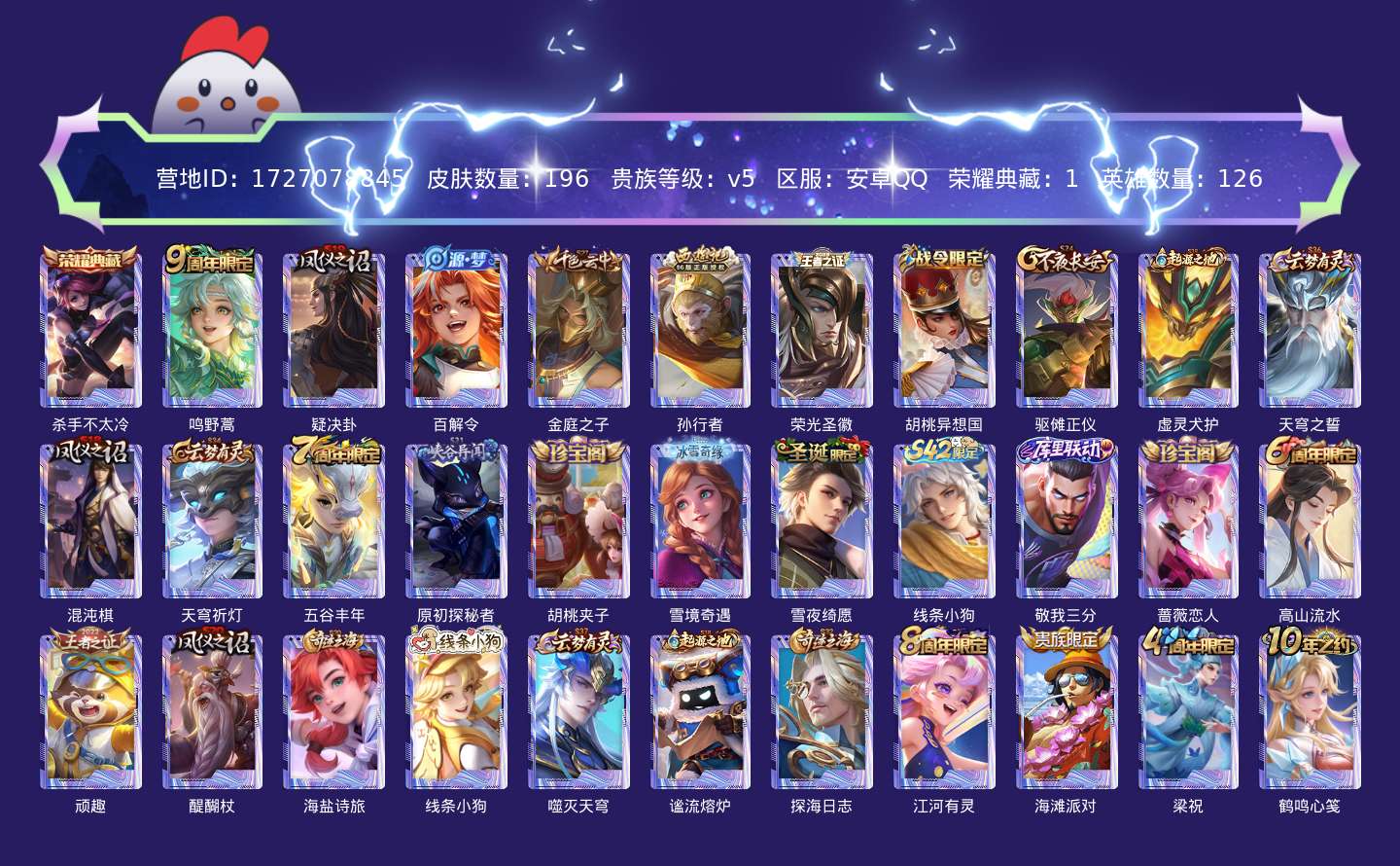 贵族等级:v5皮肤数:196荣耀典藏1 传说品质1 英雄数:126