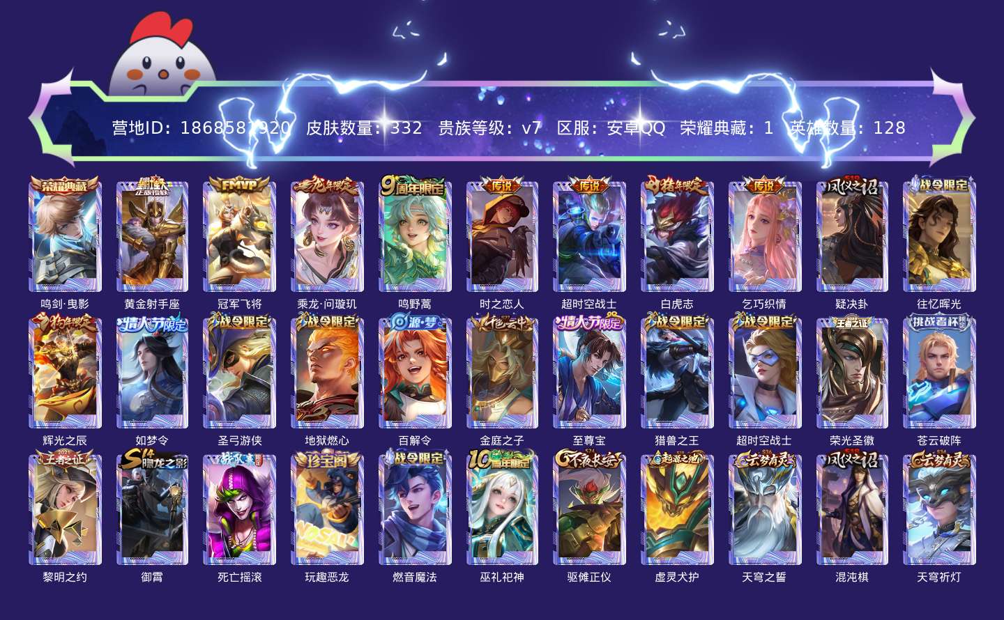 贵族等级:v7皮肤数:332生肖限定4 传说品质8 情人节限定2 荣耀典藏1 英雄数:128