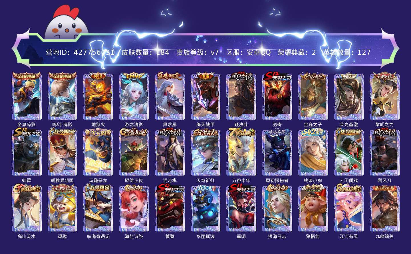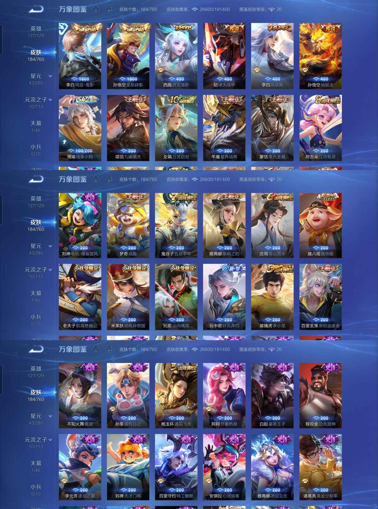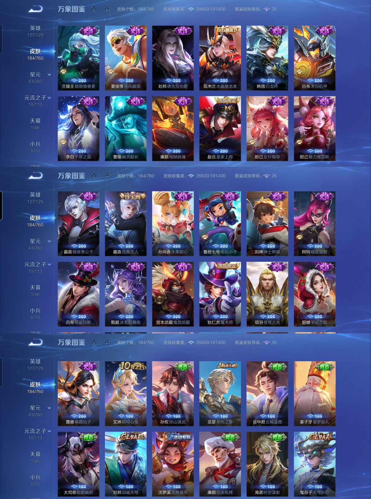 贵族等级:v7皮肤数:187荣耀典藏2 传说品质4 生肖限定1 英雄数:127