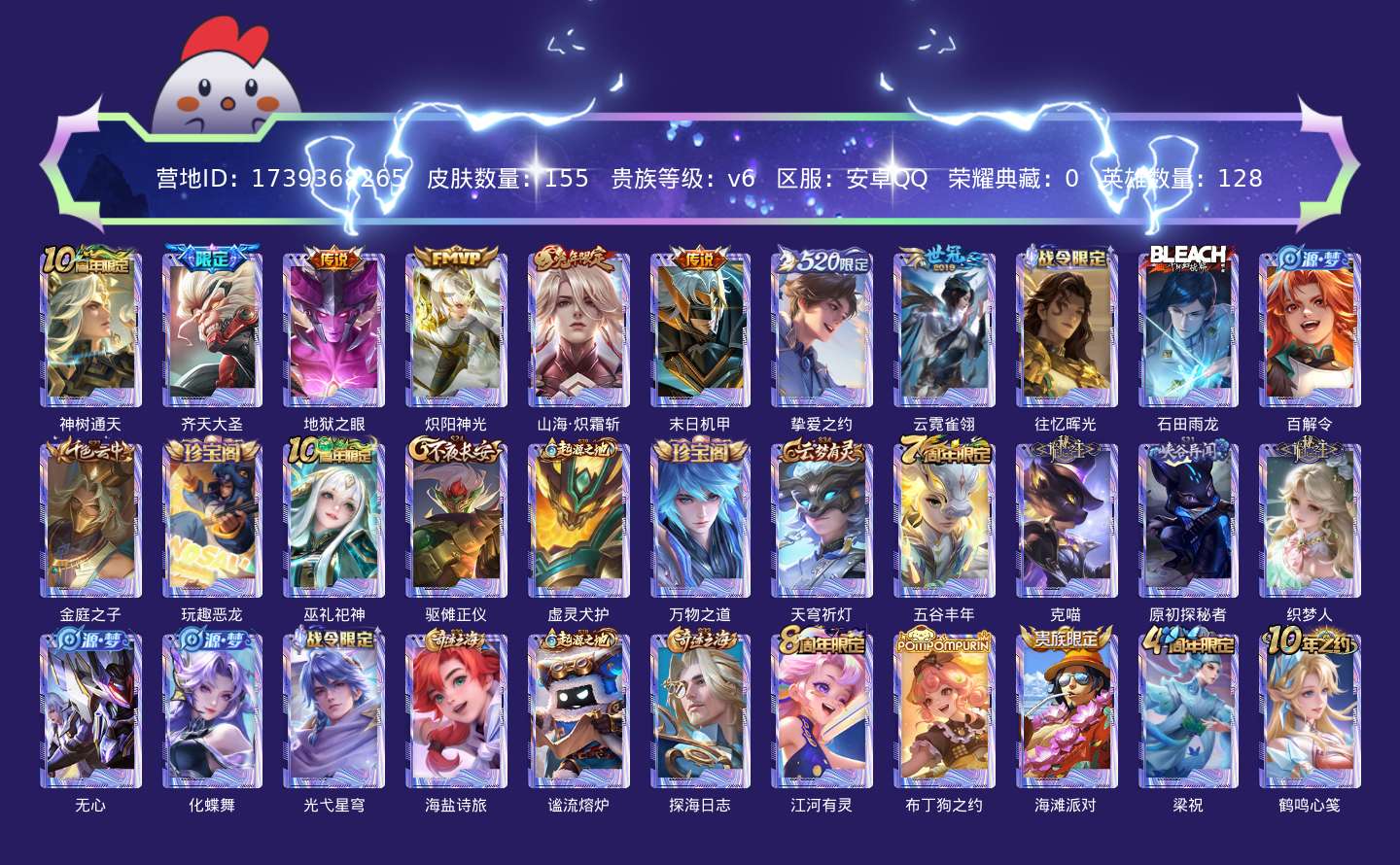 贵族等级:v6皮肤数:155传说品质8 生肖限定1 英雄数:128