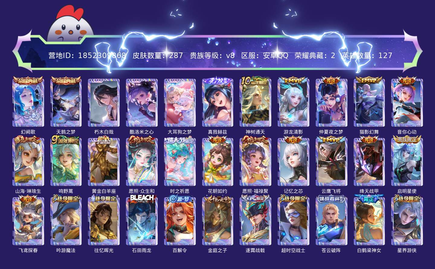贵族等级:v8皮肤数:287传说品质17 珍品传说3 情人节限定5 荣耀典藏2 生肖限定5 无双1 英雄数:127