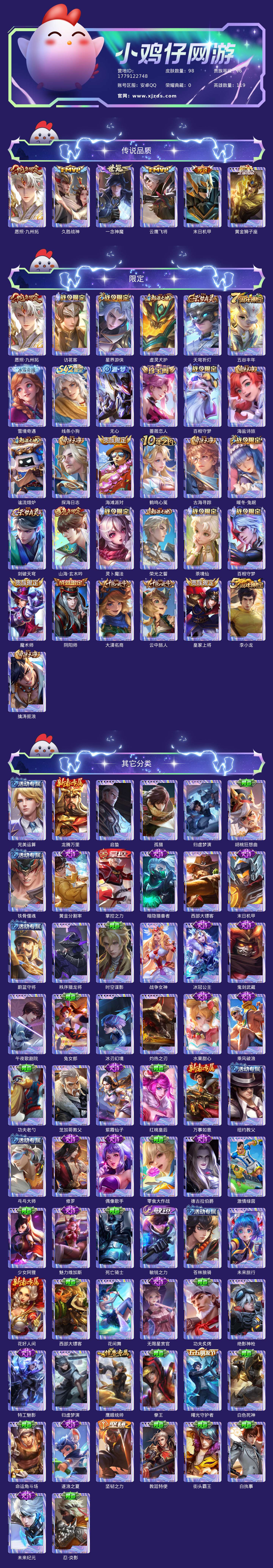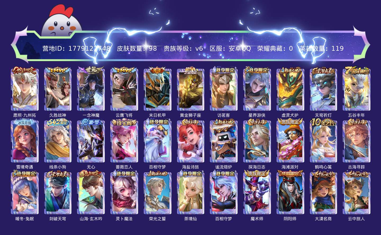 贵族等级:v6皮肤数:98传说品质6 生肖限定2 英雄数:119