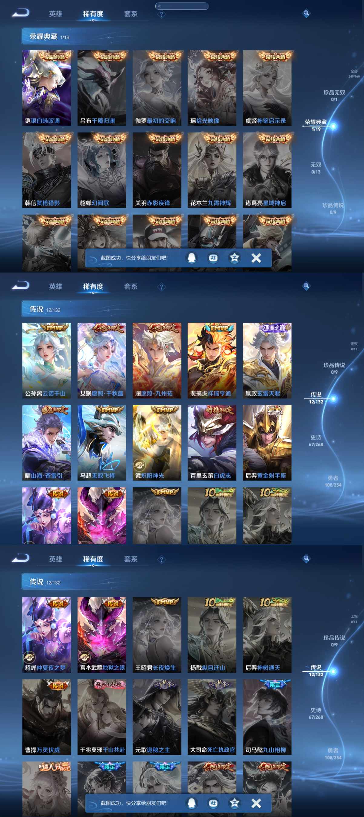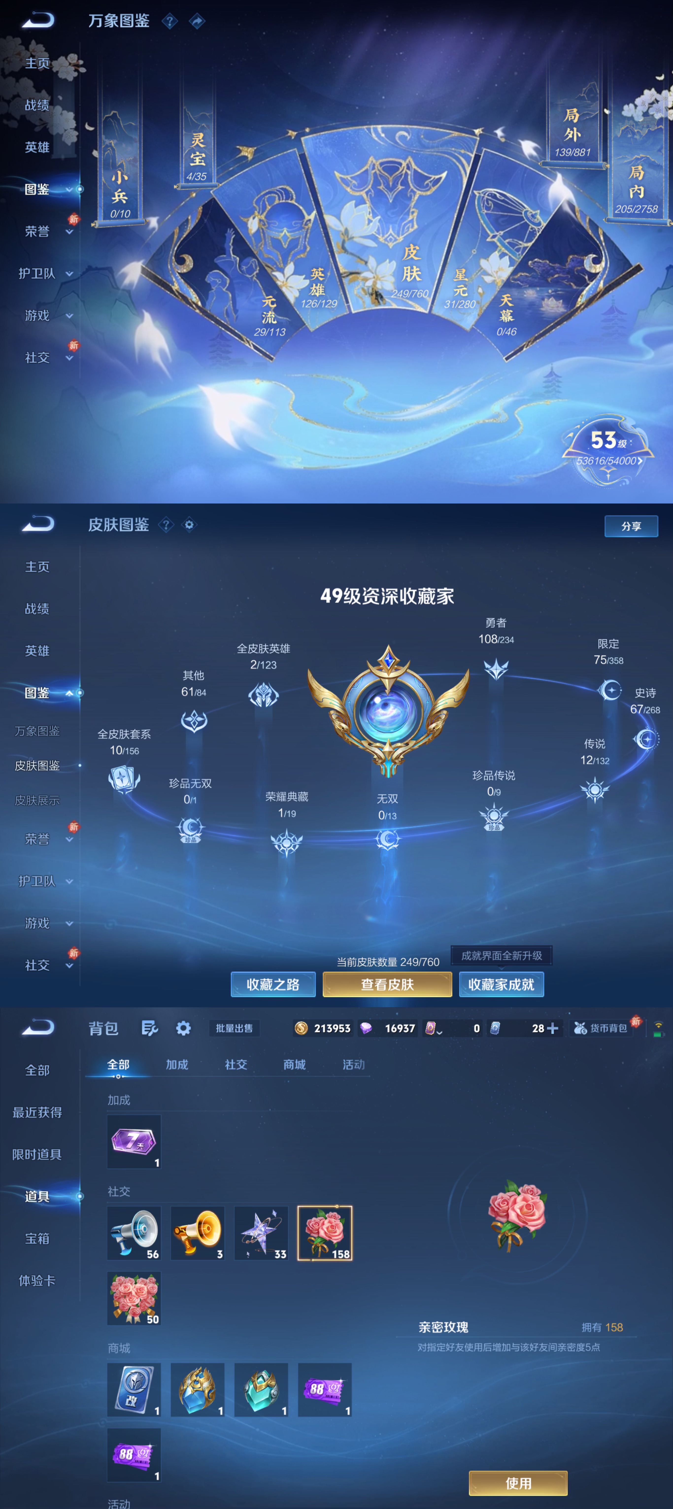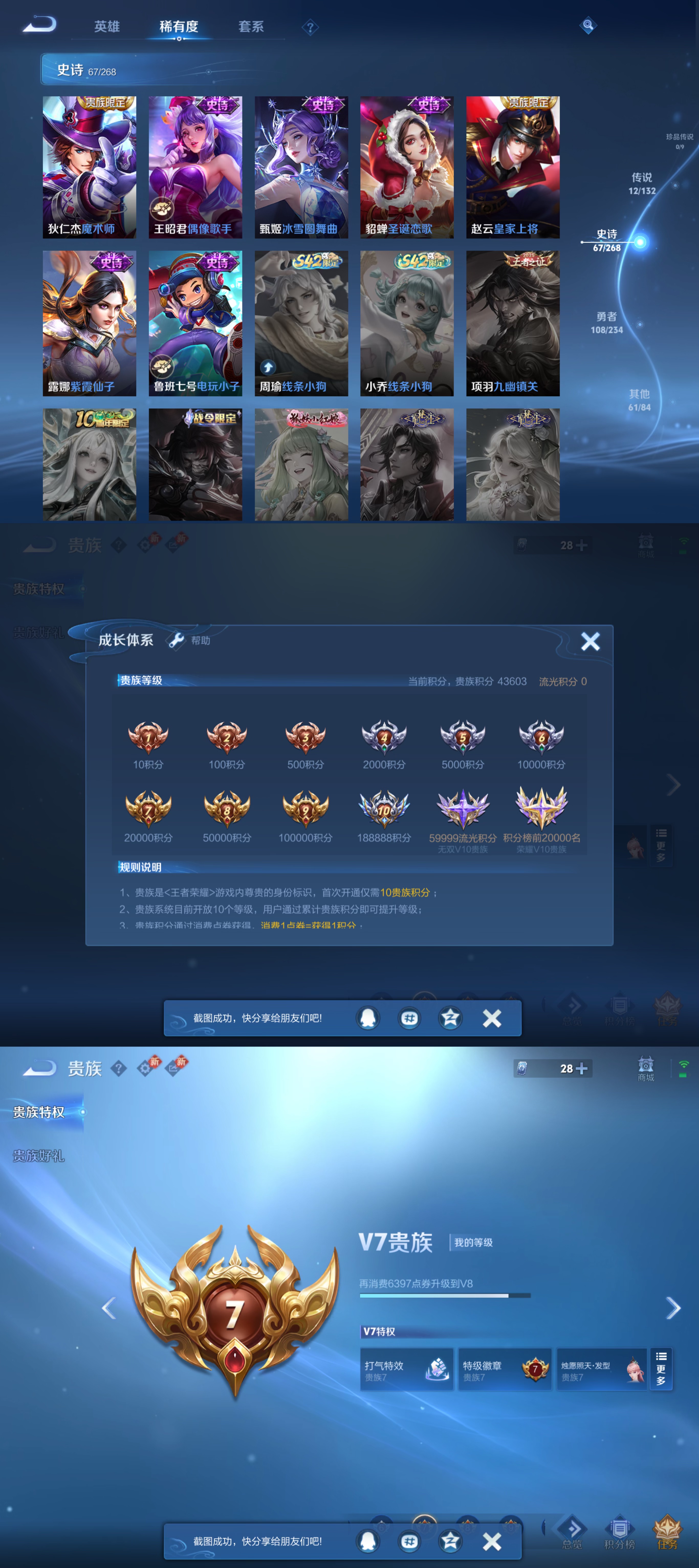 贵族等级:v7皮肤数:249传说品质12 生肖限定8 情人节限定2 荣耀典藏1 英雄数:126