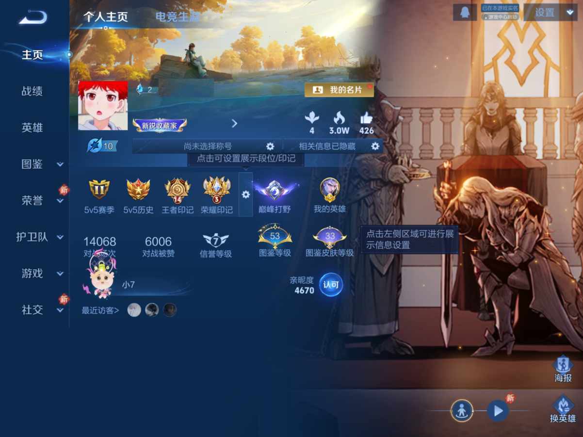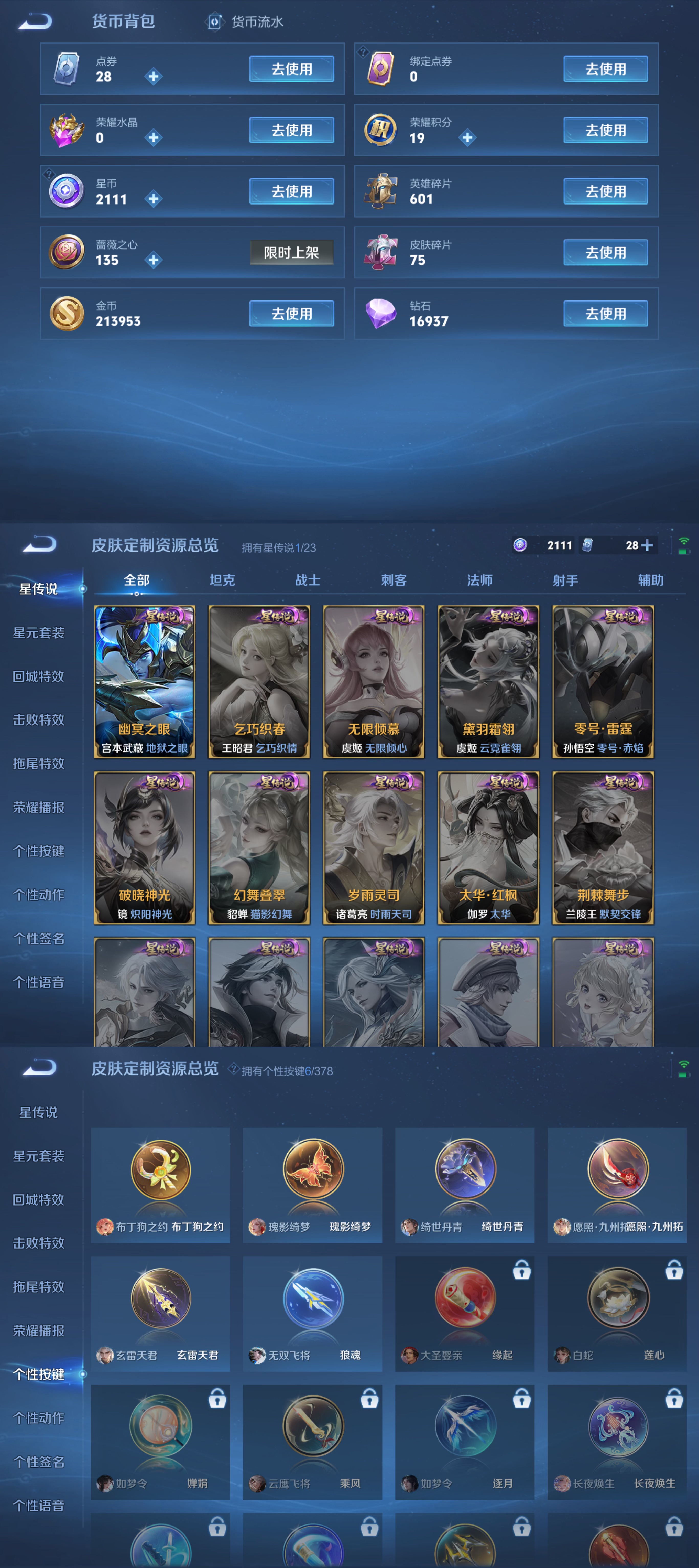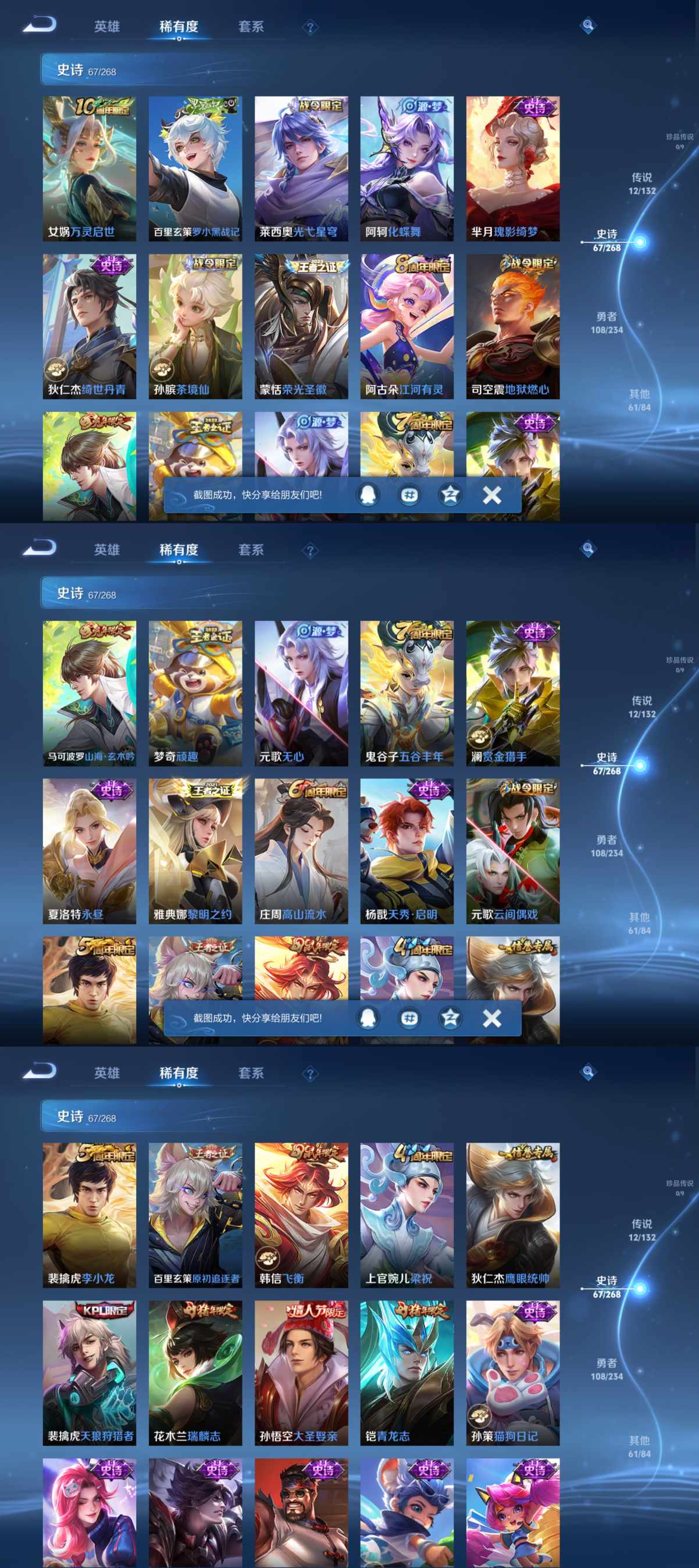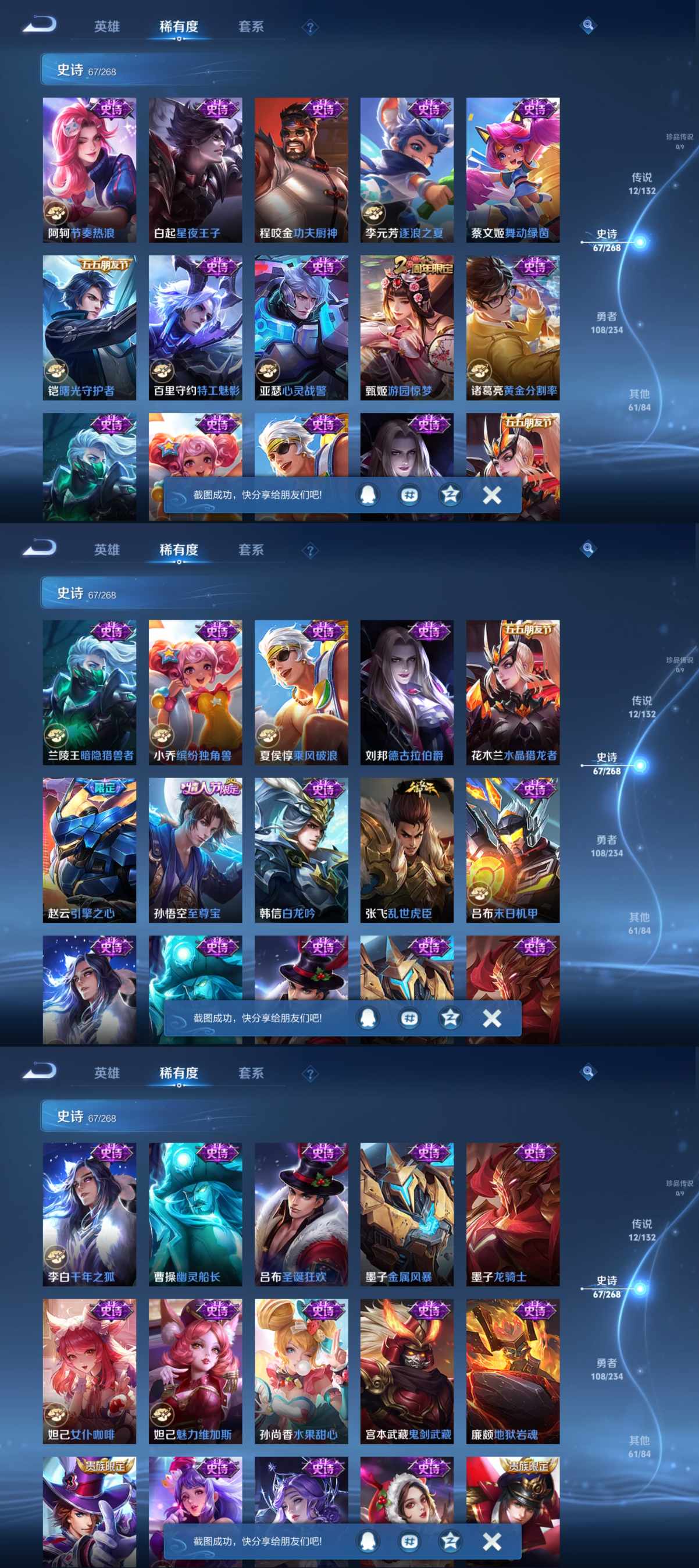 贵族等级:v7皮肤数:249传说品质12 生肖限定8 情人节限定2 荣耀典藏1 英雄数:126
