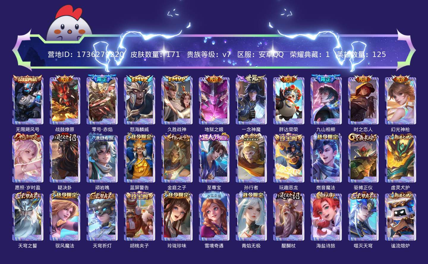 贵族等级:v7皮肤数:171传说品质11 情人节限定1 荣耀典藏1 生肖限定2 英雄数:125