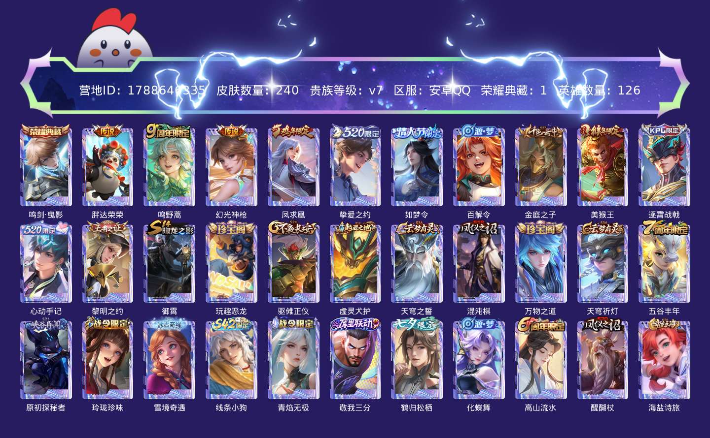 贵族等级:v7皮肤数:240情人节限定1 生肖限定3 传说品质5 荣耀典藏1 英雄数:126