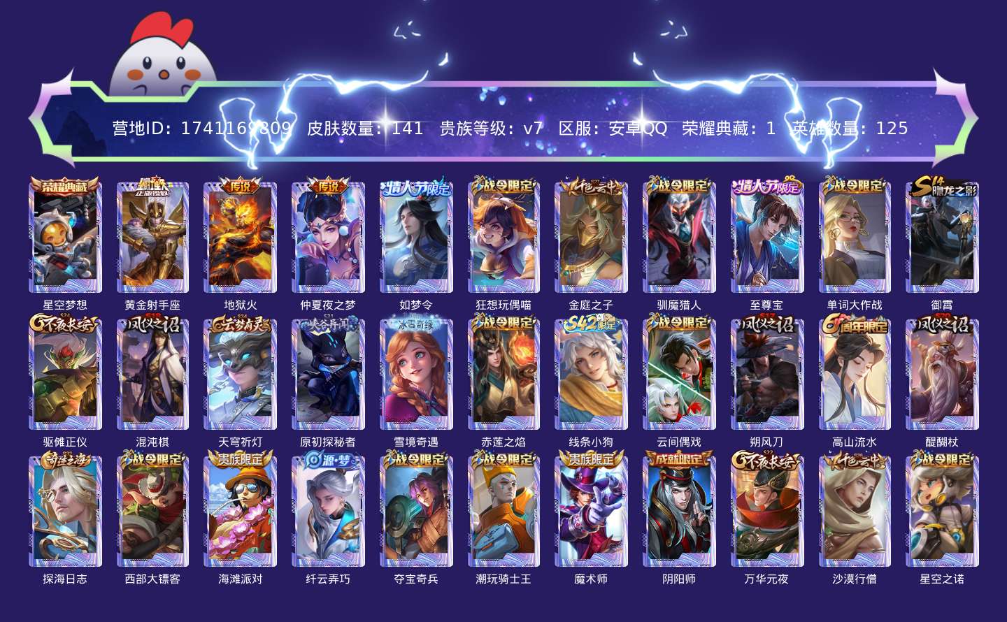 贵族等级:v7皮肤数:141传说品质3 情人节限定2 荣耀典藏1 英雄数:125