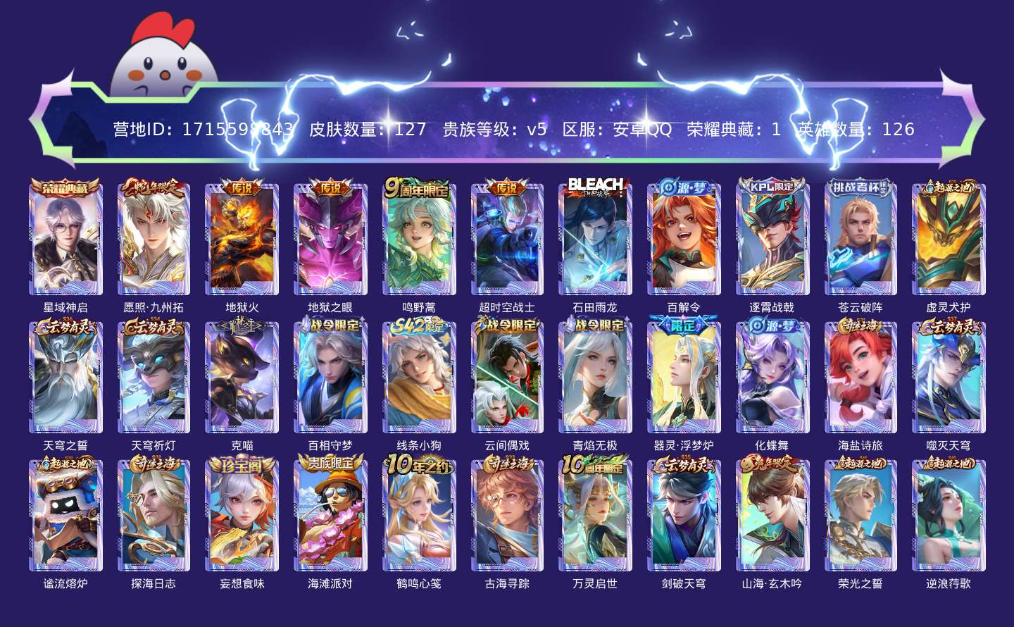 贵族等级:v5皮肤数:127传说品质5 生肖限定2 荣耀典藏1 英雄数:126