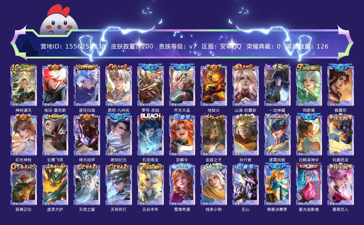 贵族等级:v7皮肤数:200传说品质15 生肖限定2 情人节限定1 英雄数:126