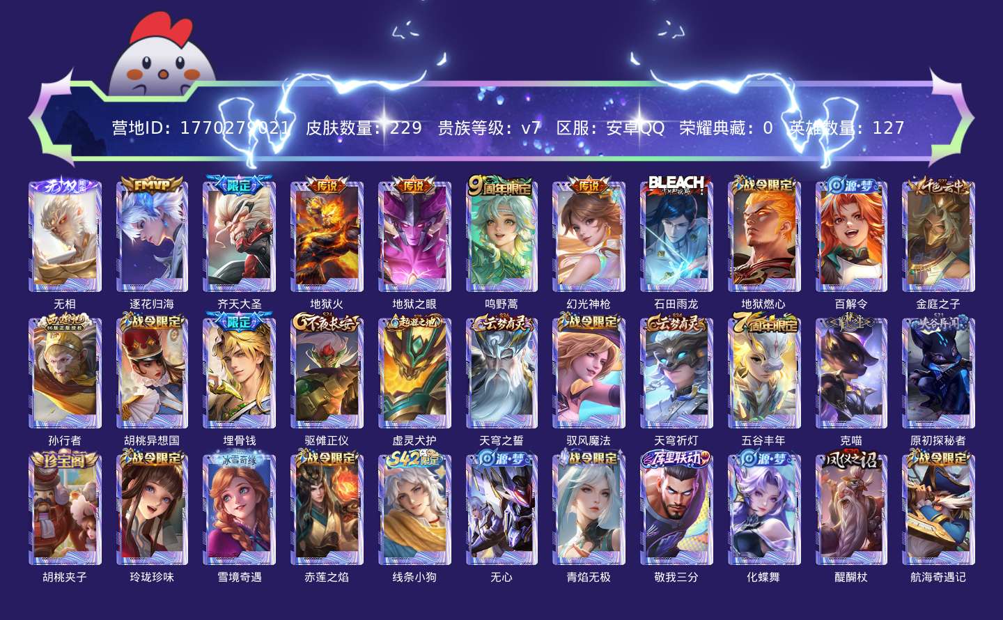 贵族等级:v7皮肤数:229传说品质6 无双1 英雄数:127