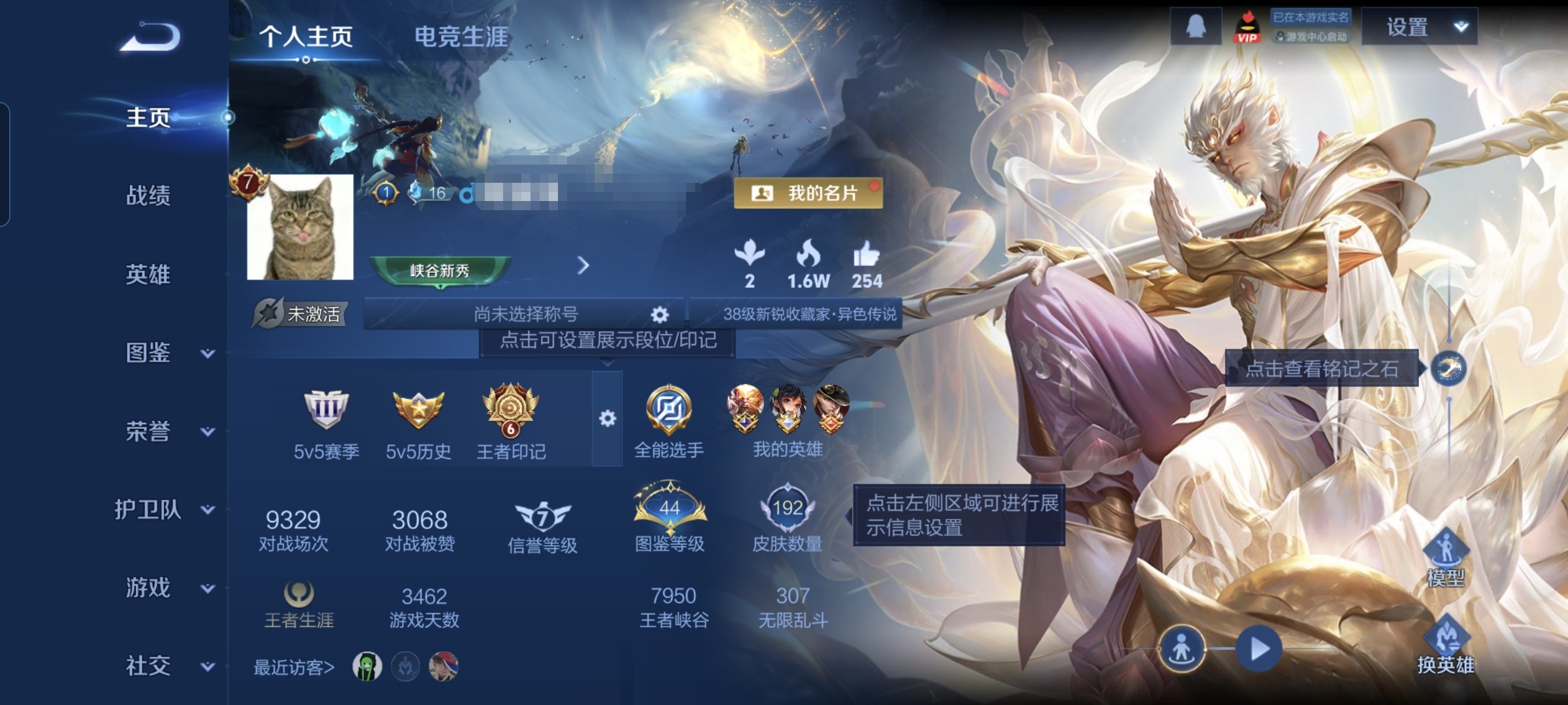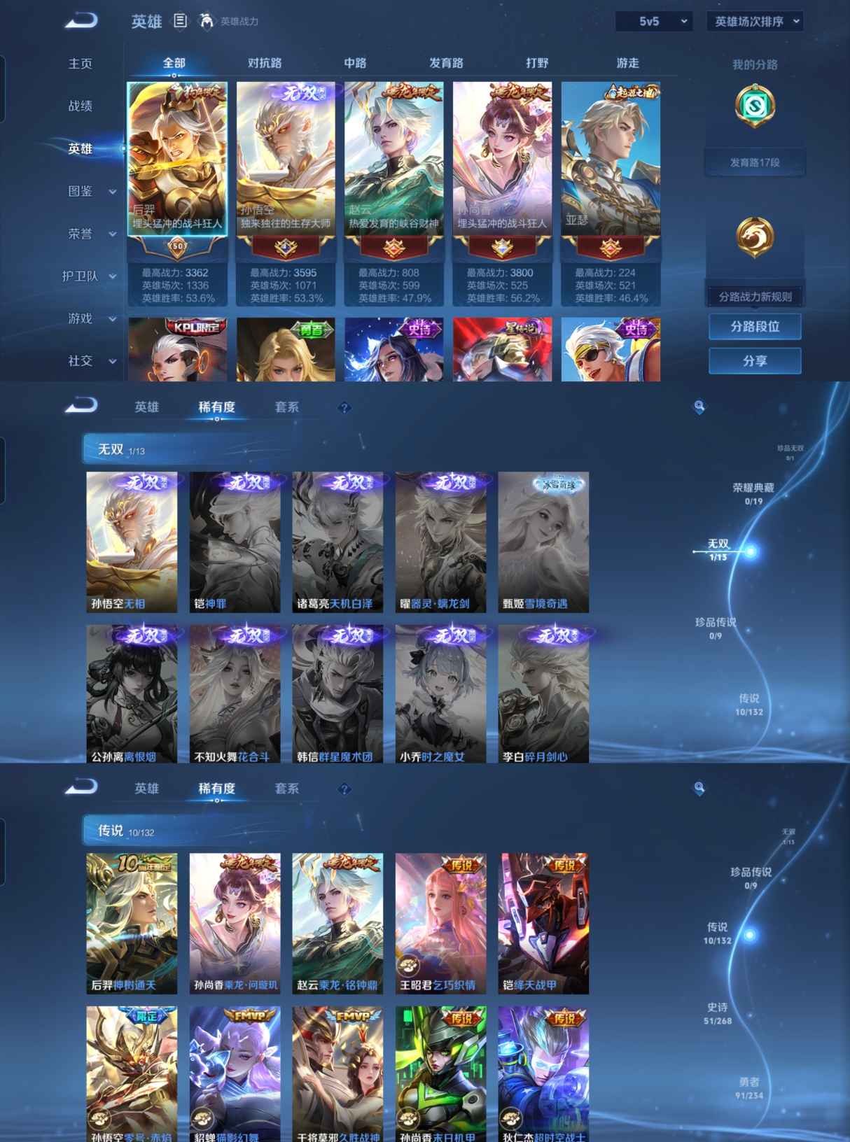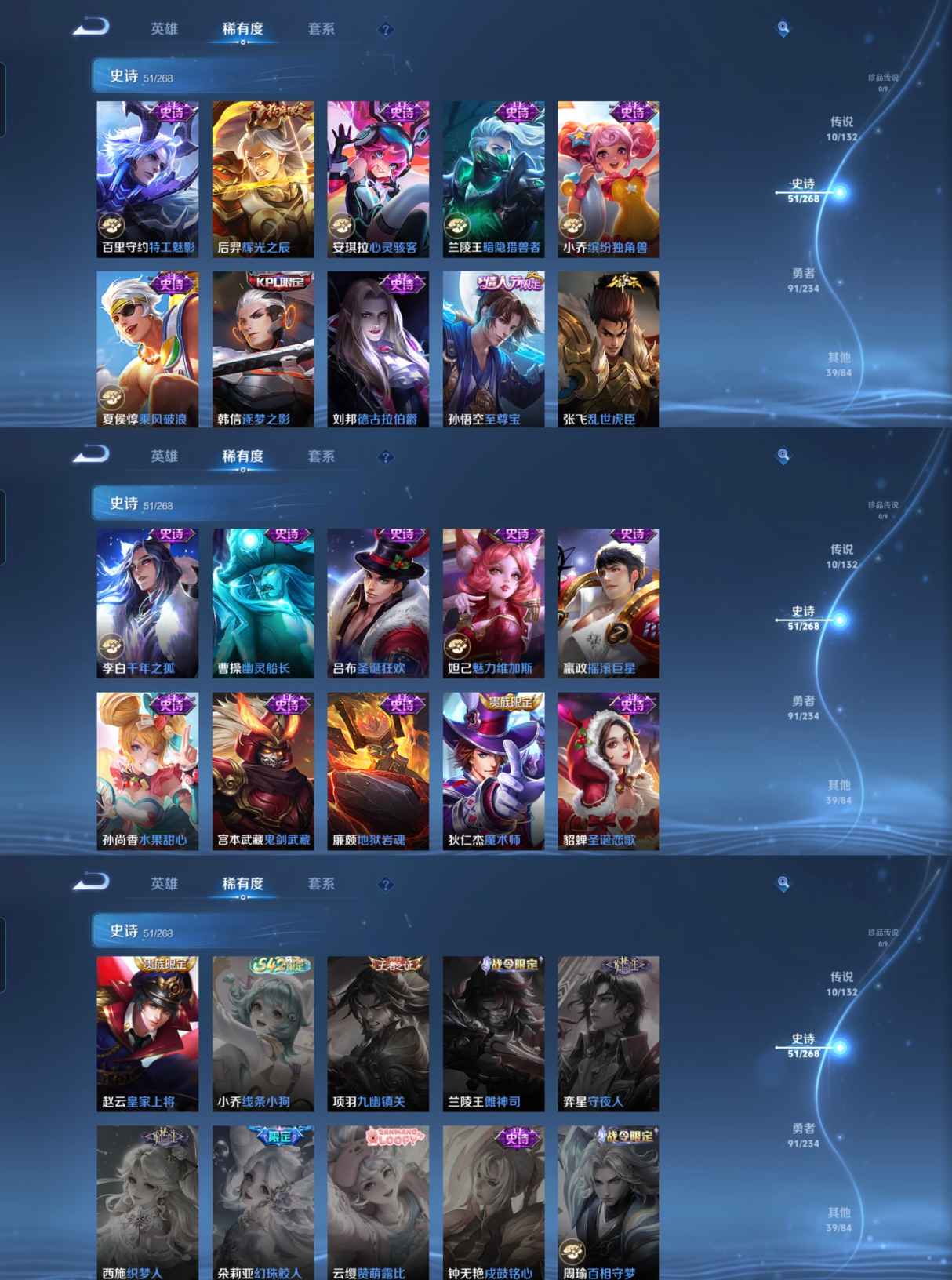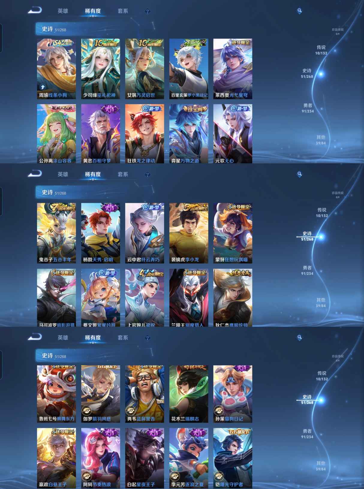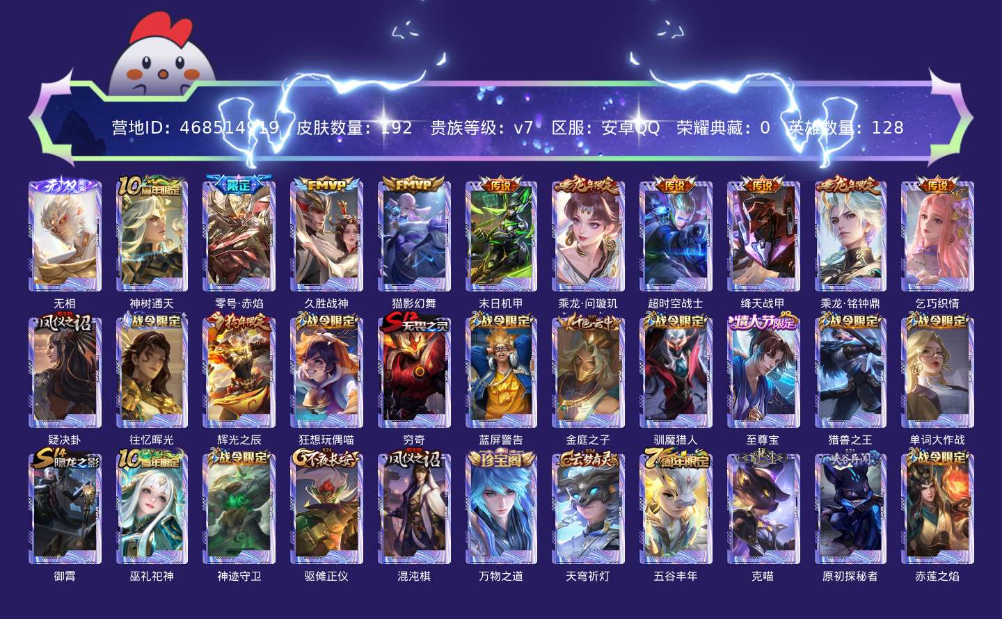 贵族等级:v7皮肤数:192生肖限定4 传说品质10 情人节限定1 无双1 英雄数:128